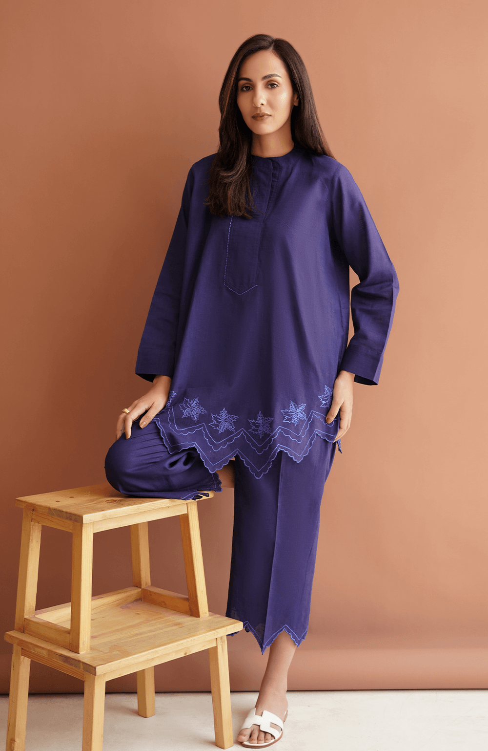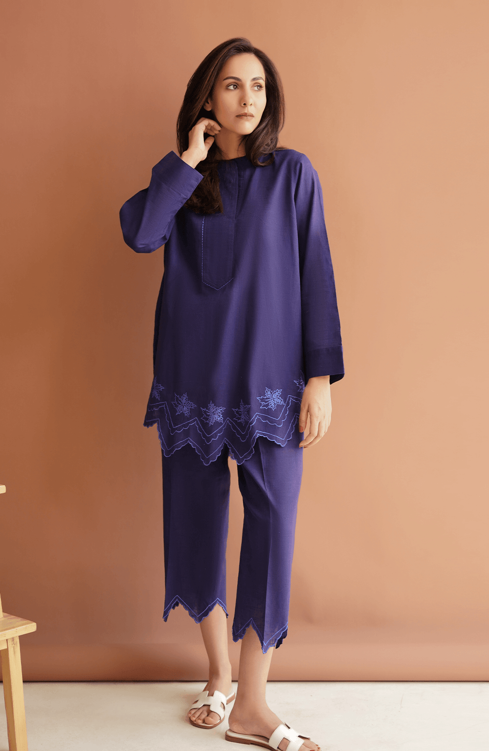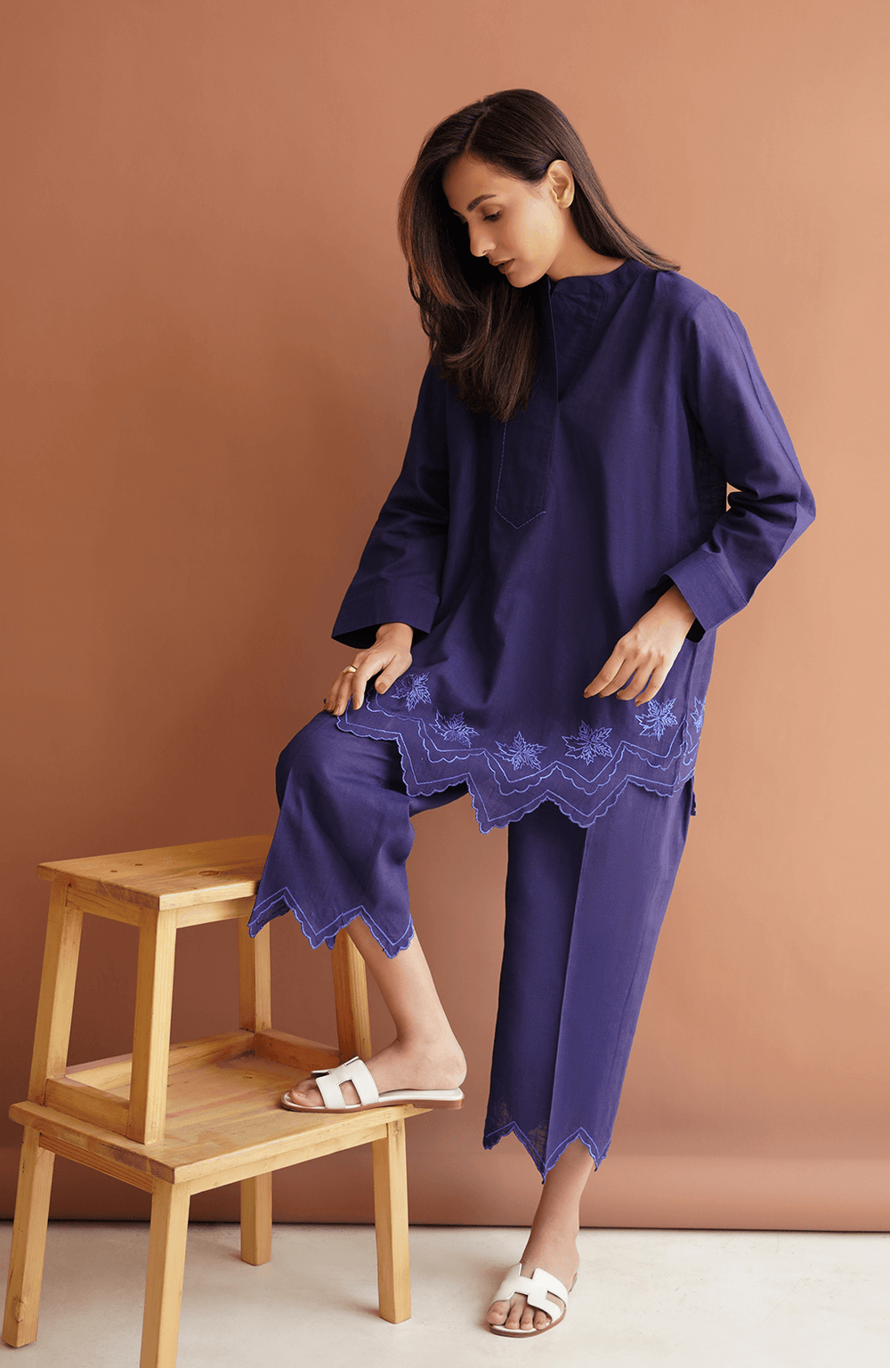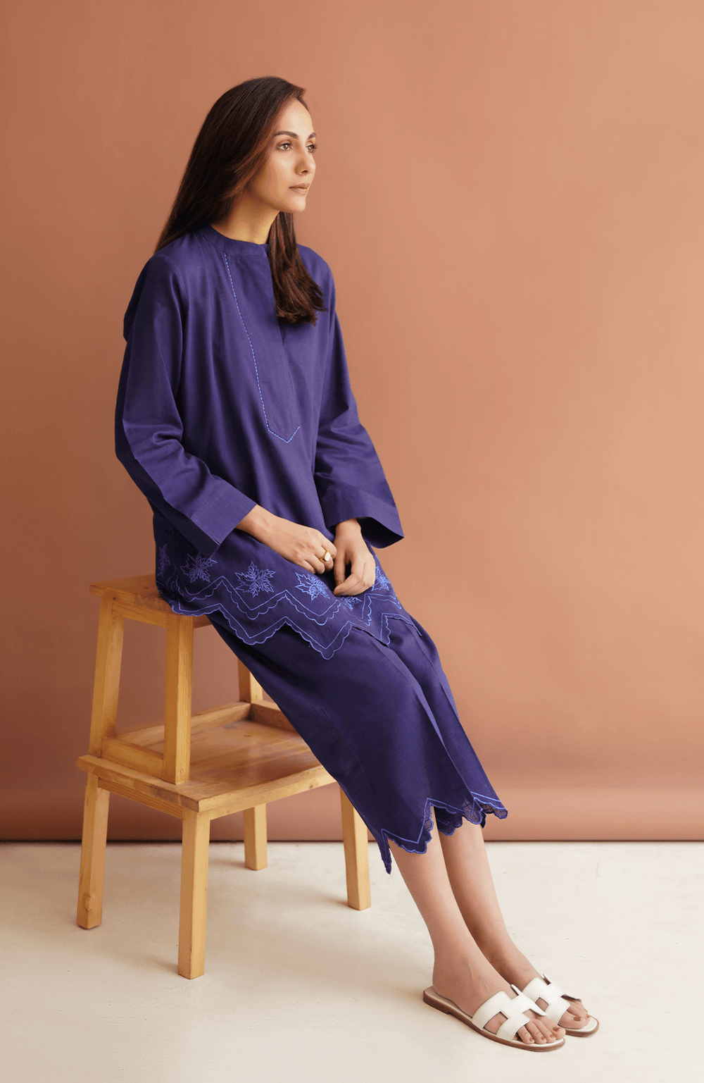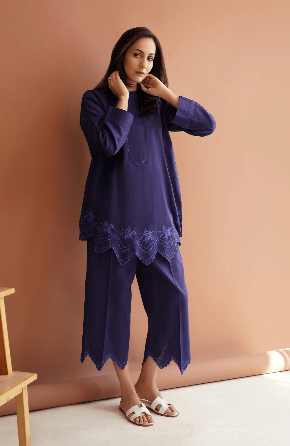 Admiral blue embroidered matching separates with scallops and resham work on the shirts tail. With a rounded hemline, this short shirt is finished with running stitches on the neckline. To complete this set, Admiral Blue comes with machine-embroidered pants for that perfect day-to-night winter look.