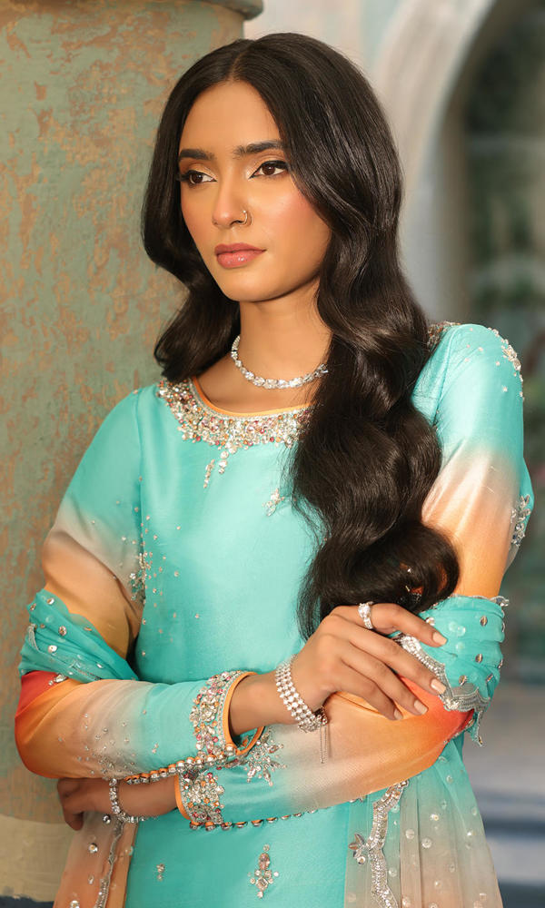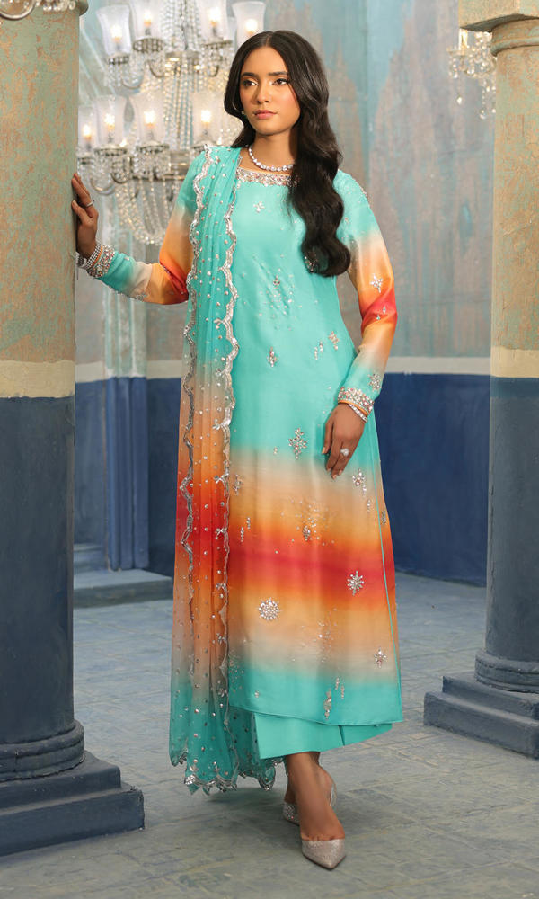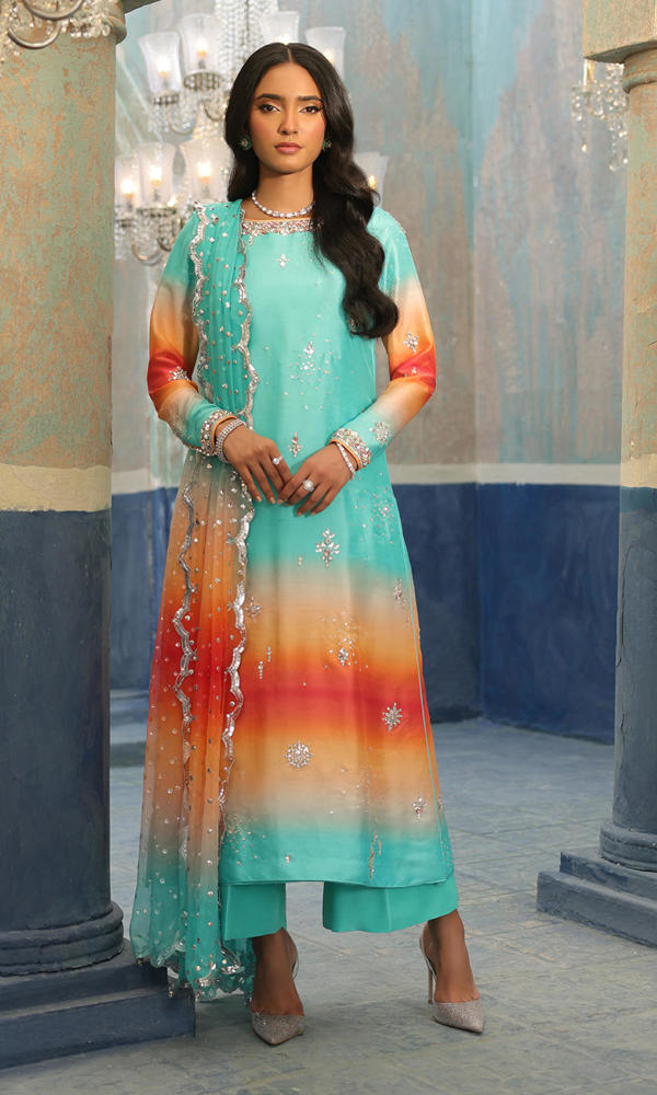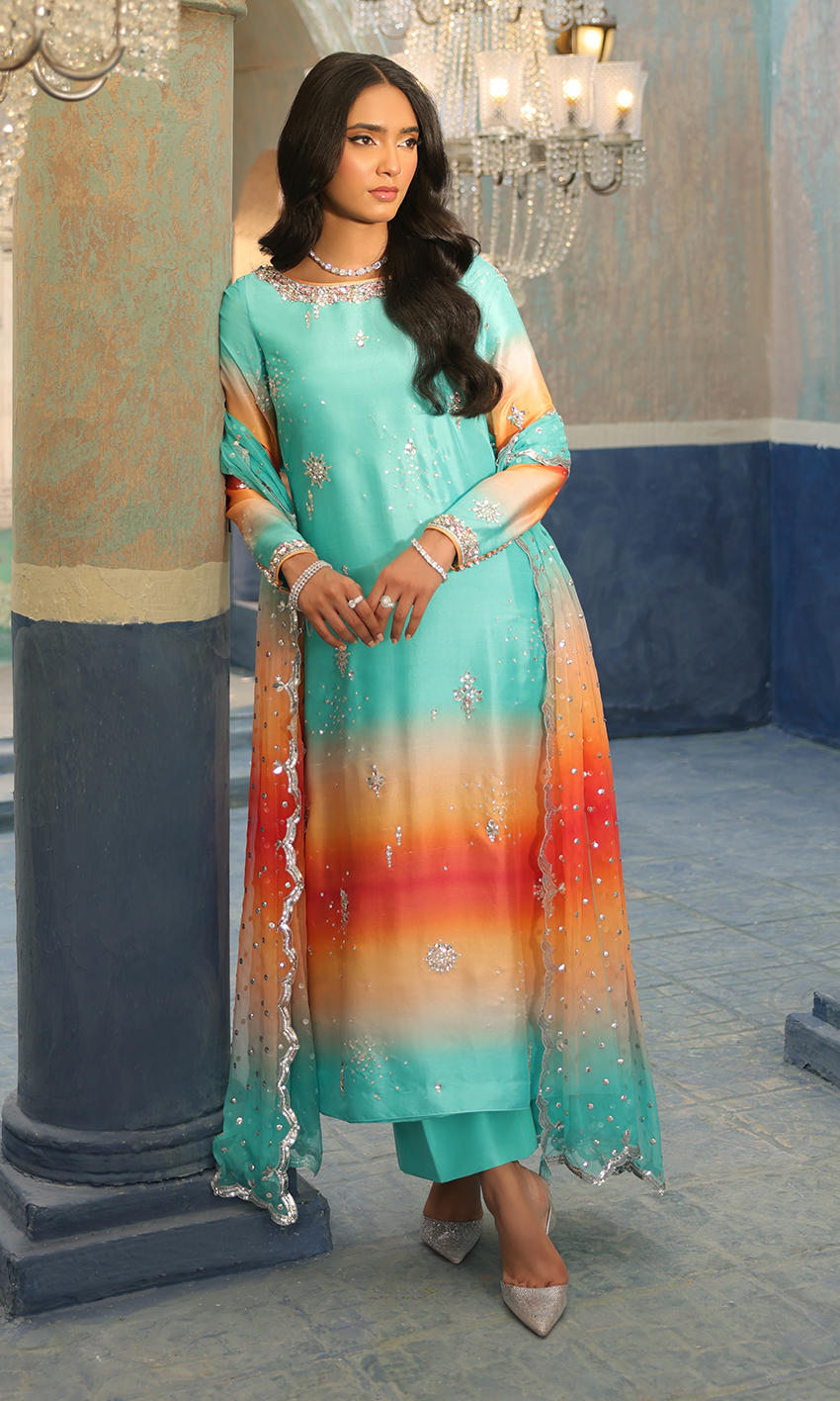 Elegant crystal motifs, a detailed neckline and sleeves border sets this ombre base alight.