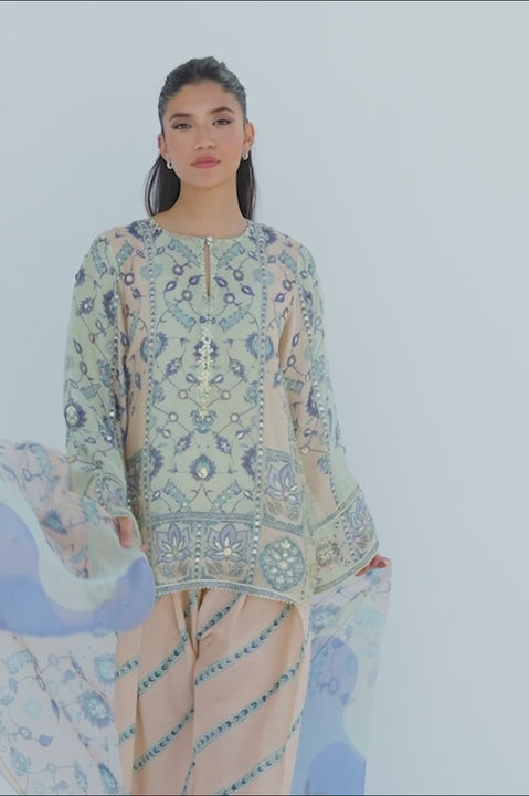 Cool, calm and quietly luxe, this relaxed kurta features intricate sequin and gota embroidery over a printed cotton net canvas in the lightest hues of blush and powder blue. It is paired with a matching pure rawsilk shalwar embellished with delicate sequined vines, and a diaphanous organza dupatta that flows in a dreamy blend of powder blue, azure and blush.