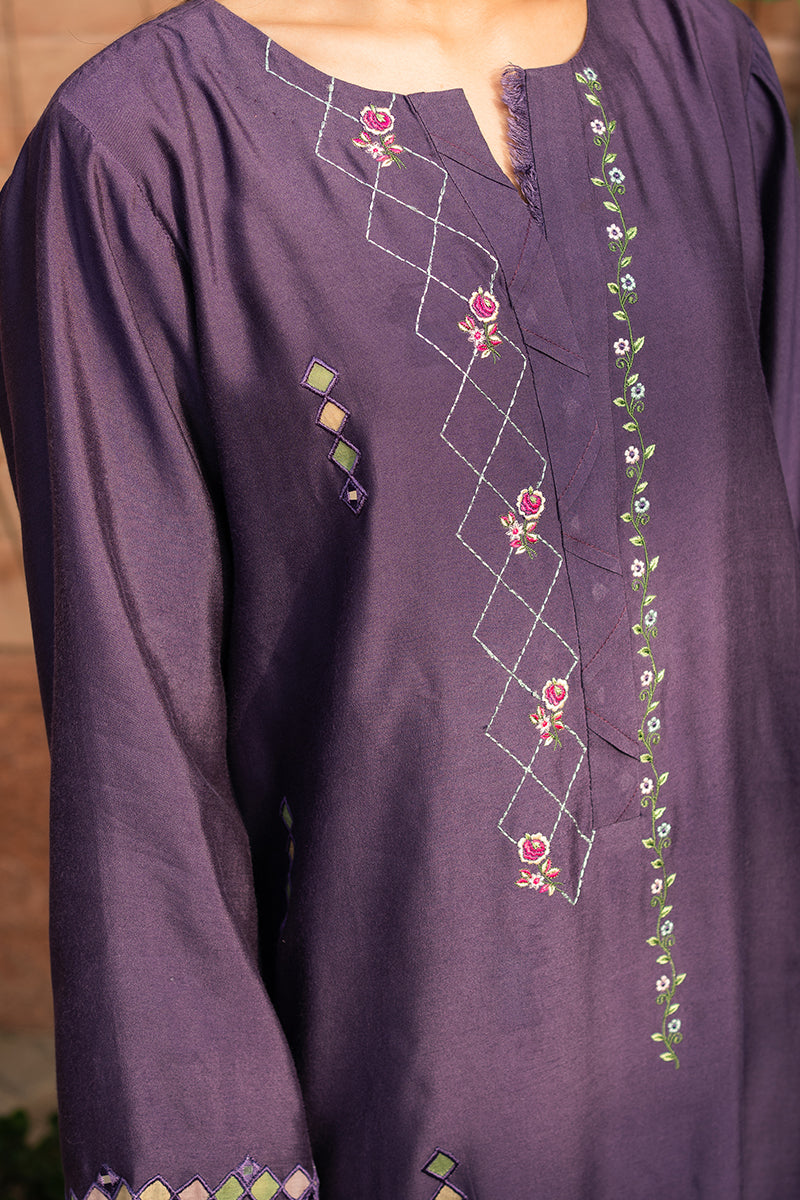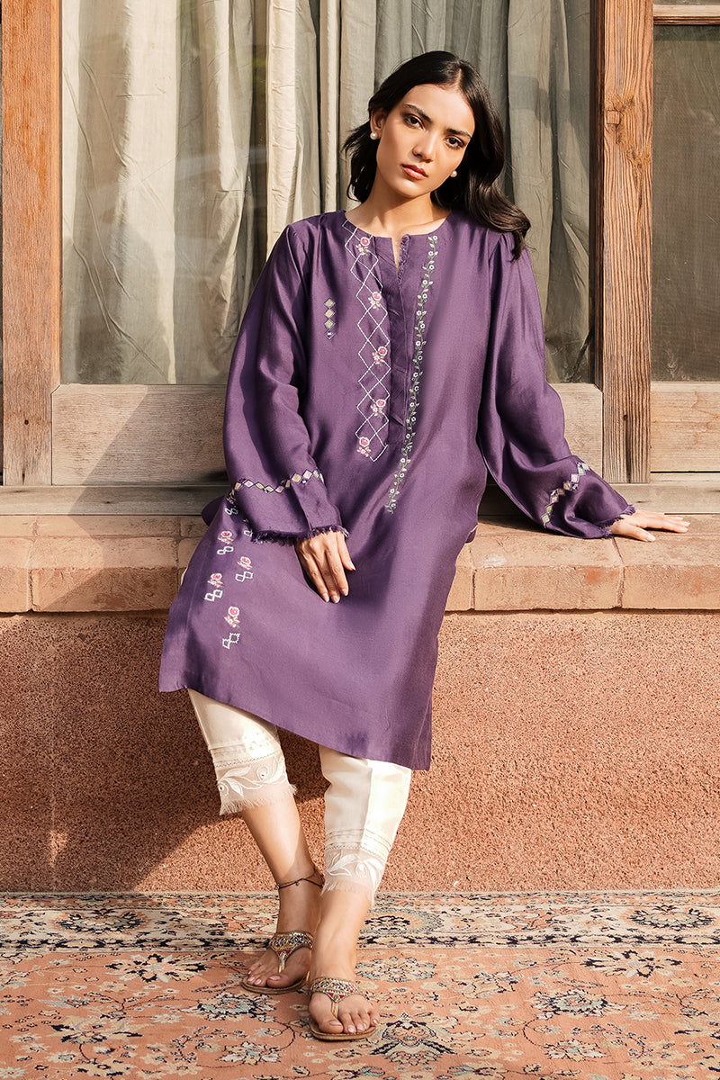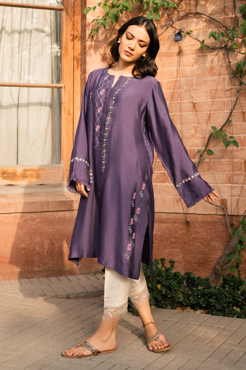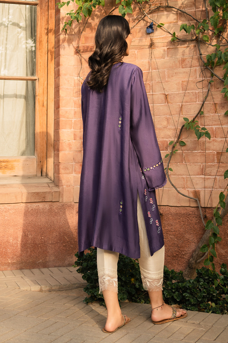 This purple grape kurta features machine embroidery and applique work. The round neckline with kurta patti and sleeves are adorned with textures and shredding to complete the look. Our Alannah...