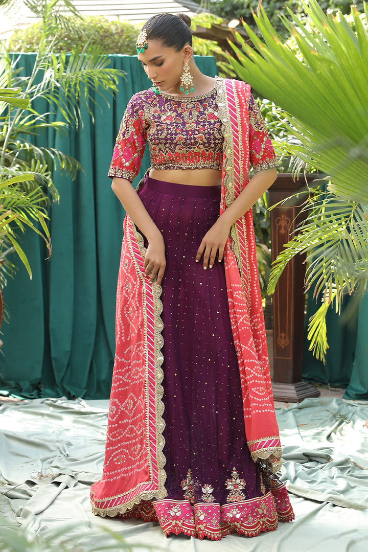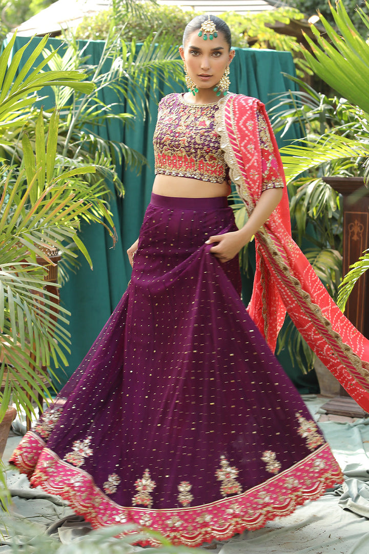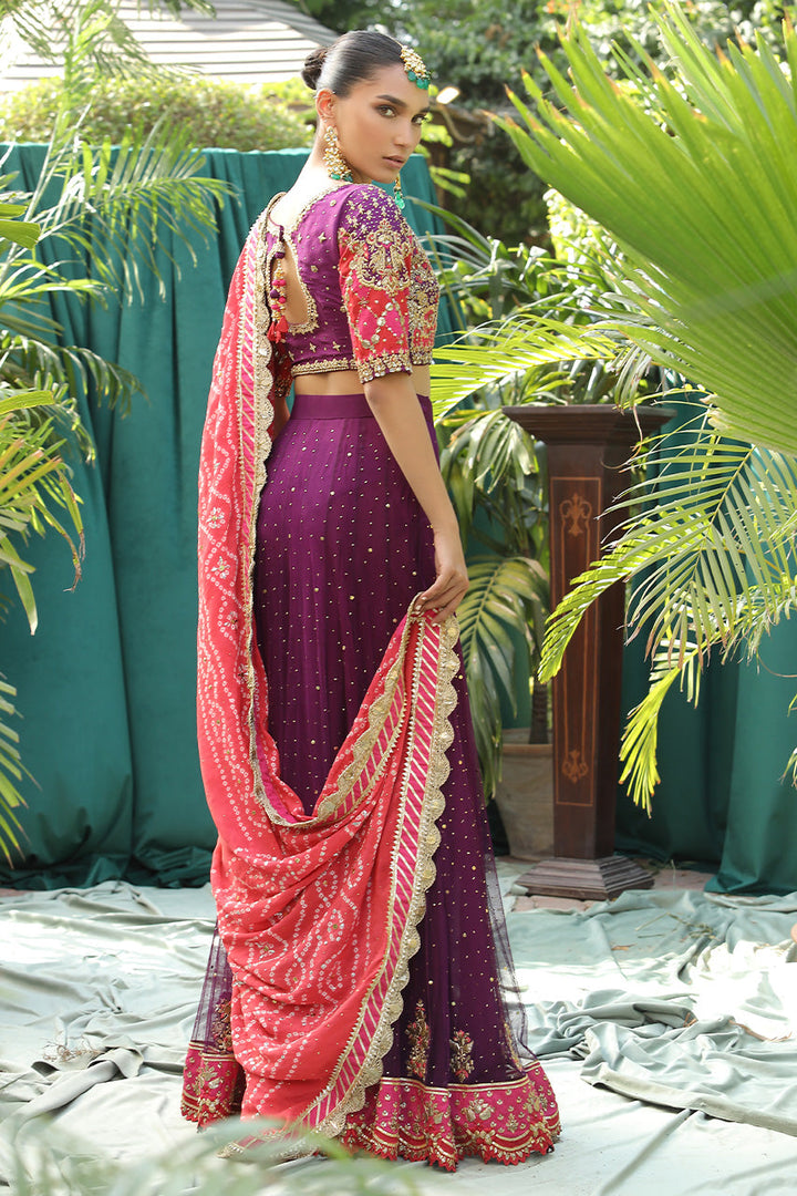 Once in a while, a pop of colour is all we need to lift our spirits and shine through the festive season. This deep purple choli is accentuated with qora-dubka work and is paired with a heavily worked net lengha. It is beautifully complimented with a chunri dupatta to bring in all the traditional feels.