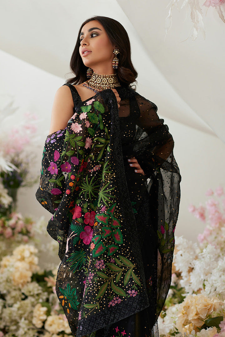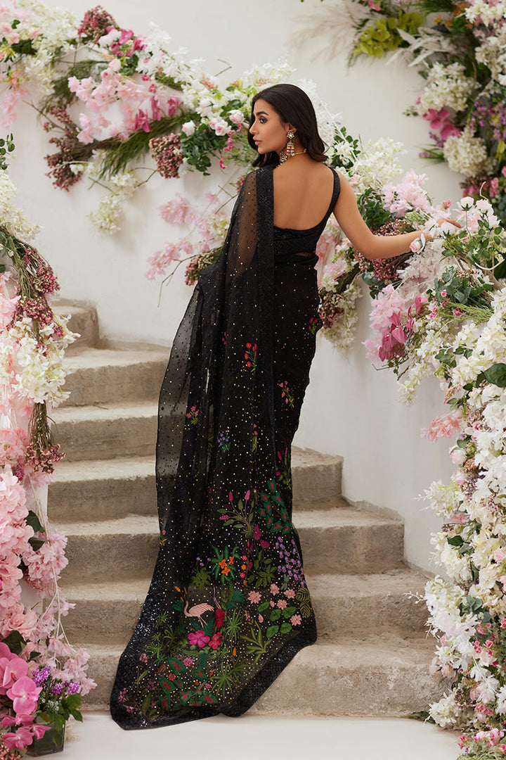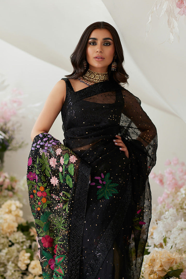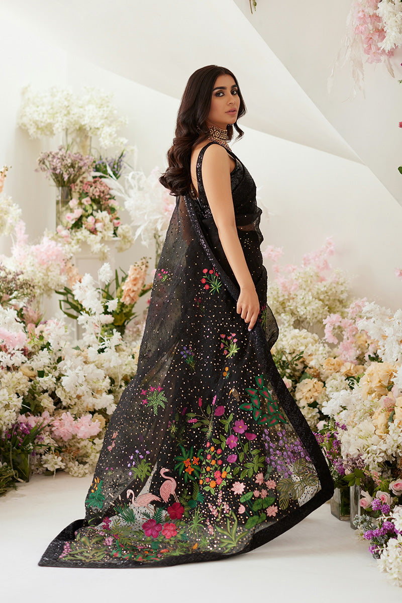 Colorful, elegant and glamorous. This floral saree is covered in delicate kaam with botanical embroideries. You can purchase this as a stitched saree or unstitched saree.