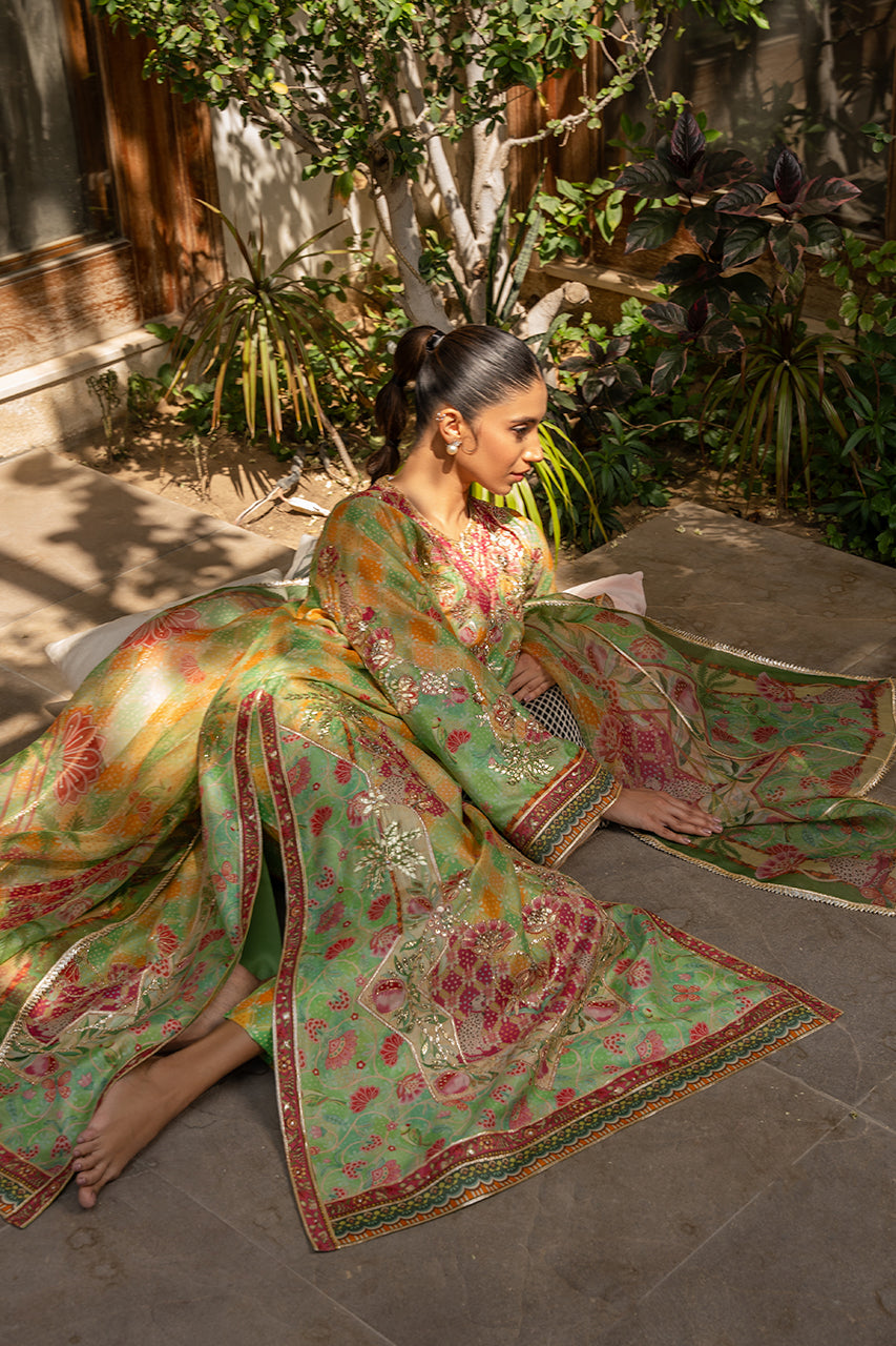 Composed with vibrant tones on a khaddi silk canvas, the kurta is adorned with delicate printed floral imagery and features fabric manipulated details. Paired with a painterly printed medium silk dupatta and printed raw silk trousers.