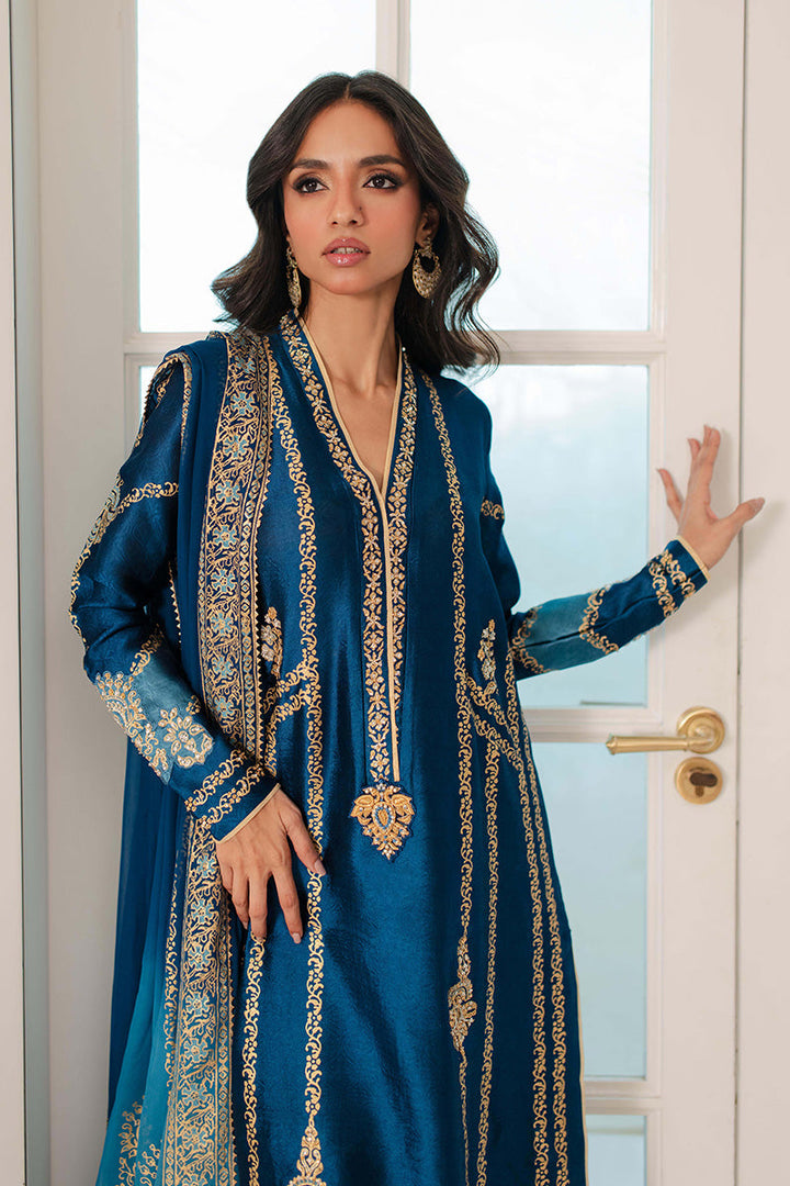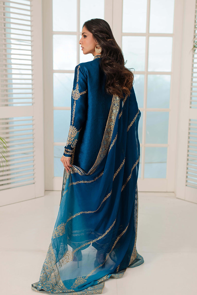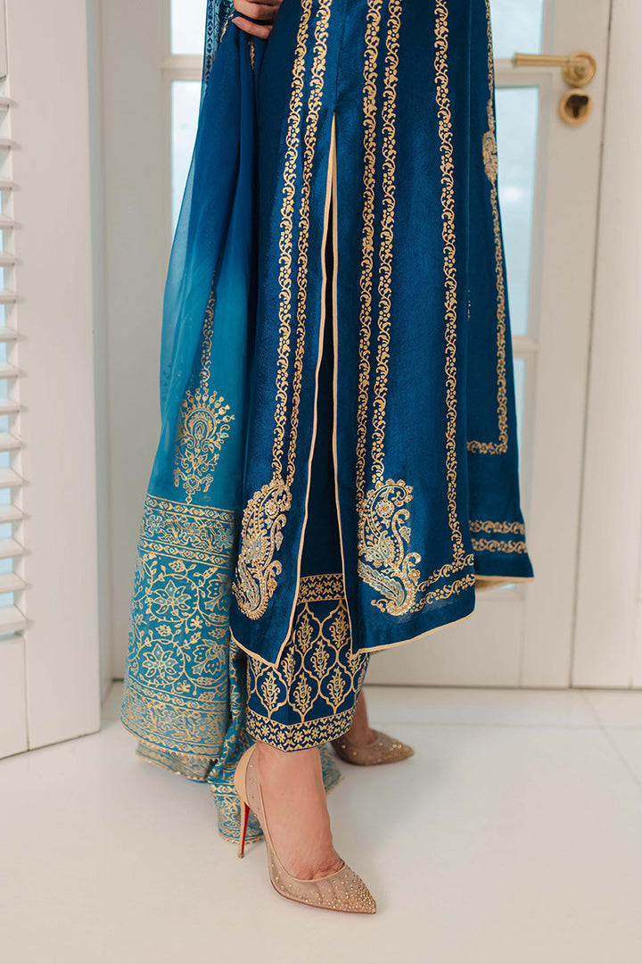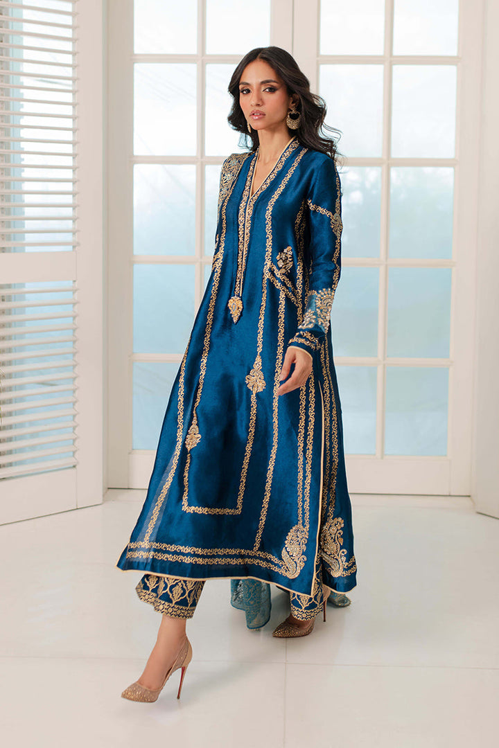 Look regal in royal blue! This outfit features gilded gold block print with zardozi motifs on the bodice and sleeves. The outfit is completed with a bold block print on...