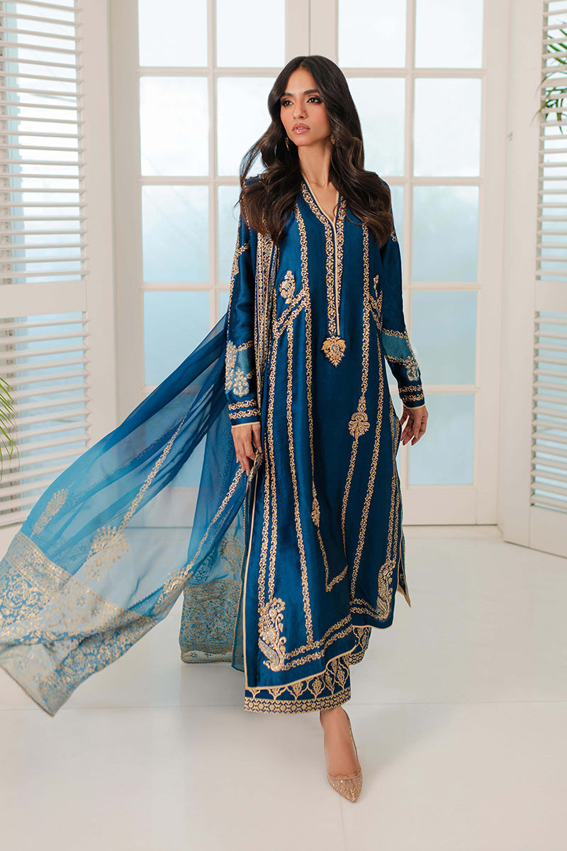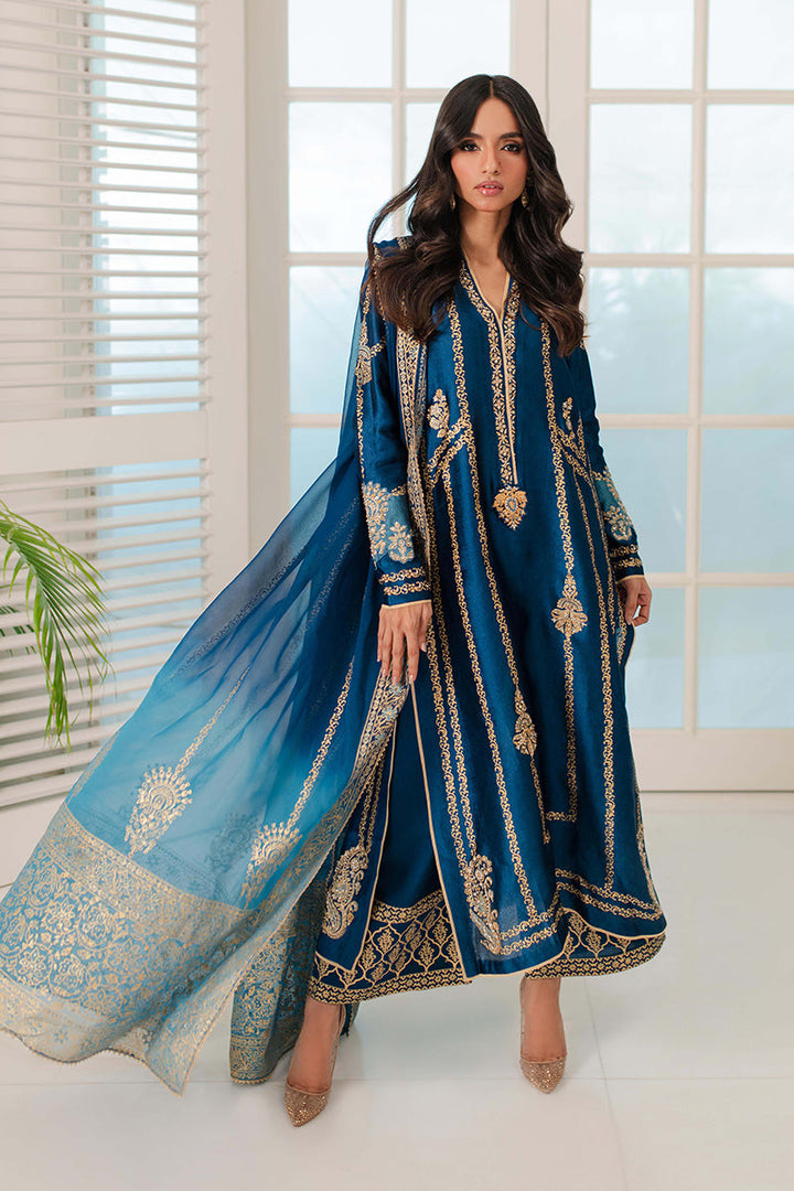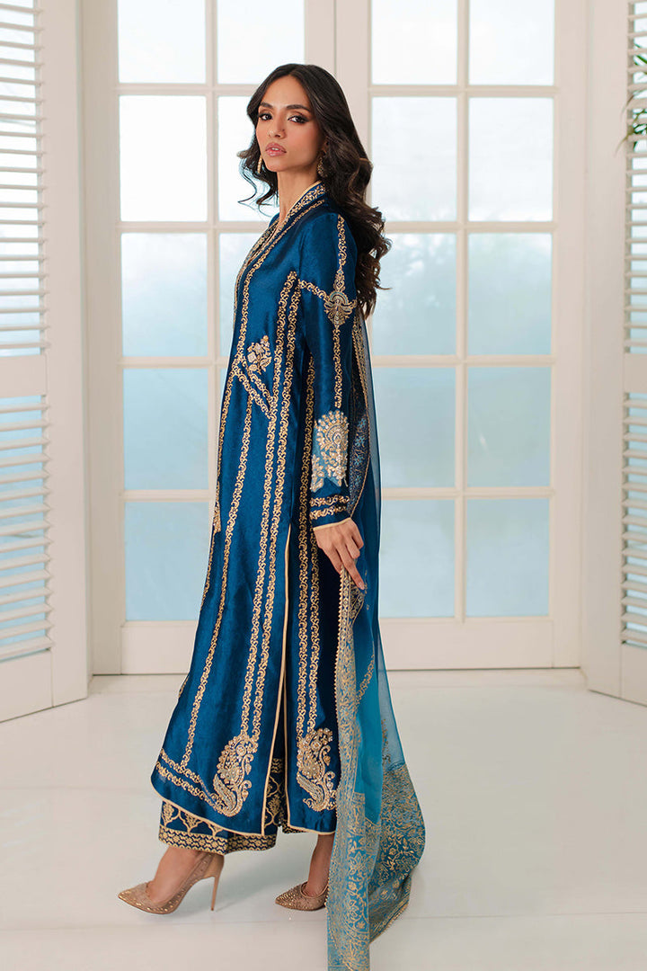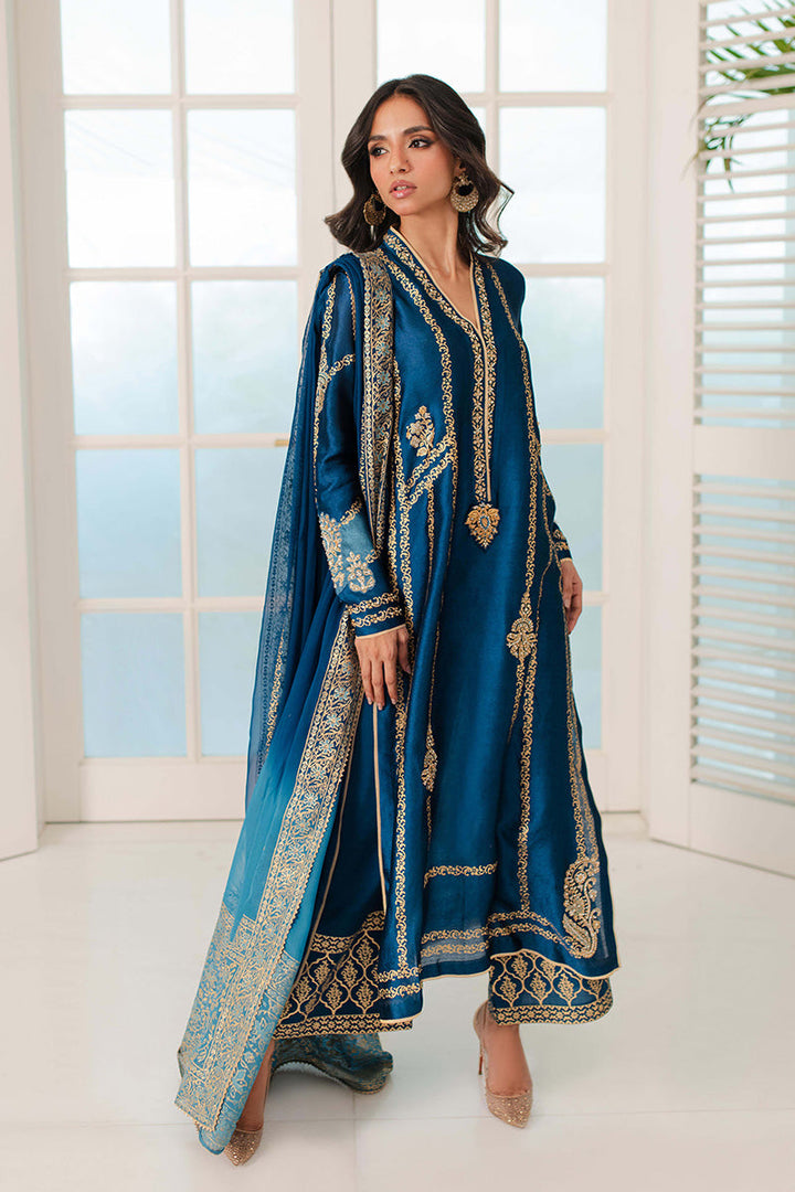 Look regal in royal blue! This outfit features gilded gold block print with zardozi motifs on the bodice and sleeves. The outfit is completed with a bold block print on...