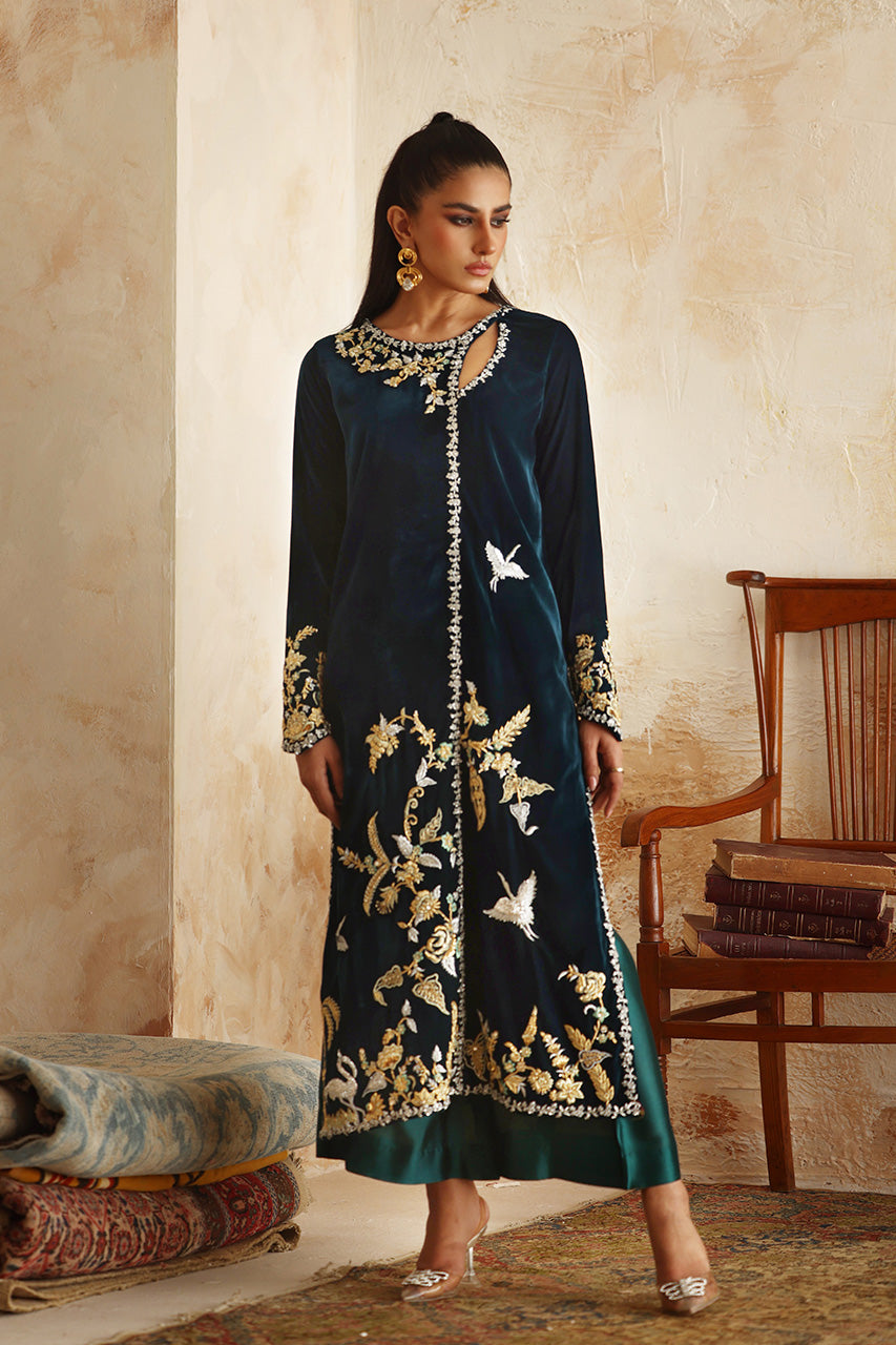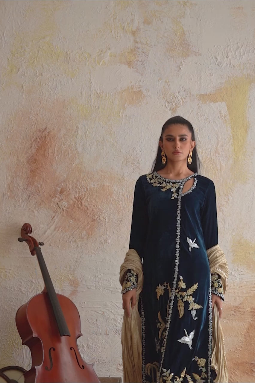 Celebrating our rich heritage with our jewel tone velvet, this rich teal silhouette with a classic angarkha cut and keyhole is a sight to behold. Ganga jamni zardozi and hints of resham make the ensemble indulgent and festive over a pair of matching silk culottes. Add a classic gold crusshed dupatta for all the regal feels this Winter