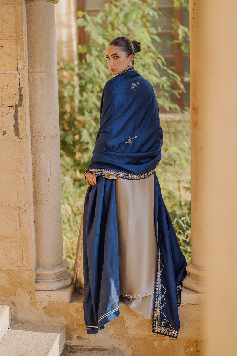 This sophisticated Festive Formal Collection outfit includes a straight mesuri shirt with full fitted sleeves, detailed with mirror work, kora dabka, zardozi, and embroidered buttons. Paired with a pure lama Dhaka pajama featuring stone work, the ensemble is completed by a blue self-jamawar shawl adorned with machine embroidery, cut work, kamdani, rexine, and zardozi for a rich, textured finish. This piece elegantly blends tradition with modern luxury.