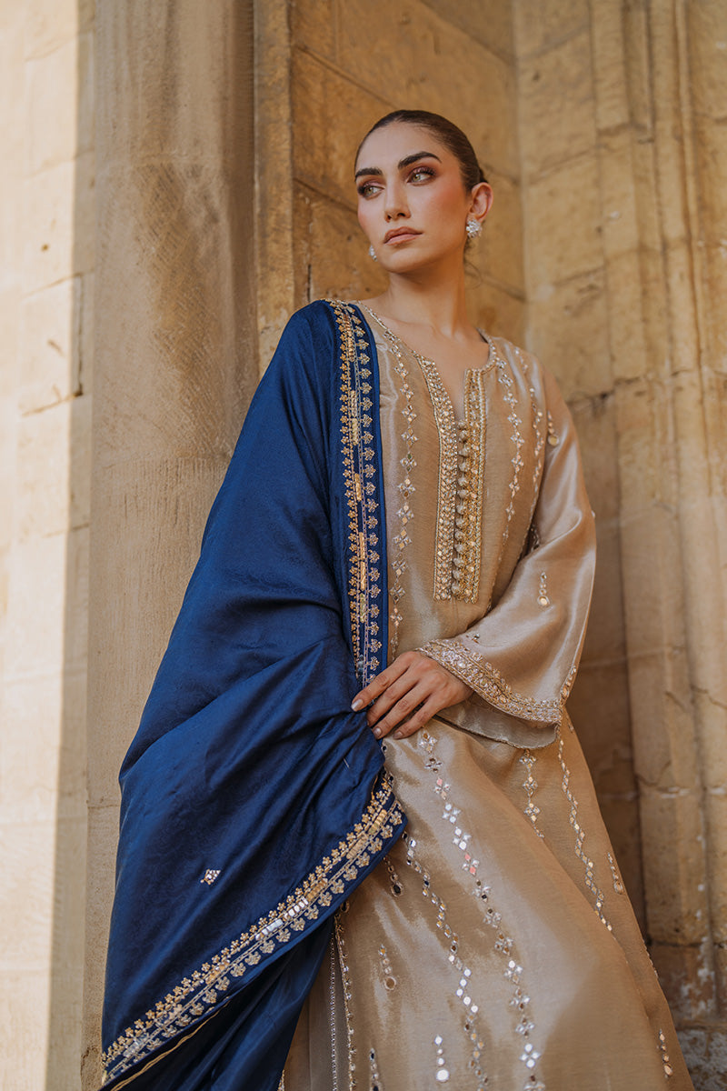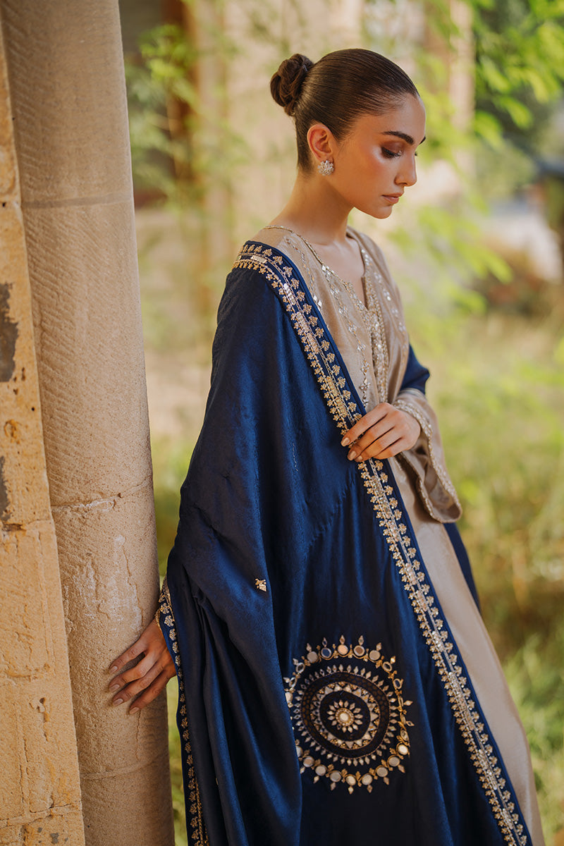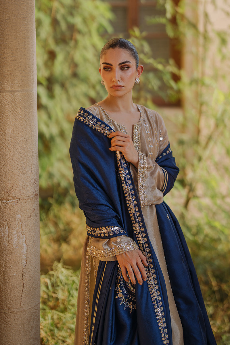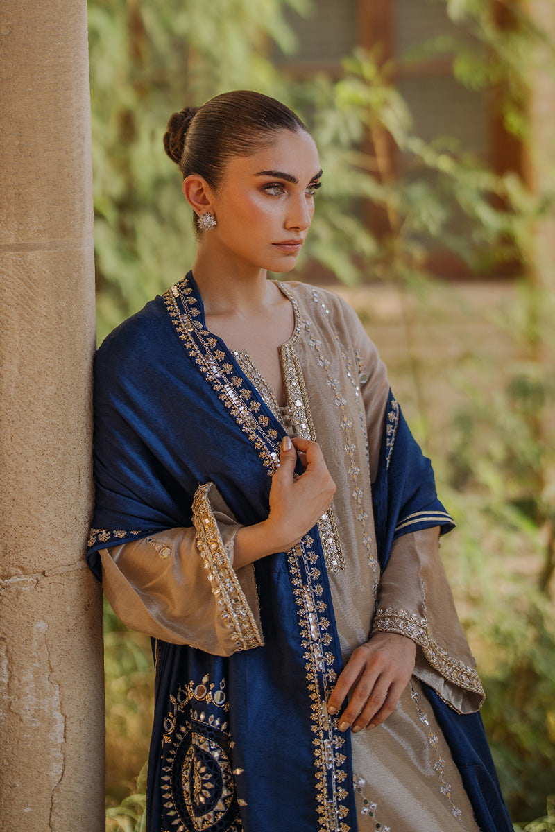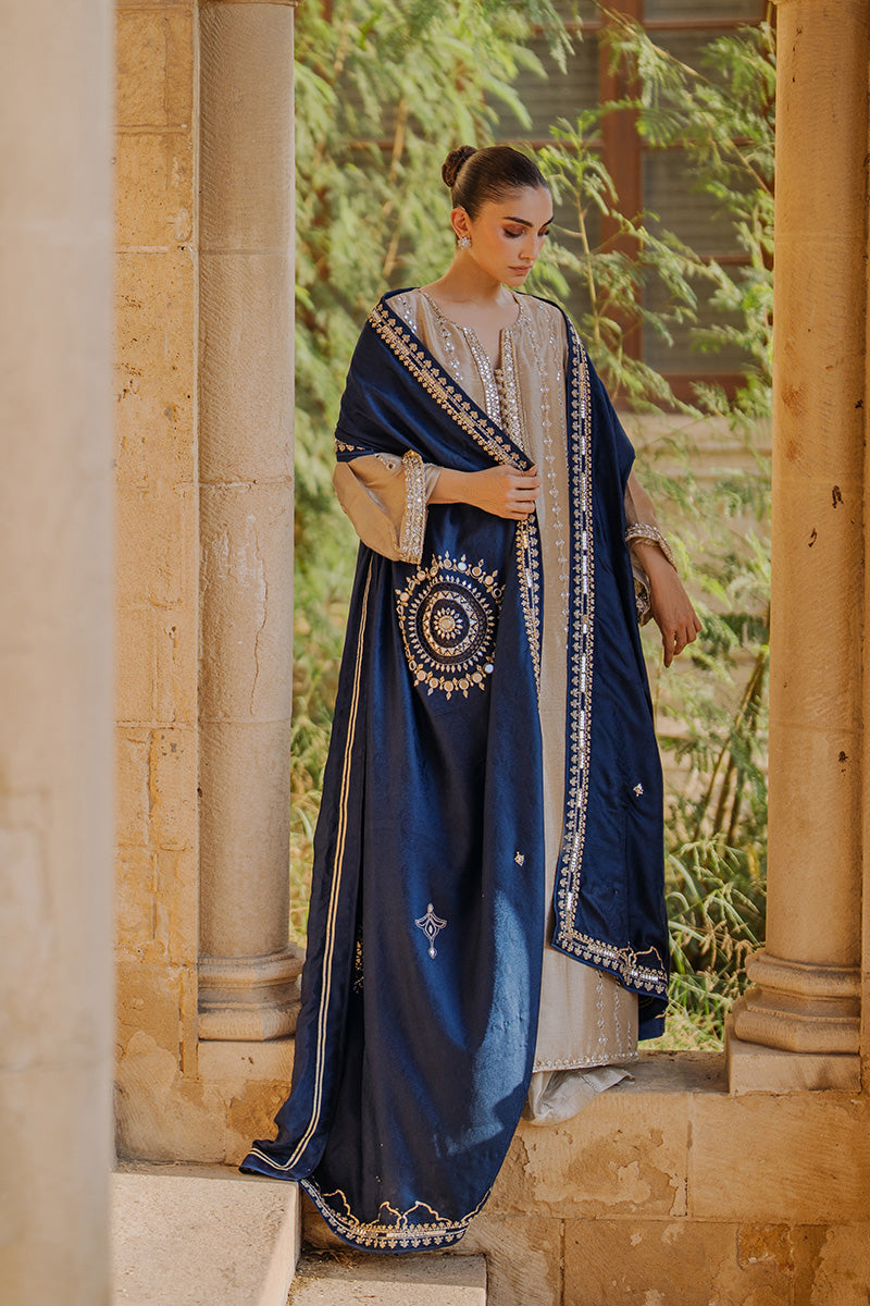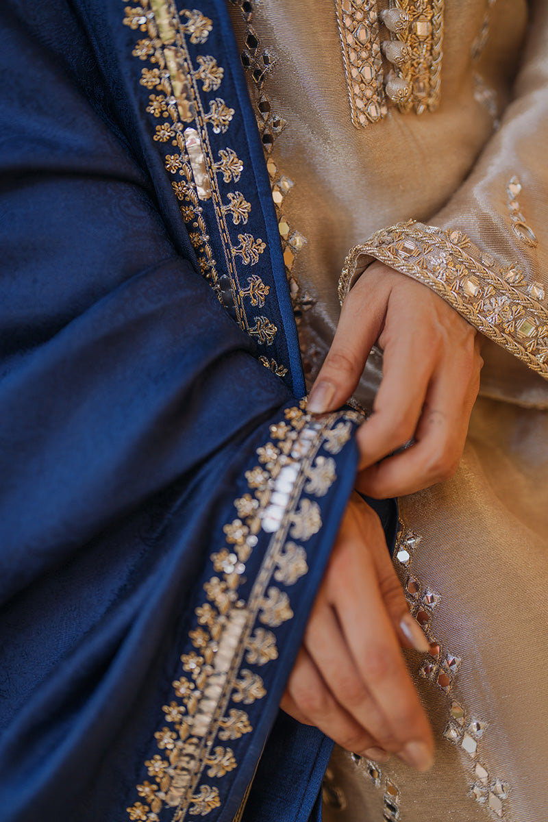 This elegant blue self-jamawar shawl features machine embroidery, cut work, kamdani, rexine, and zardozi, blending traditional artistry with modern sophistication for a timeless accessory.