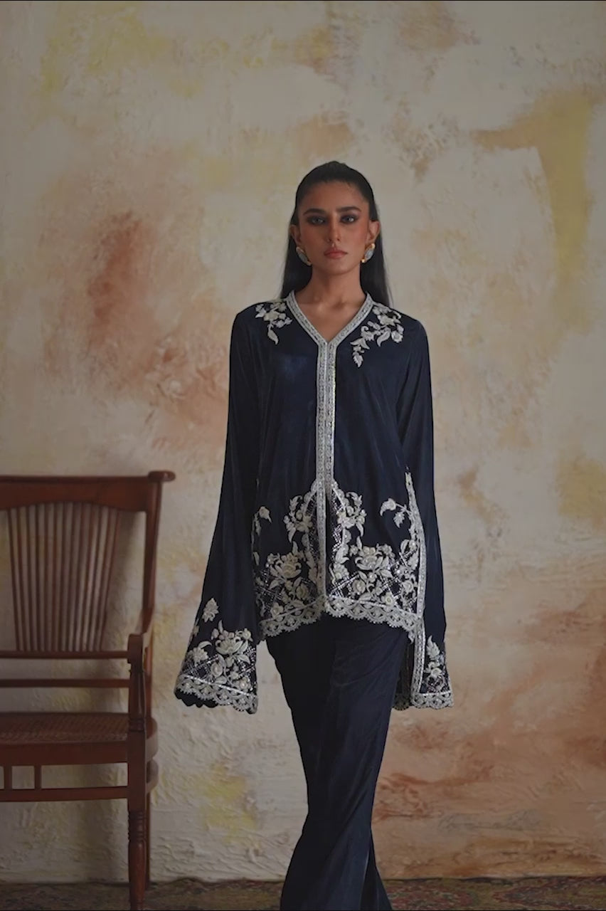 Exuding a sense of sophistication that transcends trends, the zardoze and resham meticulously embroidered daaman and dramatic bell sleeves take centre stage in this blue hued jacket cut from velvet. The rich texture and opulent appearance of velvet is amplified with kaamdaani alongside handwork. Paired with a matching velvet boot cut pant for an effortlessly festive feel.