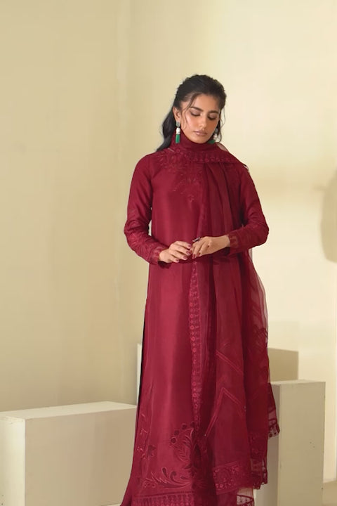Stun in this burgundy outfit with applique embroidery details. The border on the shirt features delicate floral lasercut work. The outfit is completed with a matching dupatta with floral embroidery...