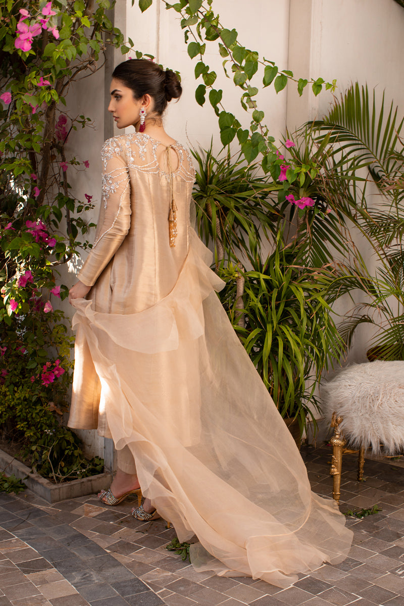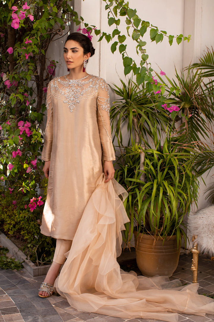 This gorgeous ensemble in a shimmery gold hue is going to be your perfect solution for all special occasions. The neckline is accented with unique silk thread work and hand embellished shimmering crystals, dabka nakshi and pearls, make this an absolute must have! Paired with a beautiful organza ruffle dupatta and matching pants as shown here.