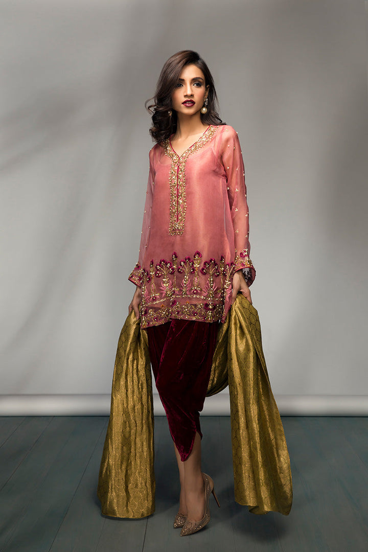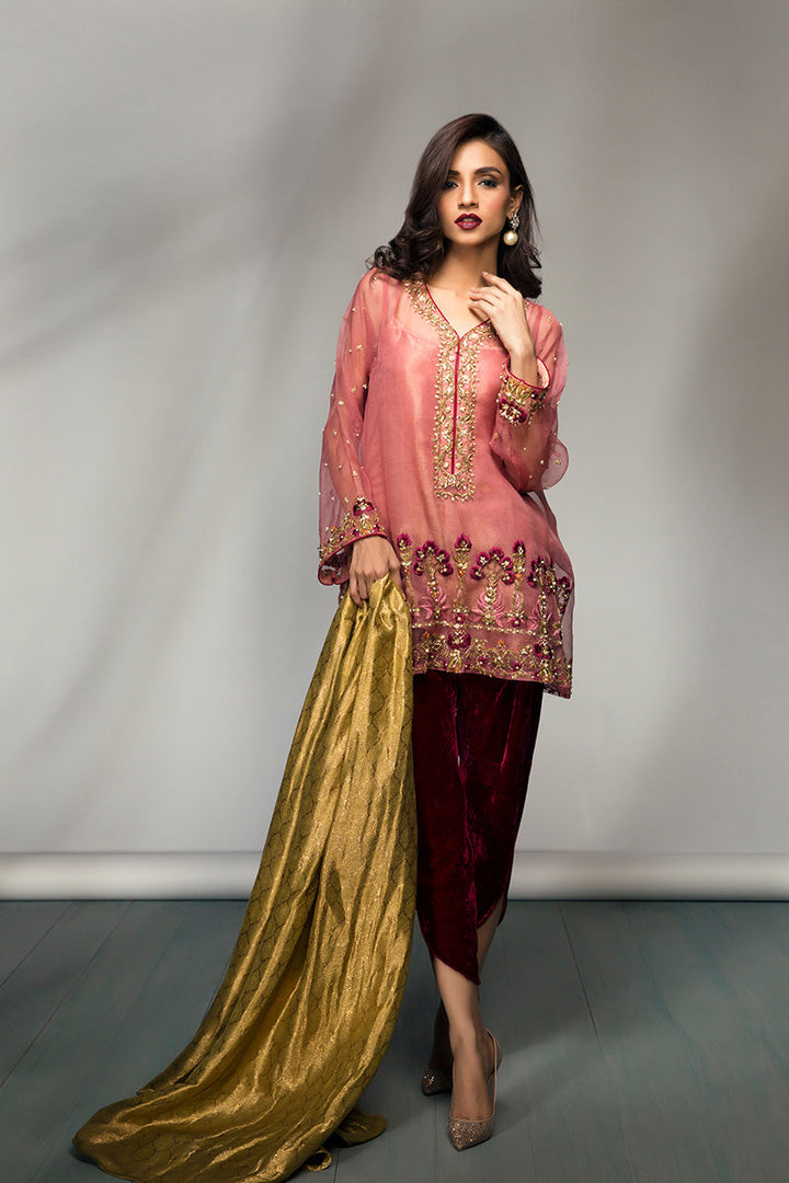 Exude radiance as you dazzle in this classic chai pink kurta with exquisite gota work! Comes with deep Bordeaux coloured velvet tulip pants and an olive green jamavar dupatta to add texture...