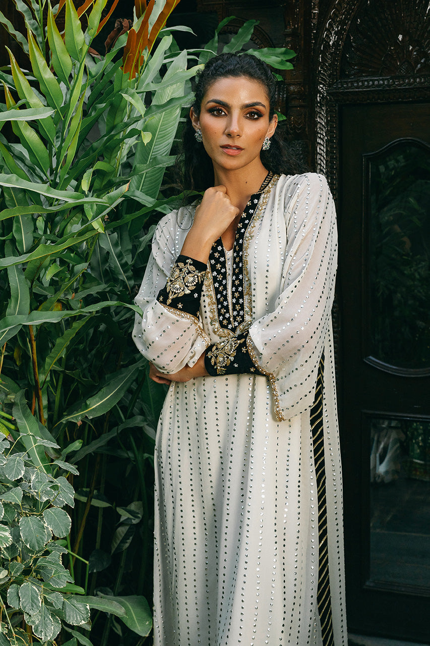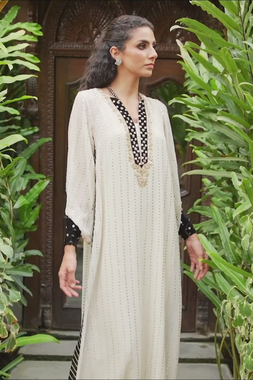 Timeless glamour blends with contemporary design in this gossamer kaftan cut from ivory georgette. The metallic hued kamdani elevates the relaxed silhouette, creating a scintillating play of glistening light. The velvet accents on the neckline and cuffs, intricately embroidered with zardoze and sequins, bring forth the old world charm.