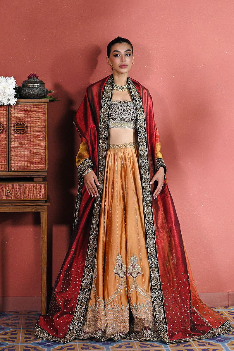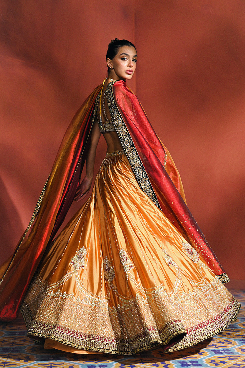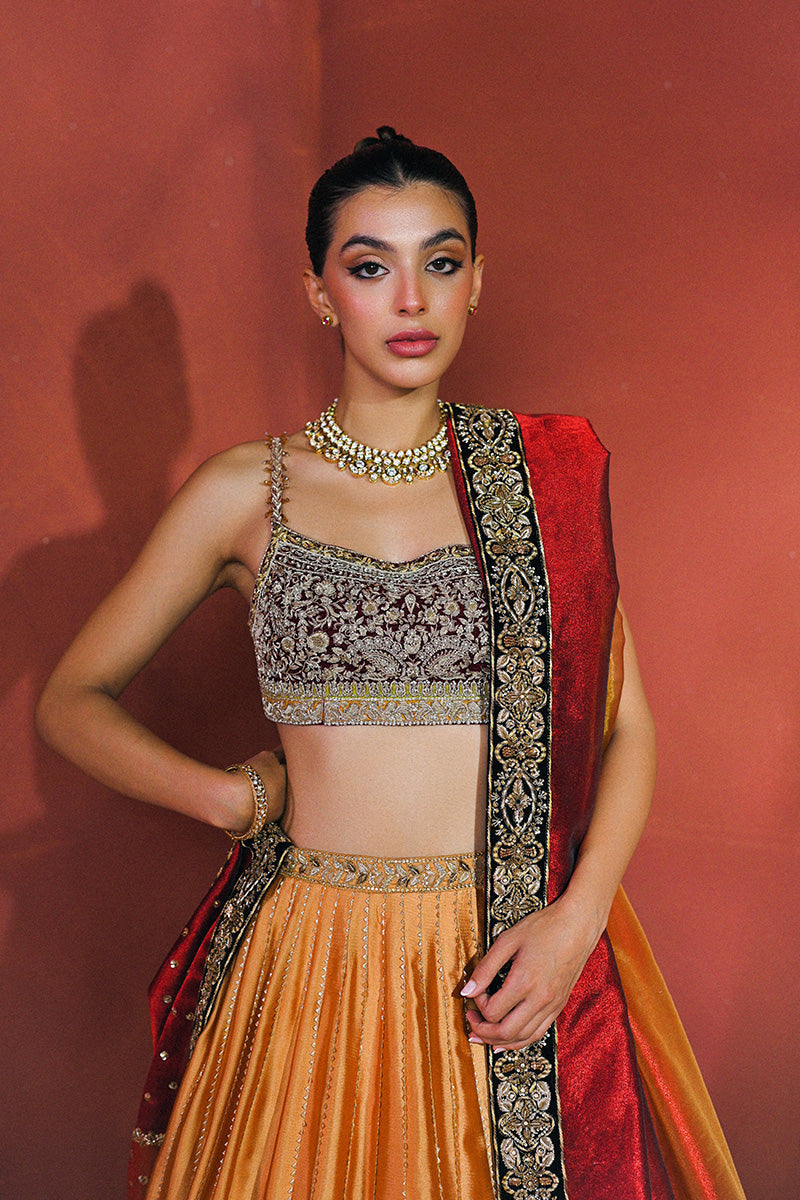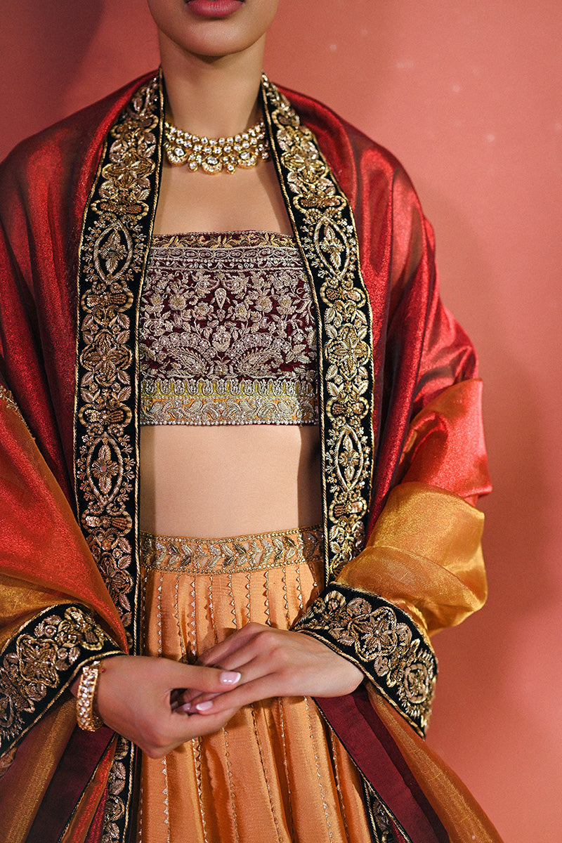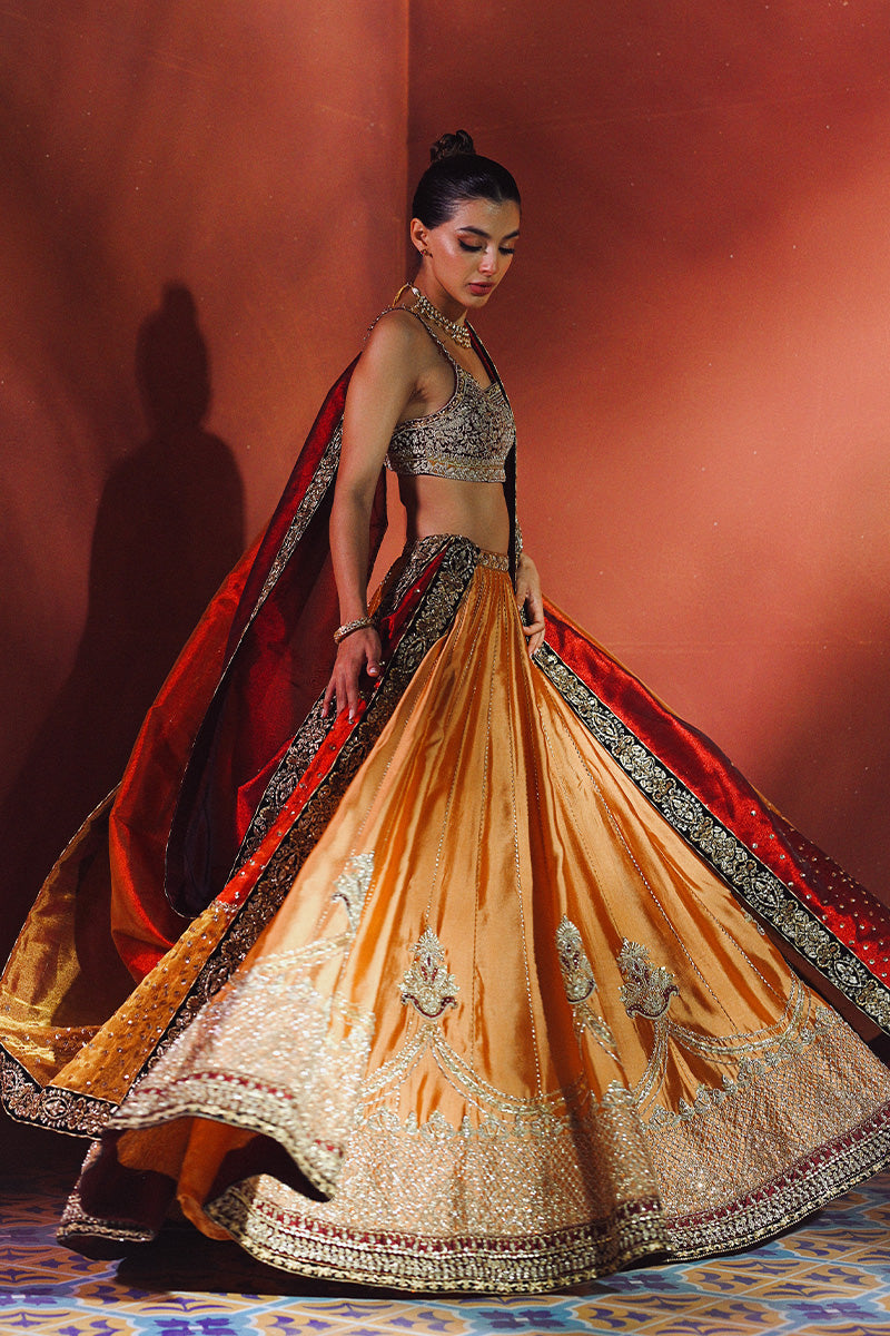 This exquisite lehenga set is a blend of traditional artistry and opulence, perfect for a grand occasion. The blouse, made from pure velvet, features intricate handwork with zardozi and kora dabka, showcasing the finest craftsmanship. Paired with a lehenga crafted from pure sheesha silk, the ensemble is adorned with elegant applique work, sparkling stone embellishments, and detailed zardozi and kora dabka embroidery, creating a luxurious and sophisticated look. The set is completed with a pure lama dupatta, highlighted by velvet borders and a delicate sequence spray, adding a touch of glamour and elegance to the entire outfit.
