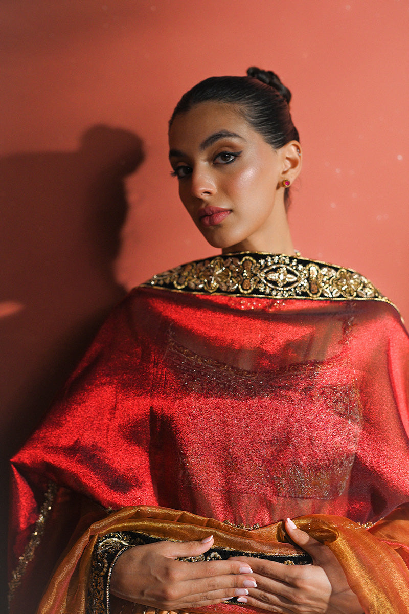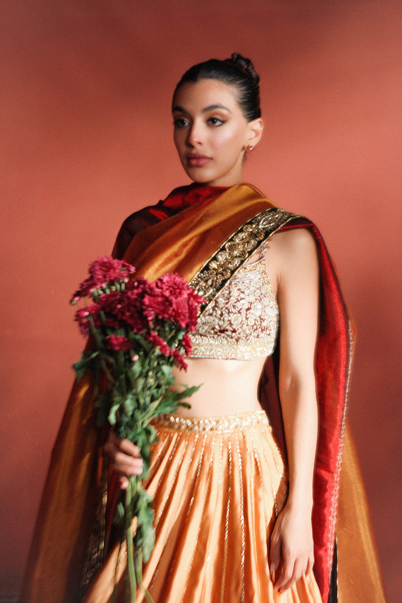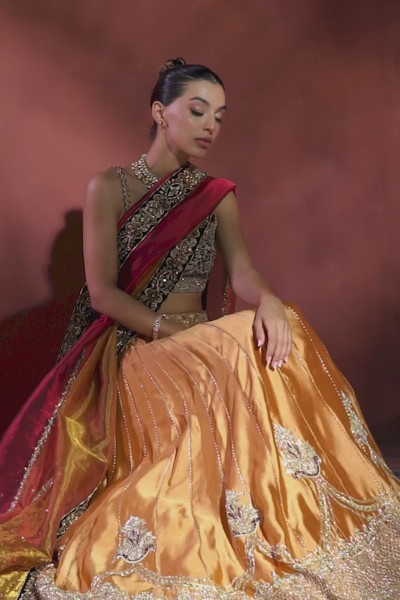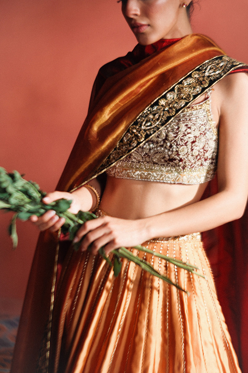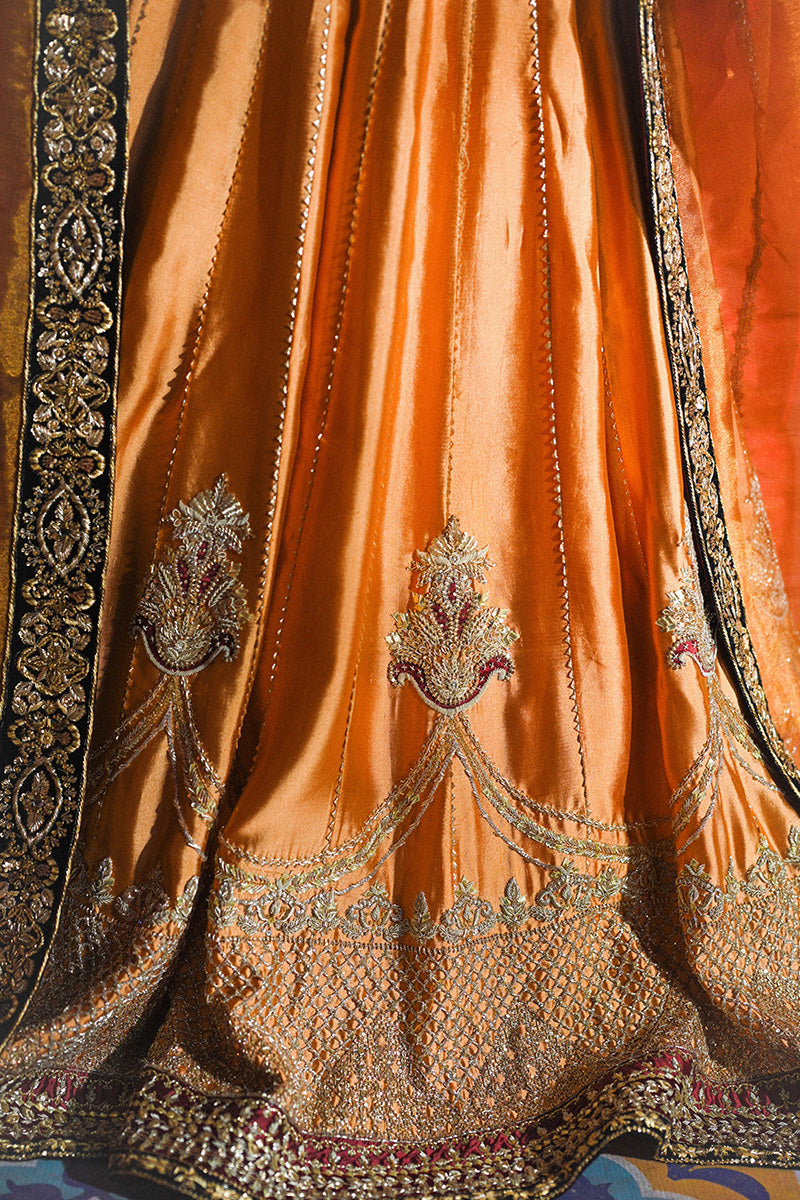 This exquisite lehenga set is a blend of traditional artistry and opulence, perfect for a grand occasion. The blouse, made from pure velvet, features intricate handwork with zardozi and kora dabka, showcasing the finest craftsmanship. Paired with a lehenga crafted from pure sheesha silk, the ensemble is adorned with elegant applique work, sparkling stone embellishments, and detailed zardozi and kora dabka embroidery, creating a luxurious and sophisticated look. The set is completed with a pure lama dupatta, highlighted by velvet borders and a delicate sequence spray, adding a touch of glamour and elegance to the entire outfit.