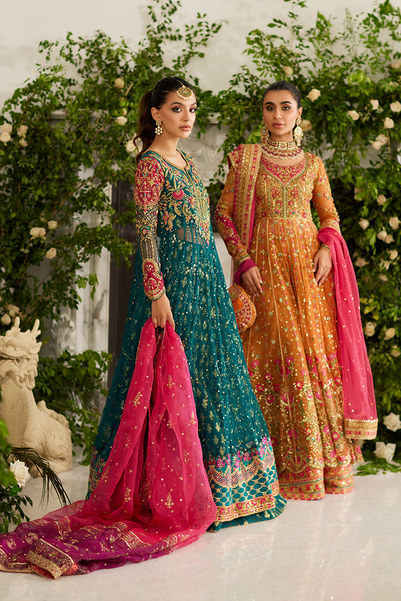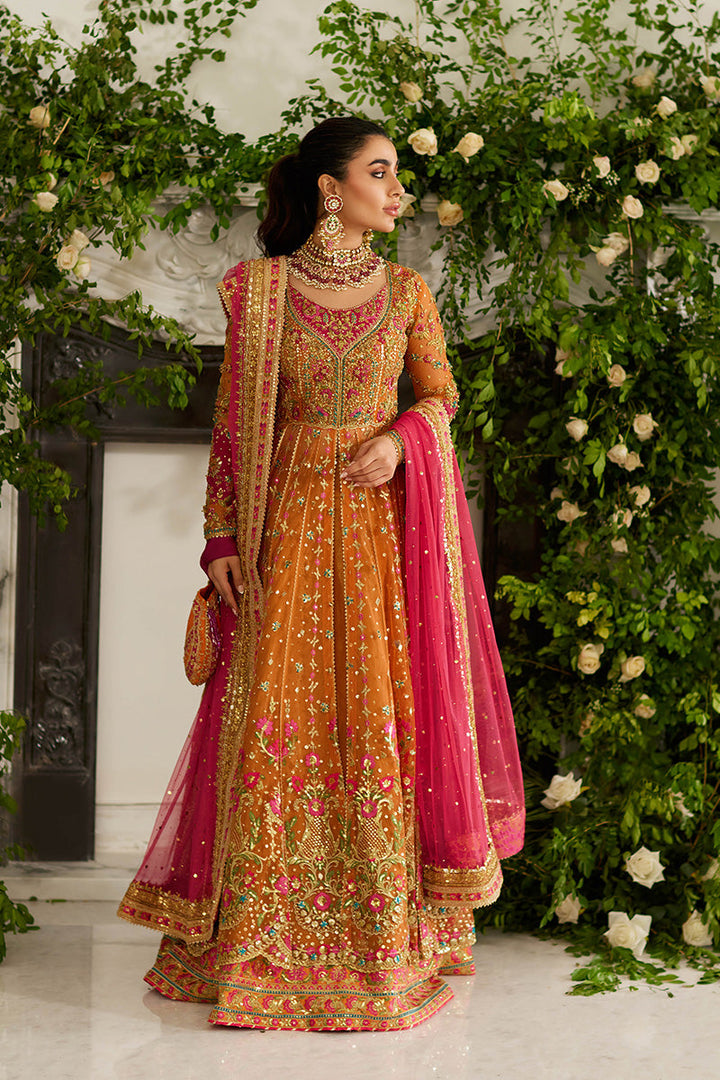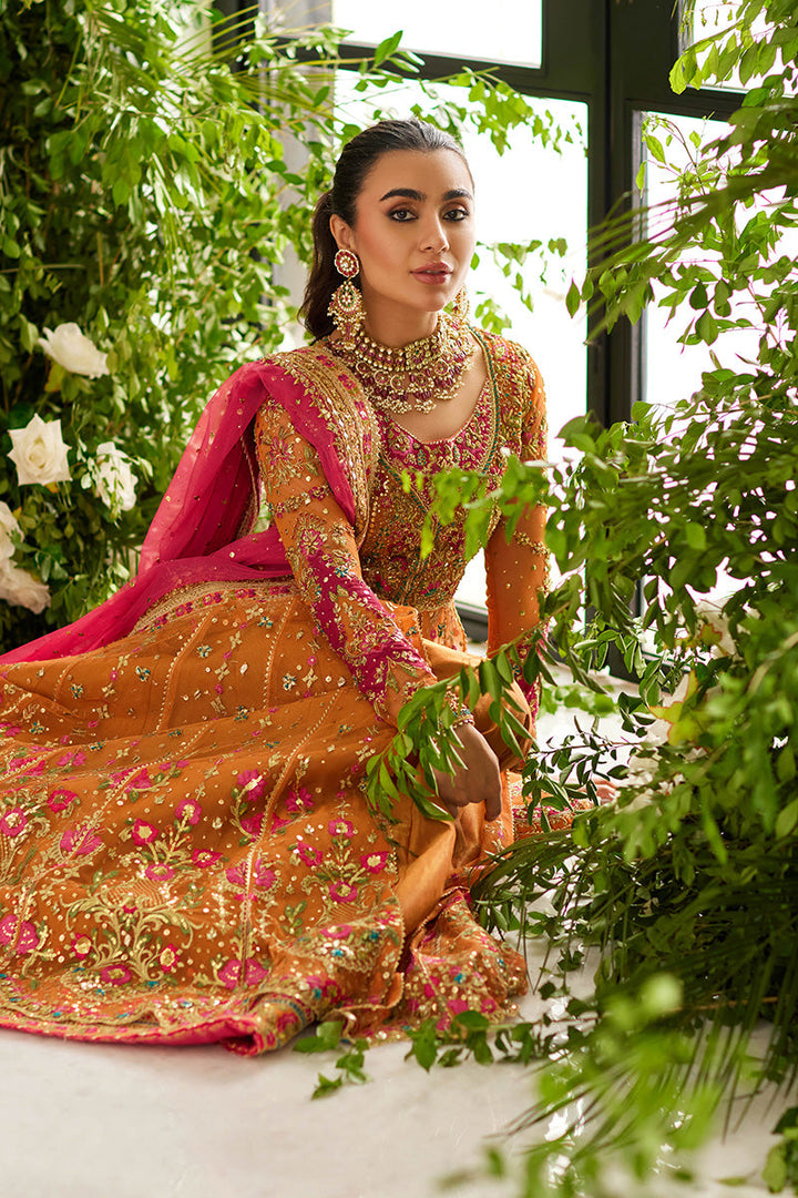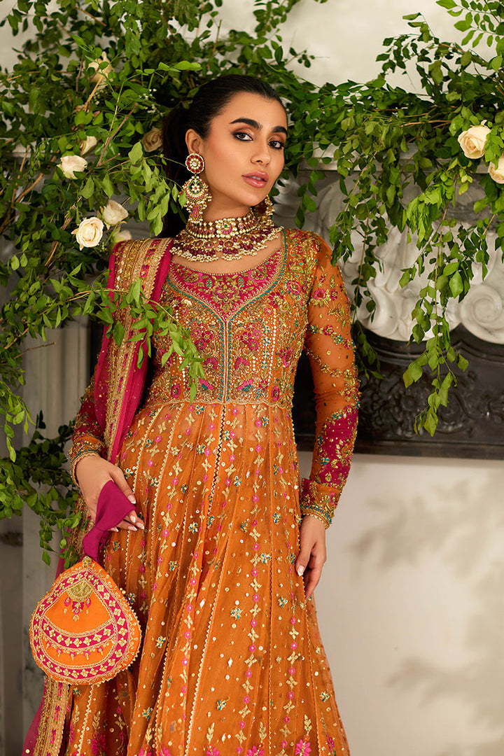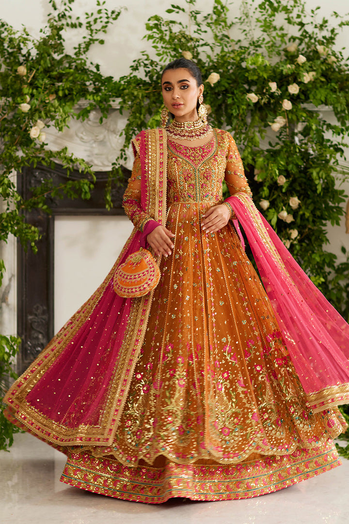 Look straight out of a Mughal fairytale in this pishwaas. The saffron and pink outfit features delicate gold kaam with pink floral details throughout. A scalloped glistening gold border anchors the outfit. The dupatta is made in a contrasting pink and the potli bag features a matching color to the outfit with matching embroidery.