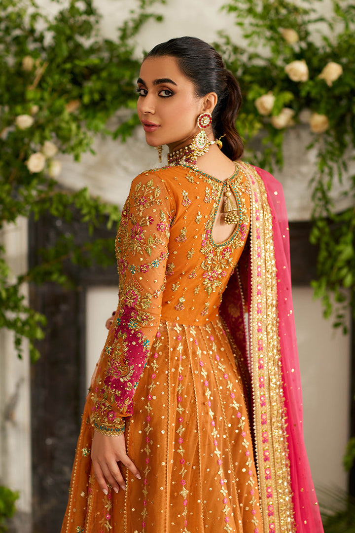 Look straight out of a Mughal fairytale in this pishwaas. The saffron and pink outfit features delicate gold kaam with pink floral details throughout. A scalloped glistening gold border anchors...