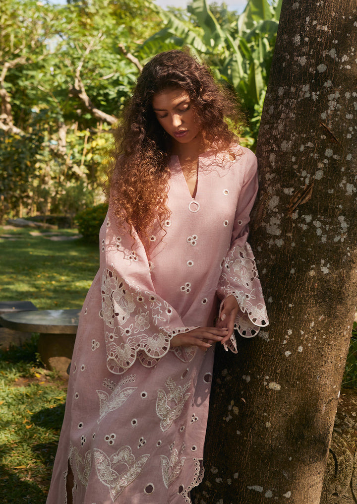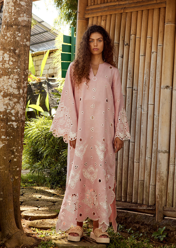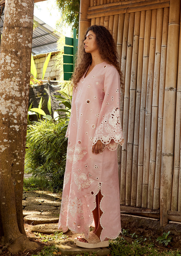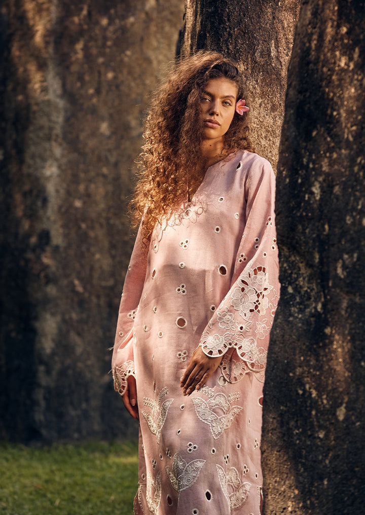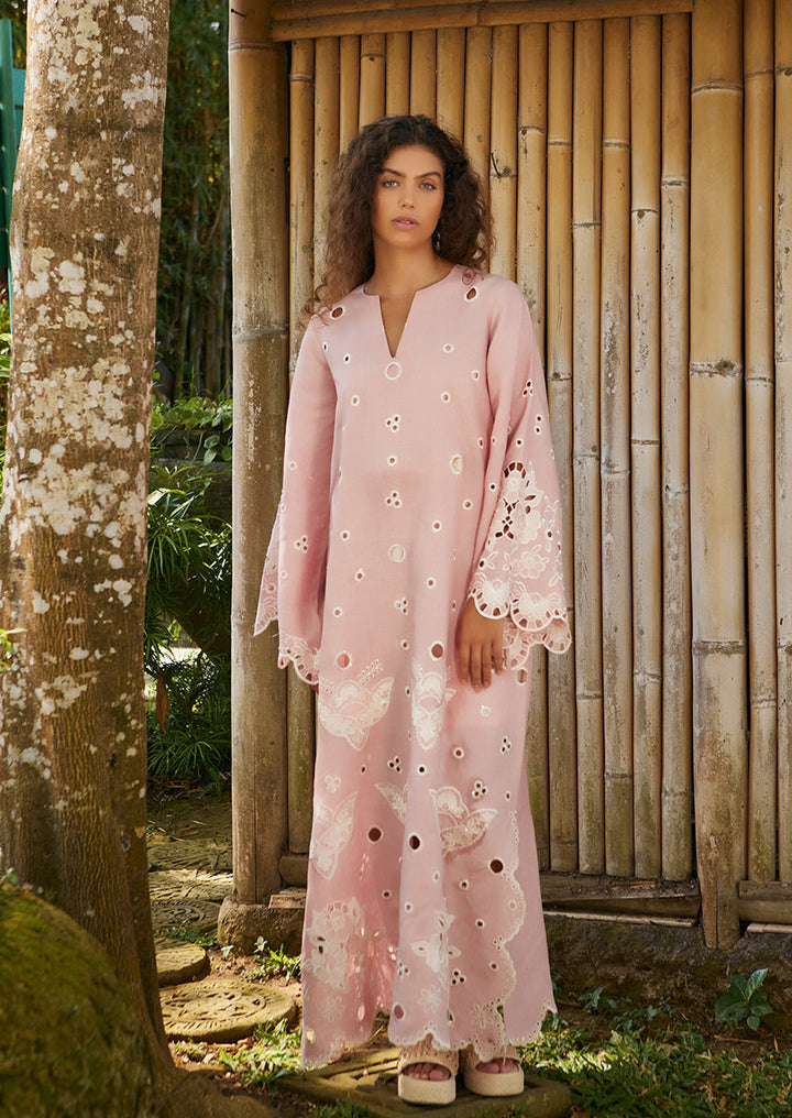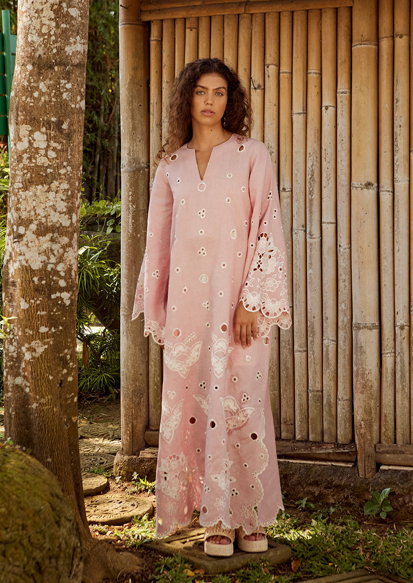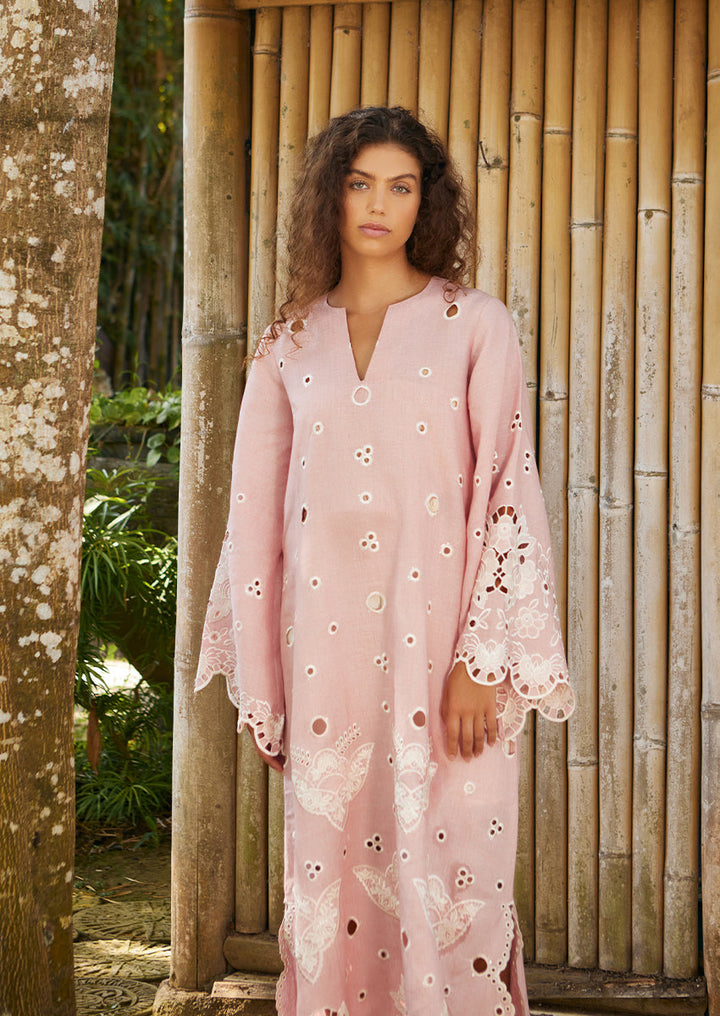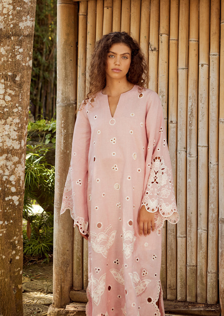 Discover the Amelia Kaftan, an exquisite piece crafted from lightweight linen. This versatile piece features a flattering crew neckline, elegantly adorned with intricate ivory appliqué and delicate eyelet details, making it an ideal choice forever for both daytime outings and evening gatherings.