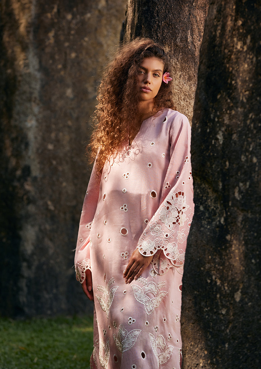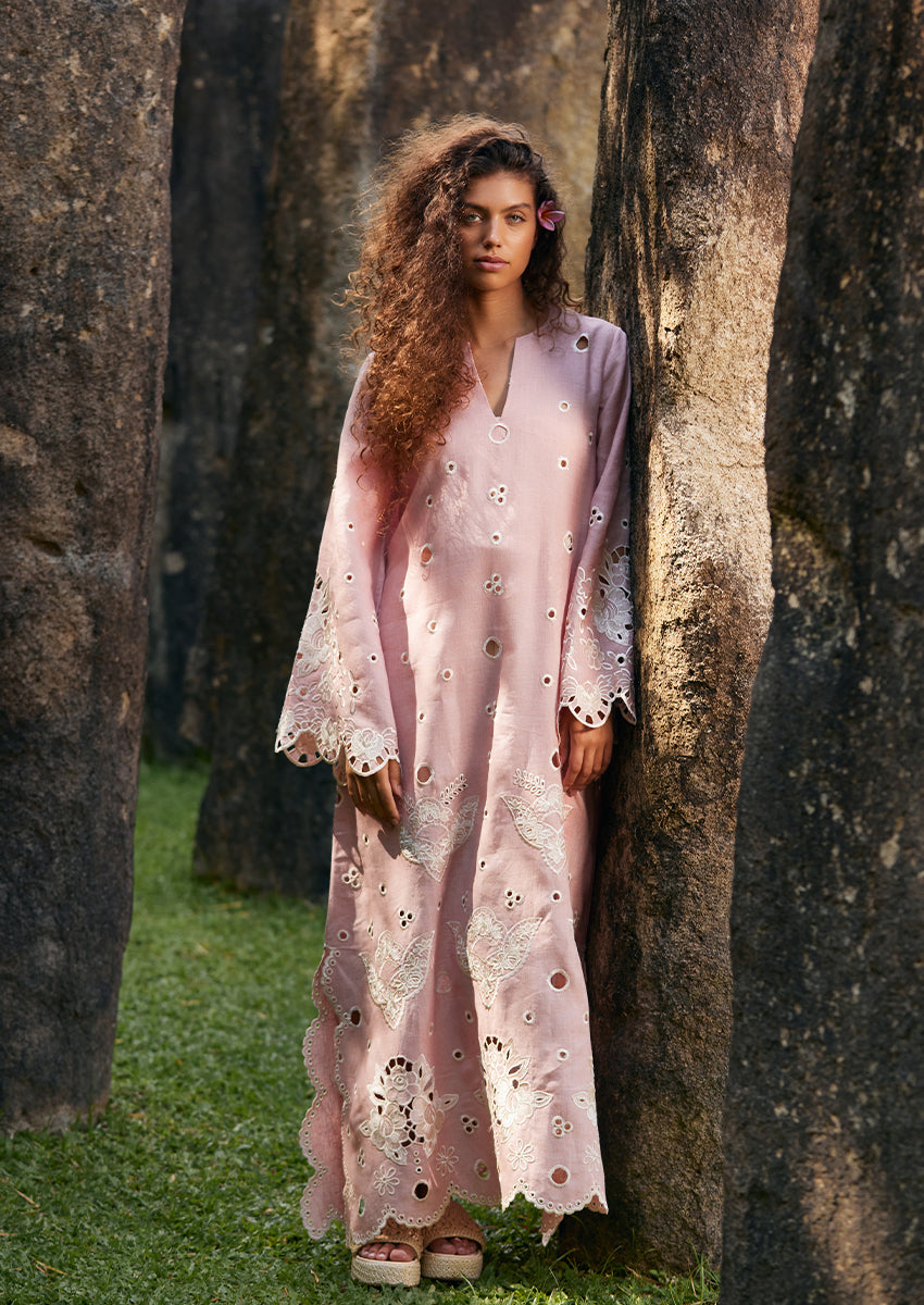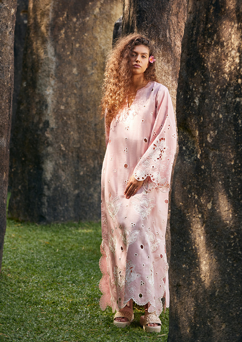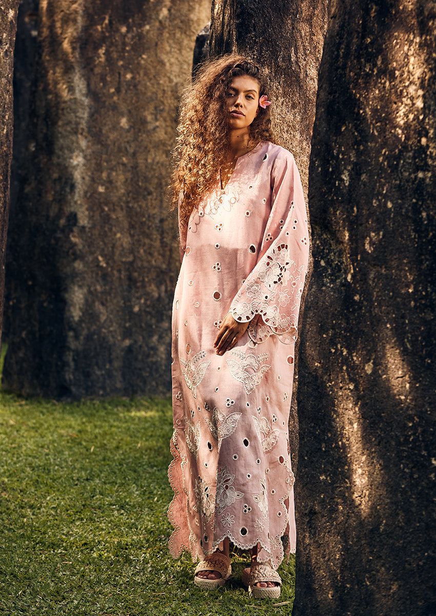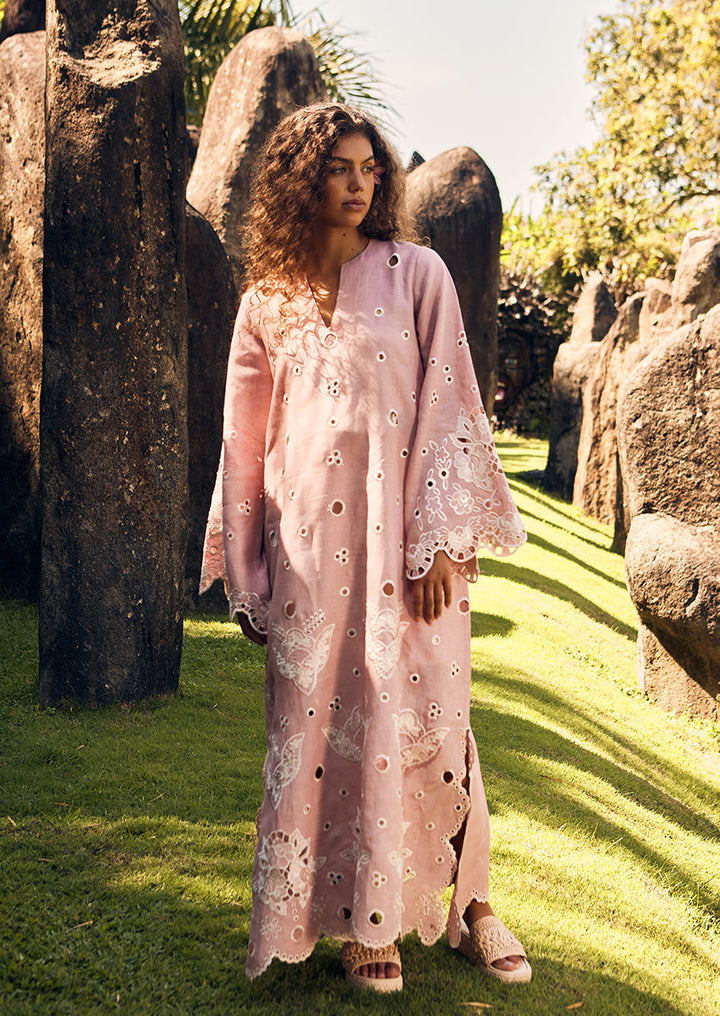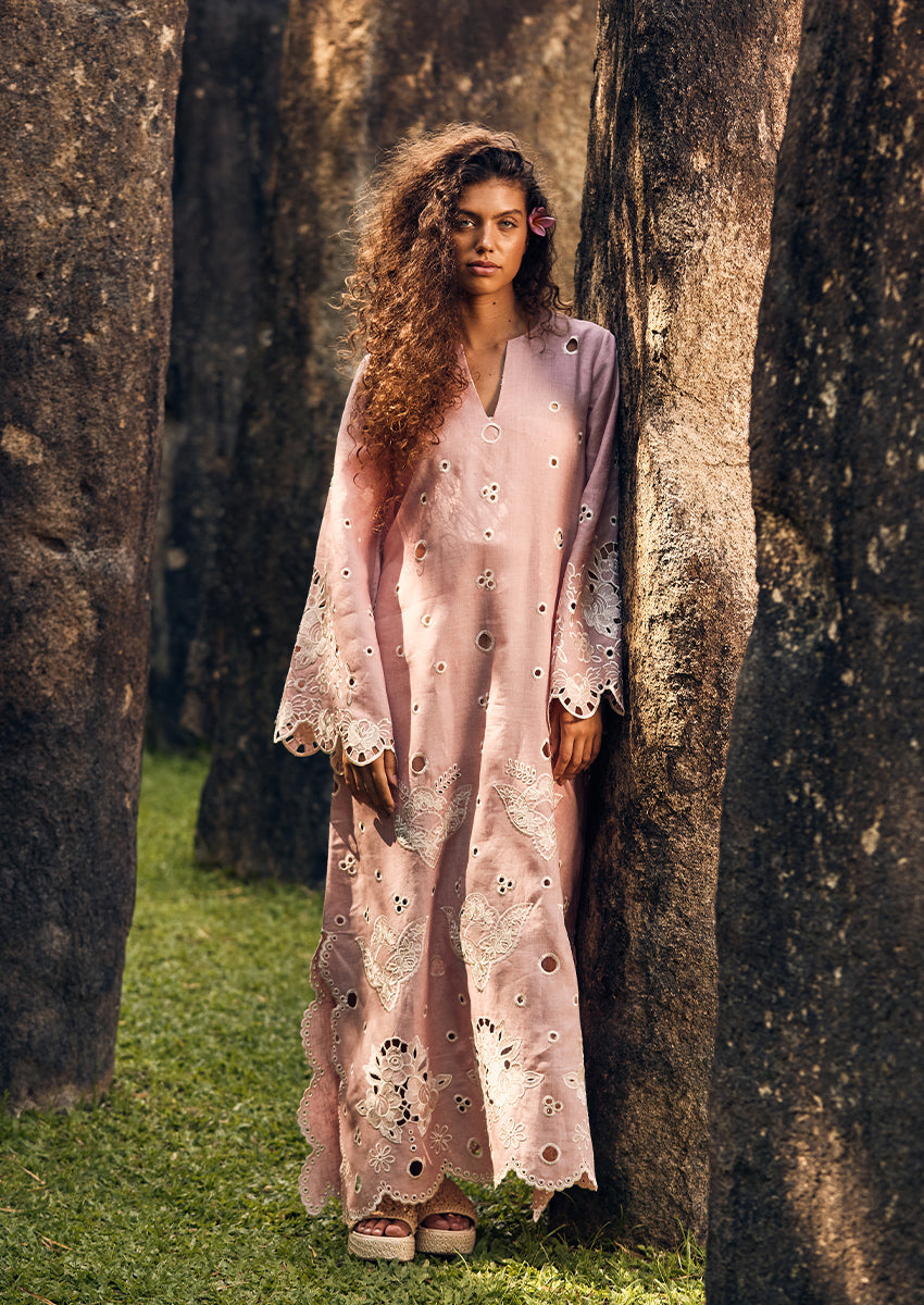 Discover the Amelia Kaftan, an exquisite piece crafted from lightweight linen. This versatile piece features a flattering crew neckline, elegantly adorned with intricate ivory appliqué and delicate eyelet details, making it an ideal choice forever for both daytime outings and evening gatherings.