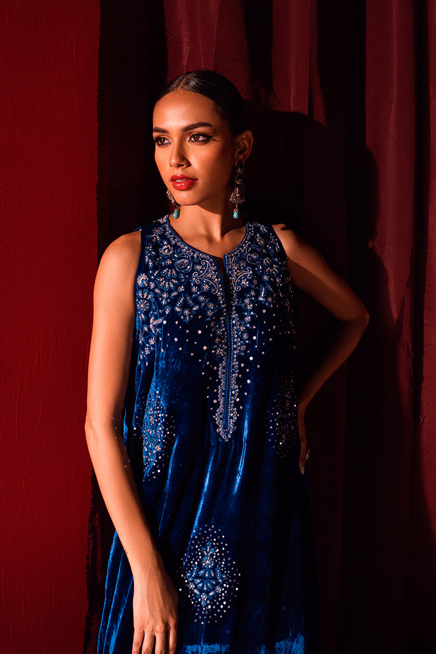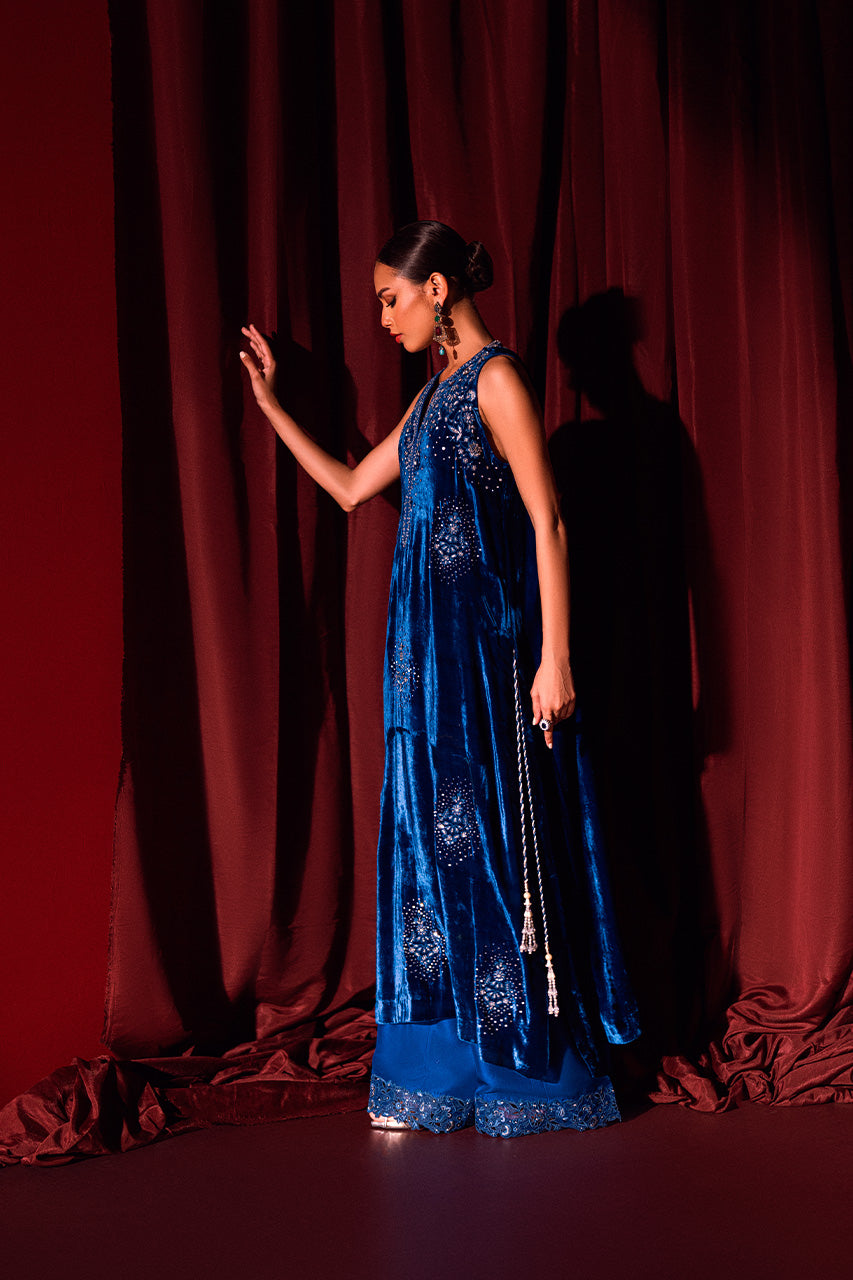 This exquisite attire showcases intricate zari work, meticulously hand-finished with delicate pearls, shimmering sequins, and dazzling Swarovski stones. The carefully placed embellishments add layers of texture and brilliance giving the fabric an elegant, opulent appearance. The design seamlessly merges heritage craftsmanship with modern innovation. Paired with chic culotte trousers, this ensemble achieves a refined balance between timeless grace and modern style, making it a perfect choice for special occasions.