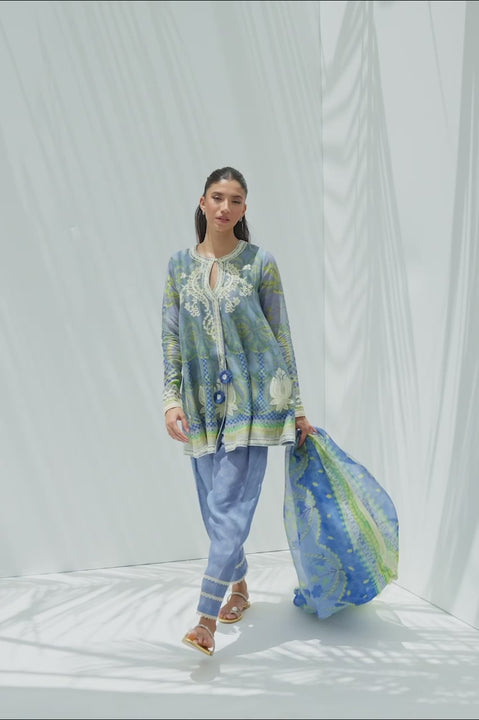 A subdued glacial blue printed cotton net angarkha swirls effortlessly with intricate tropical and geometric prints, accented by ivory aari embroidery along the keyhole neckline, sleeves and hemline. It can be paired with a pure rawsilk tapered shalwar featuring a tonal print and tiered lace pleating along the hem. The look is finished with a flowing organza dupatta adorned with a complementary floral print in azure, glacial blue and lime tones, lending an elegant flair to the ensemble.
