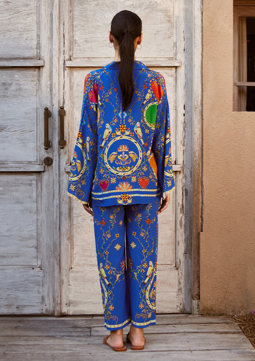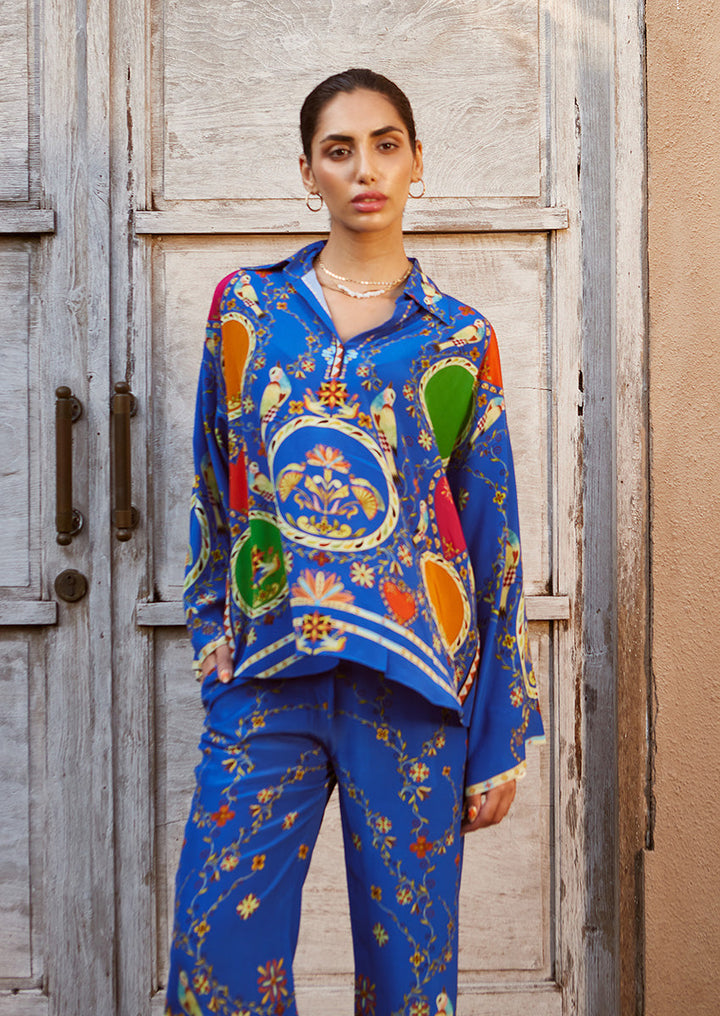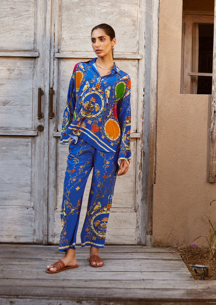 Embrace effortless elegance with this cobalt-hued crepe co-ord set, designed with a focus on archival prints. With its relaxed fit and subtle edge, this ensemble captures the essence of laid-back luxury while staying true to our aesthetic.