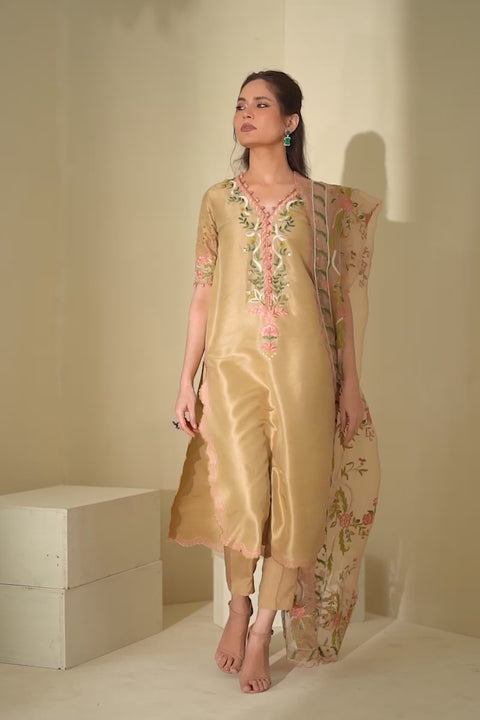 Look graceful as ever in this raw silk long shirt that features delicate embroidery on the neckline and daaman and ornate half sleeves. The outfit is completed with straight pants and a floral organza dupatta.