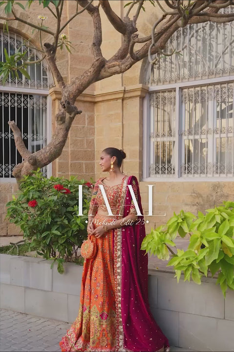 A celebration of warmth and grandeur, this orange pure raw silk bodice is adorned with intricate all-over embroidery, brought to life with delicate hangings across the shirt and sleeves that add movement and texture. The back features tassel embellishments, offering a soft, traditional accent that enhances the charm of the silhouette. Paired with a digital silk orange lehenga shimmering with sequin detailing, the look is rich in vibrance and visual texture. A medium-weight raw silk dupatta, finished with an elegant border, completes the ensemble with a polished and refined touch — perfect for festive celebrations and statement moments.