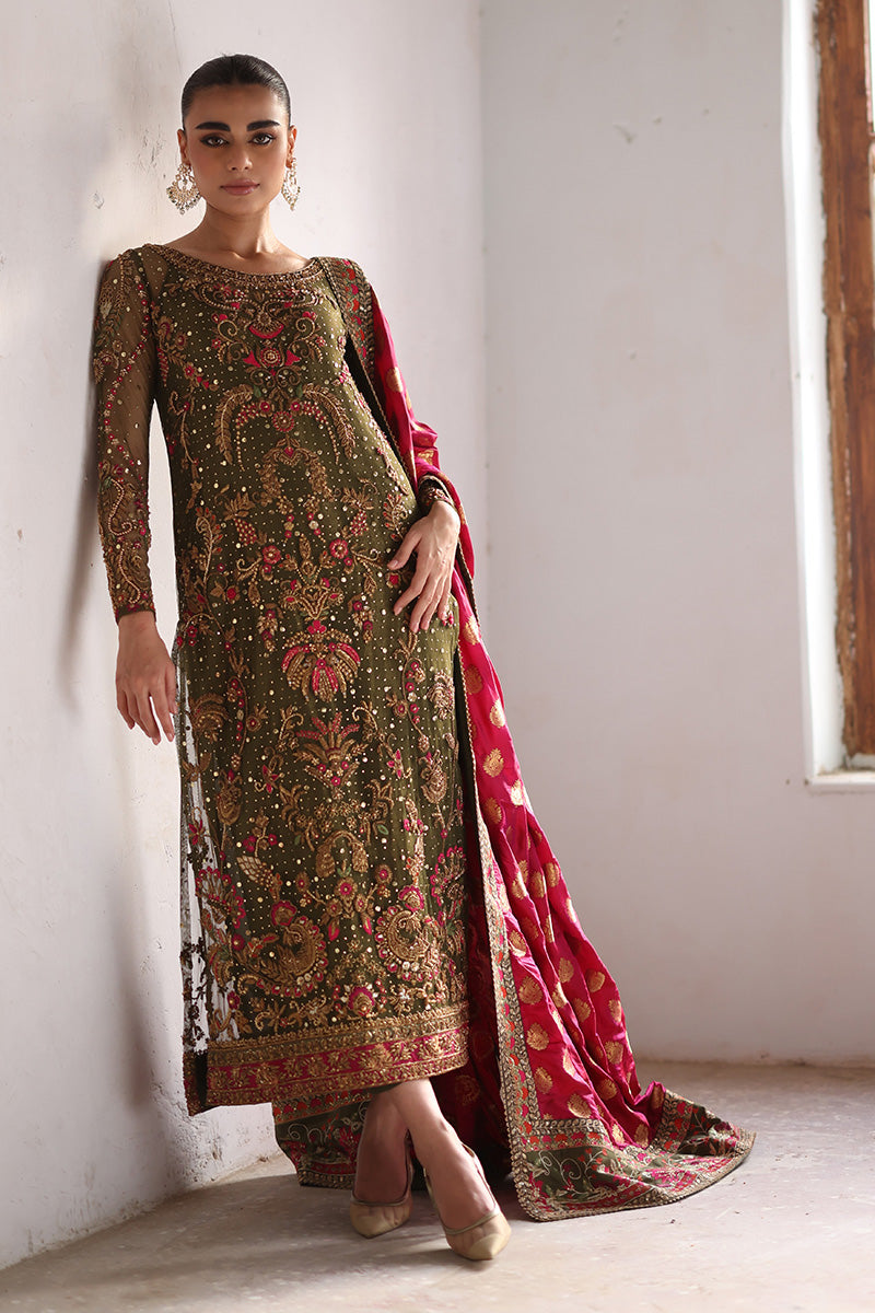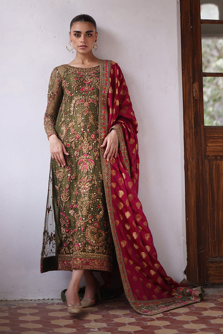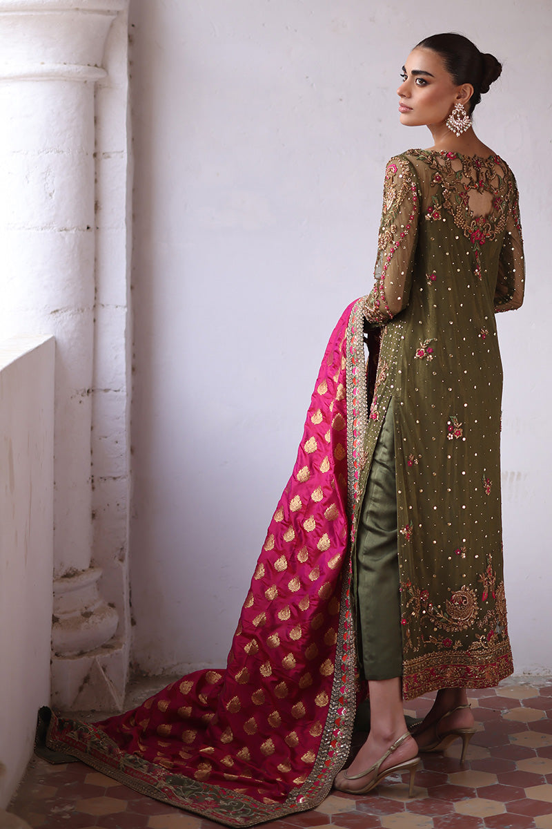 Look right out of a mughal fairytale in this Mina Hasan formal green straight shirt. Hand stitched mukesh and gota kaam is further embellished with delicate botanical inspired embroideries. The outfit is completed with a contrasting pink jamawar dupatta with a thick hand detailed border.