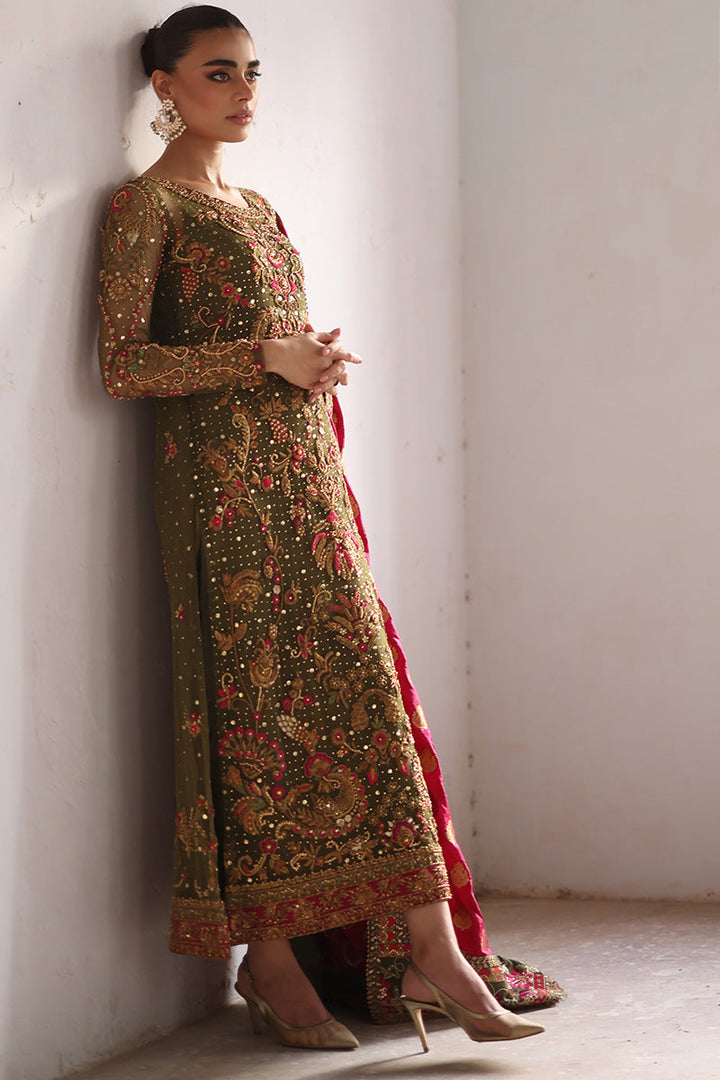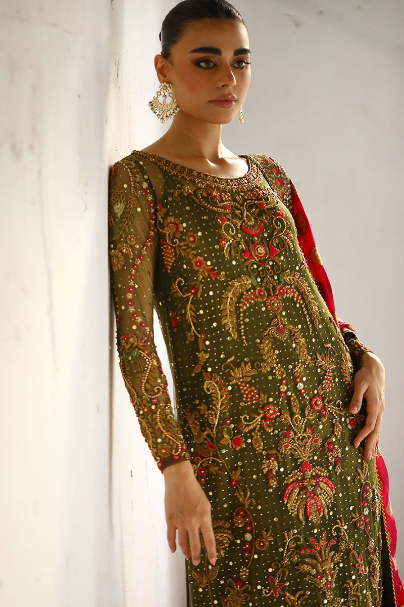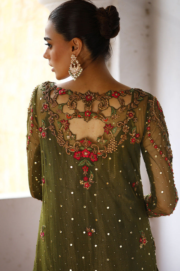 Look right out of a mughal fairytale in this Mina Hasan formal green straight shirt. Hand stitched mukesh and gota kaam is further embellished with delicate botanical inspired embroideries. The...