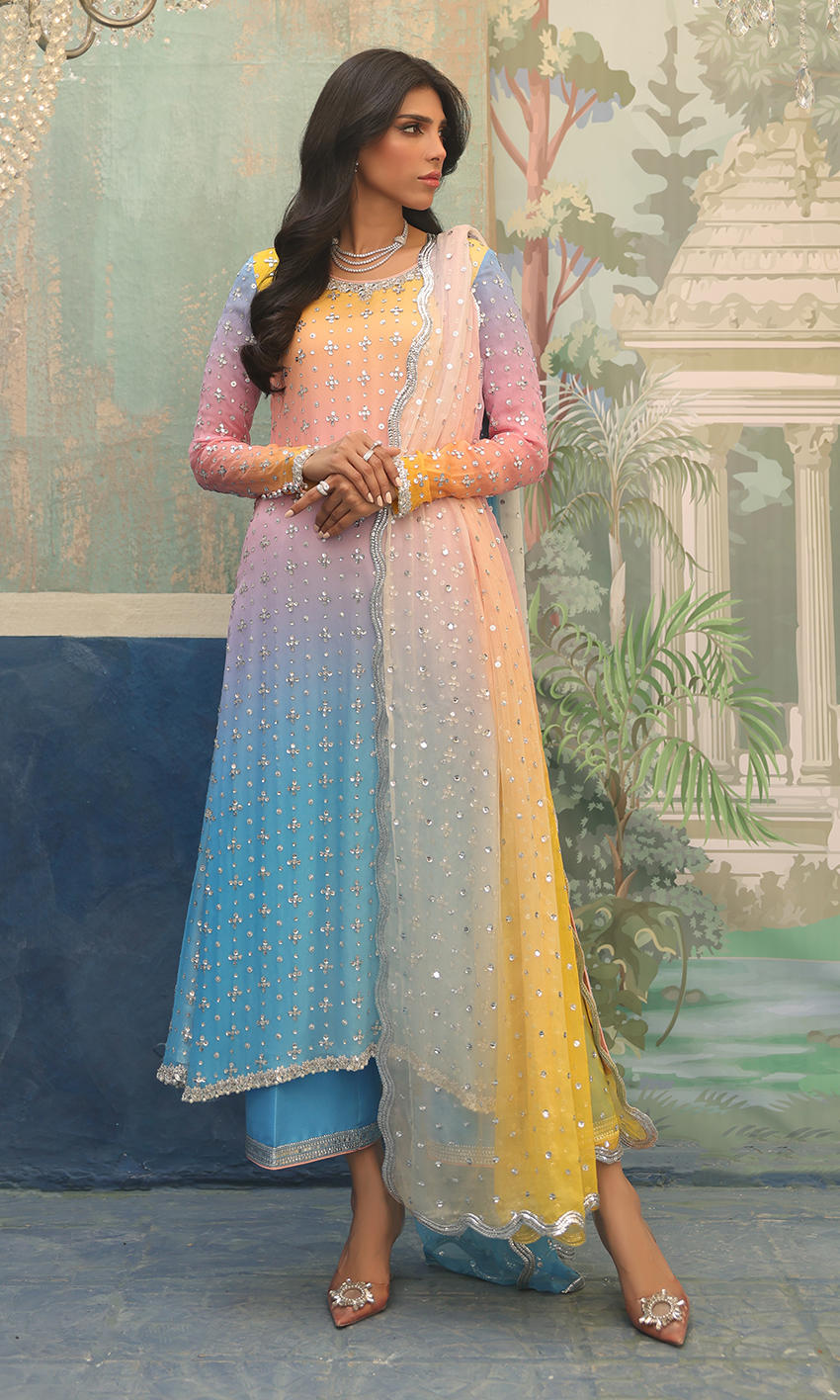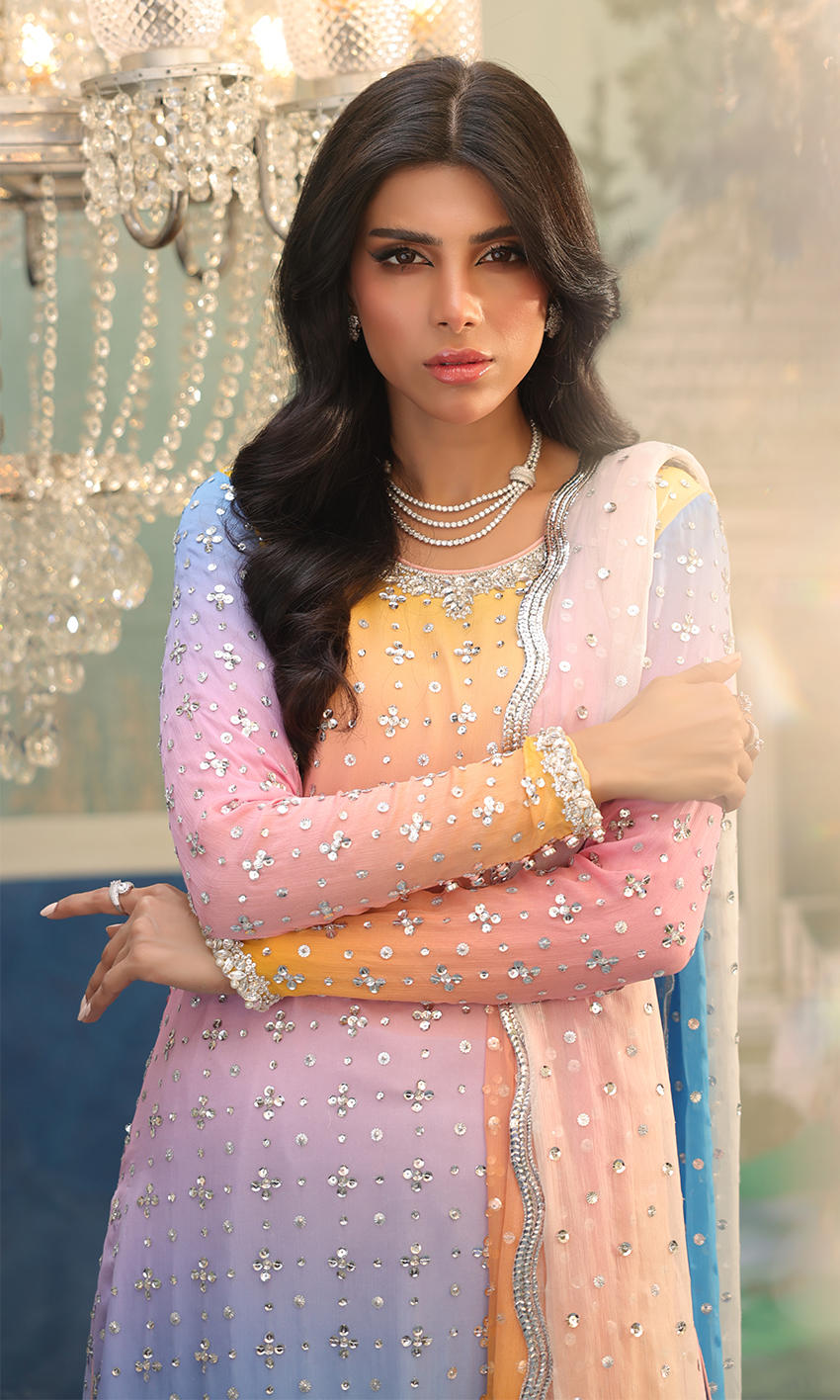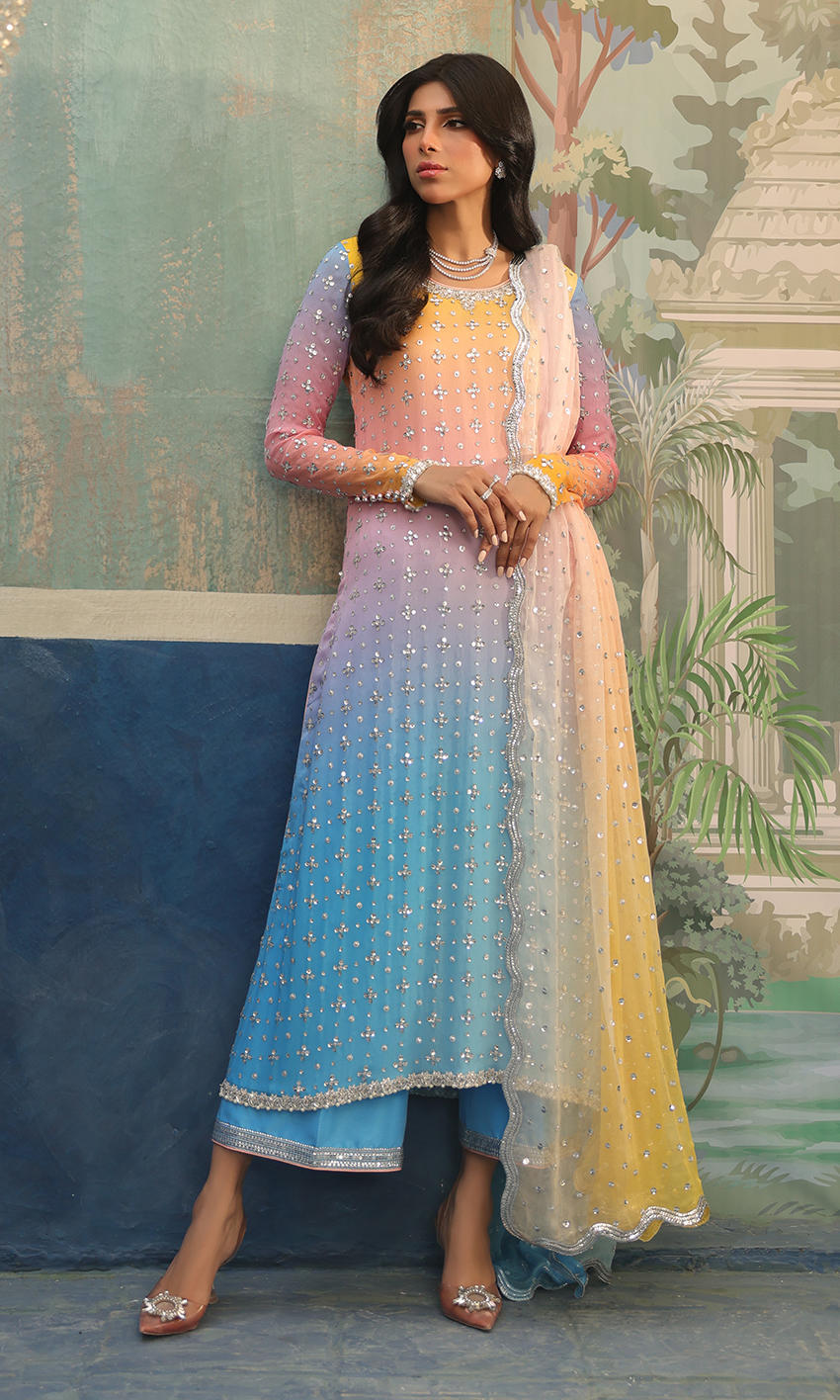 A beautifully crafted ombre ensemble featuring intricate handwork all over, along with a detailed neckline and borders. Paired with a sequinned ezaar and signature dupatta.