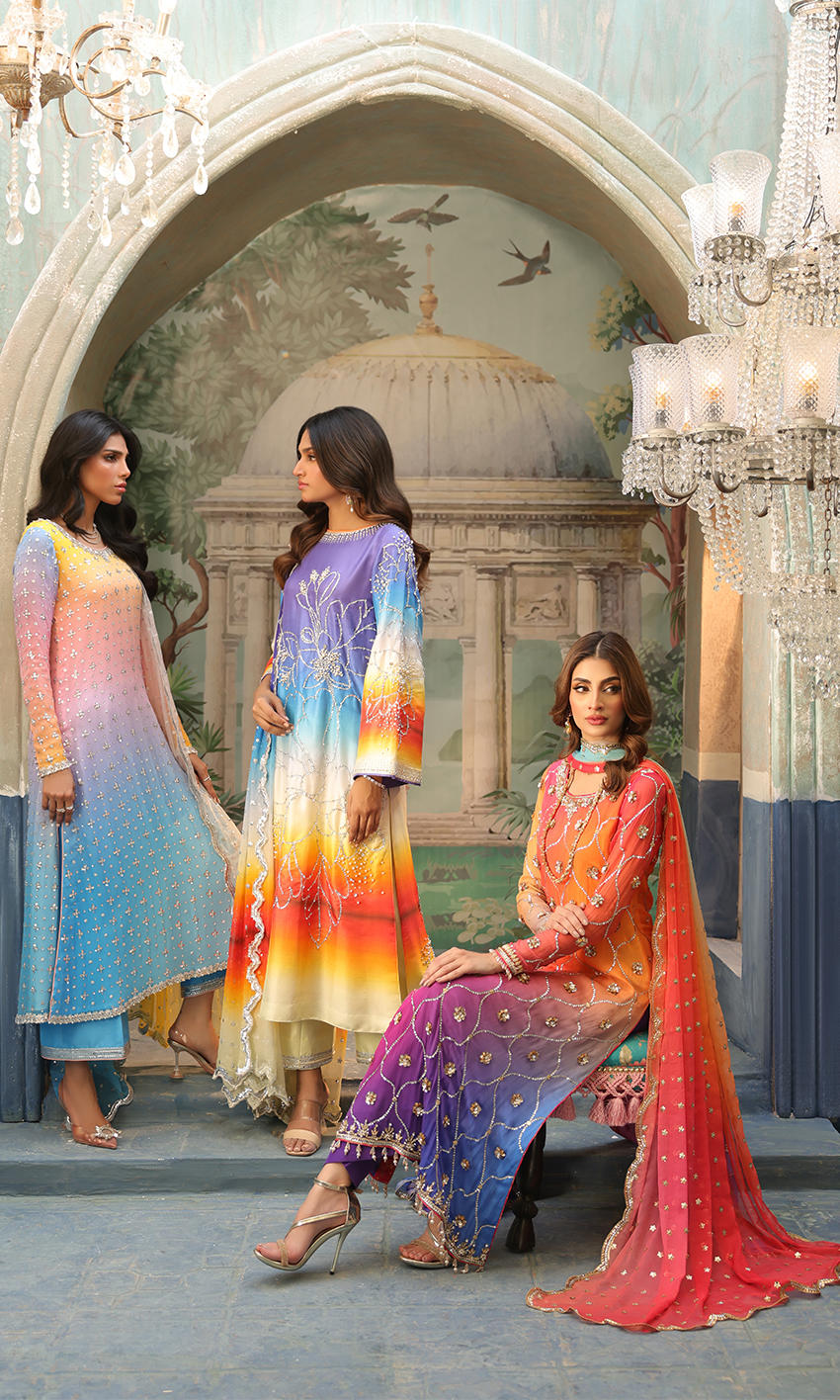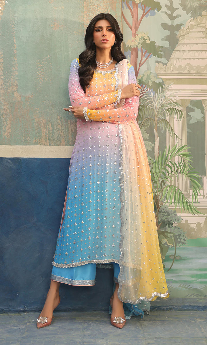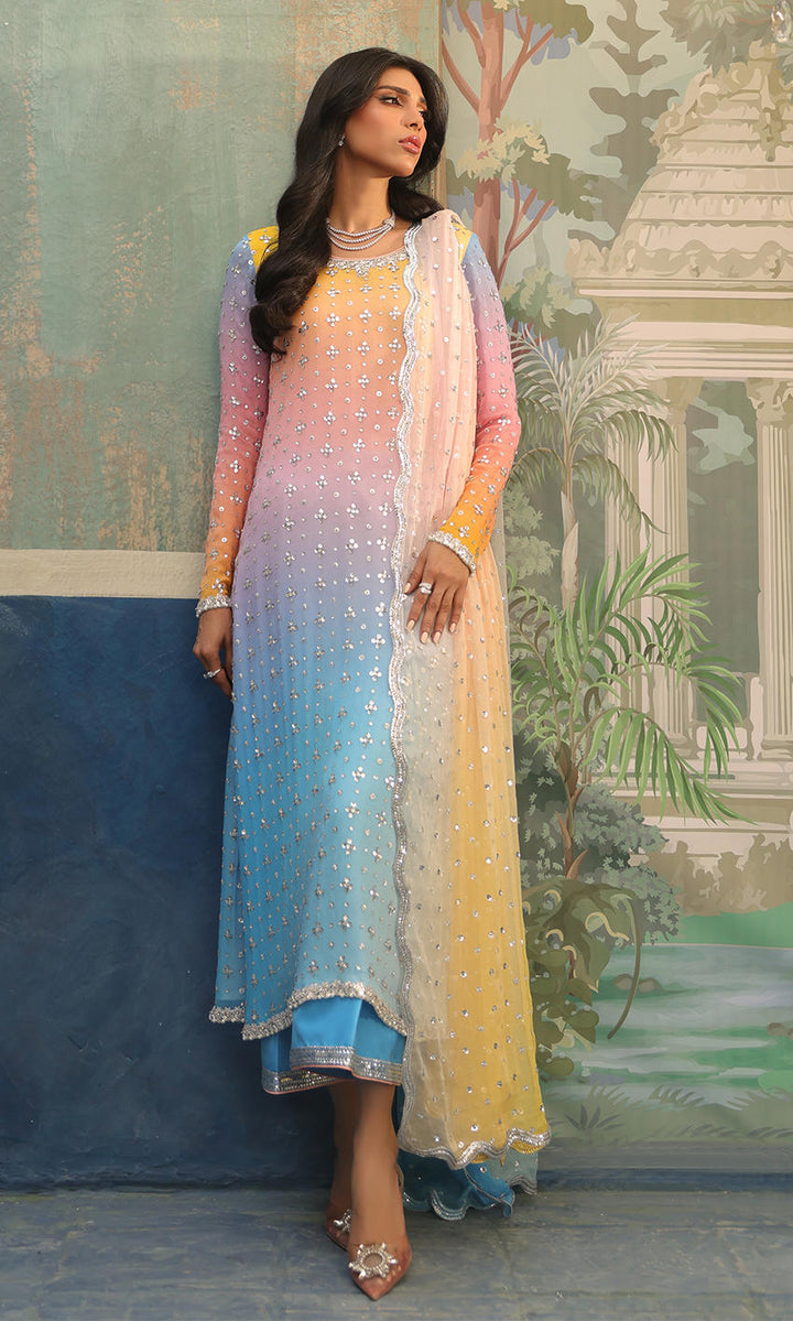 A beautifully crafted ombre ensemble featuring intricate handwork all over, along with a detailed neckline and borders. Paired with a sequinned ezaar and signature dupatta.