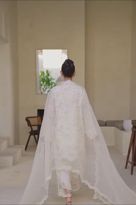 Embrace timeless grace with this ethereal three-piece ensemble, featuring a short white kora digital knee-length shirt adorned with delicate appliqué thread work on the neckline and sleeves. It is paired with a sheer white organza dupatta, beautifully finished with intricate lace work all over, adding a touch of refined elegance. The look is completed with khaddi cotton izaar pants, enhanced with exquisite embroidery that adds charm and detail to the silhouette—perfect for serene daytime events or sophisticated festive gatherings.