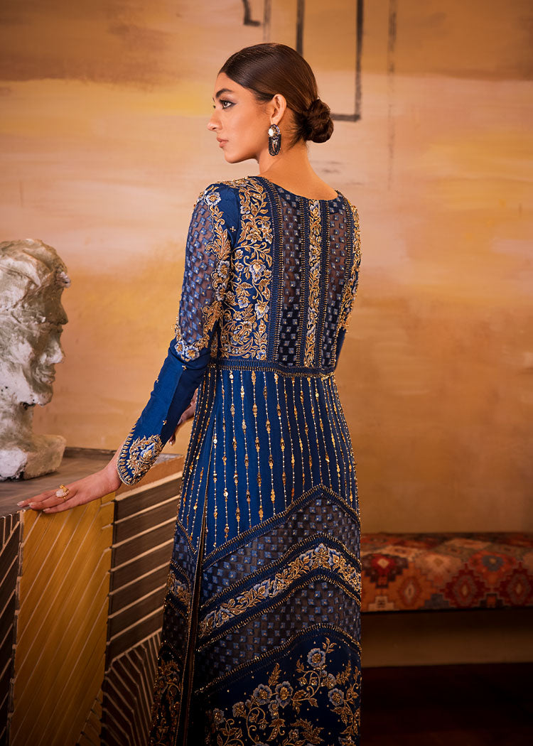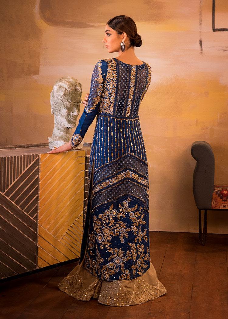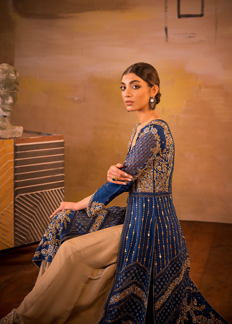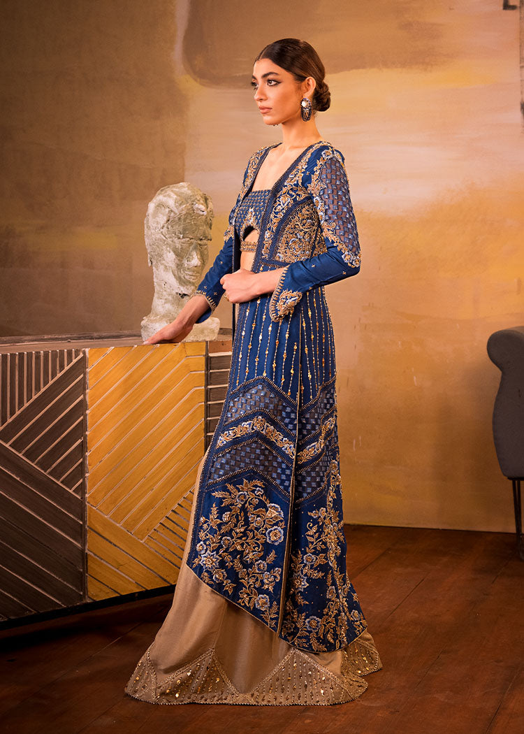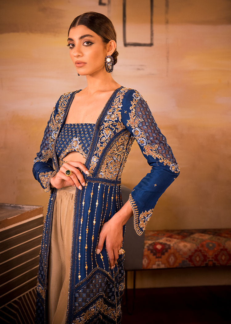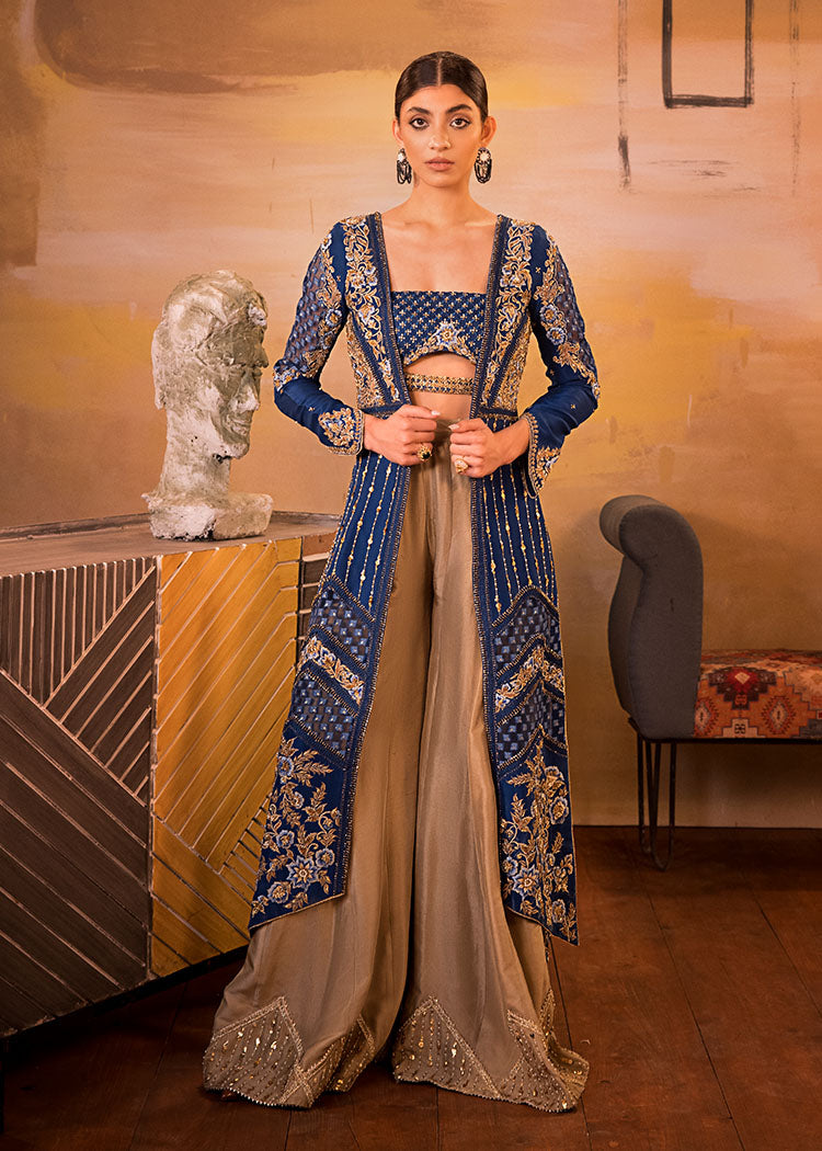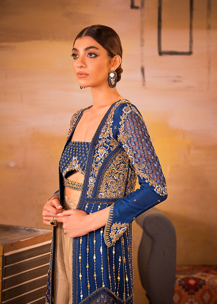 Includes: Long Open Jacket Worked Bustier Pallazos Fabric: Pure Organza Embossed Organza Pure Raw Silk Color: Electric Blue & Gold Description: A Bold Electric Blue Front Open Jacket With Fabric Manipulation Details...