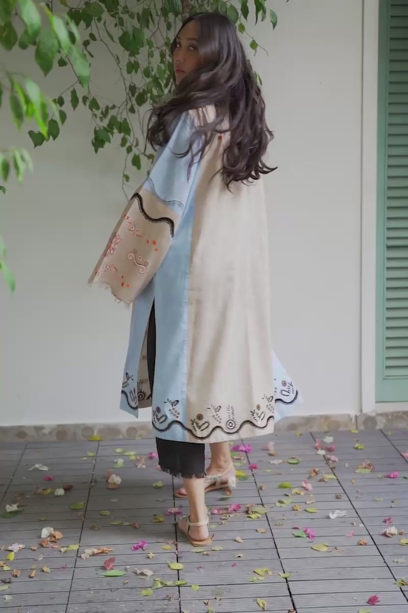 This color-block kurta features machine embroidery with resham thread and applique on the kurta pati. Shredded detailing on the sleeves adds a unique finishing touch, combining contemporary style with traditional craftsmanship