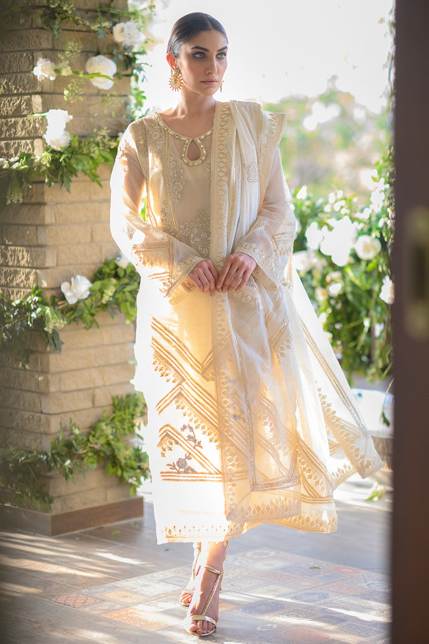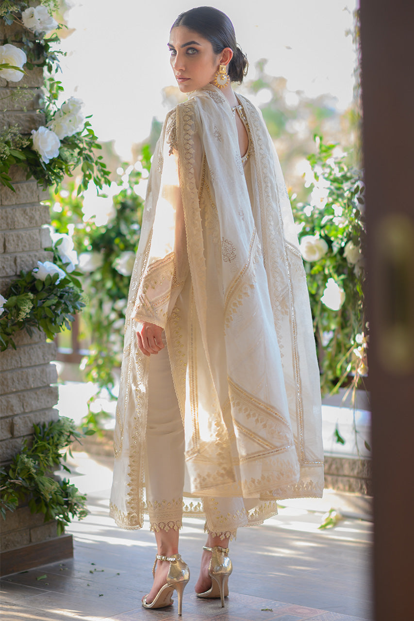 The dream summer look is rendered in intricate resham and tilla embroideries and aesthetically adorned with laces and gotta weave. Paired with a block printed & laced detailed dupatta, this feminine, and airy silhouette is a classic one for all seasons.