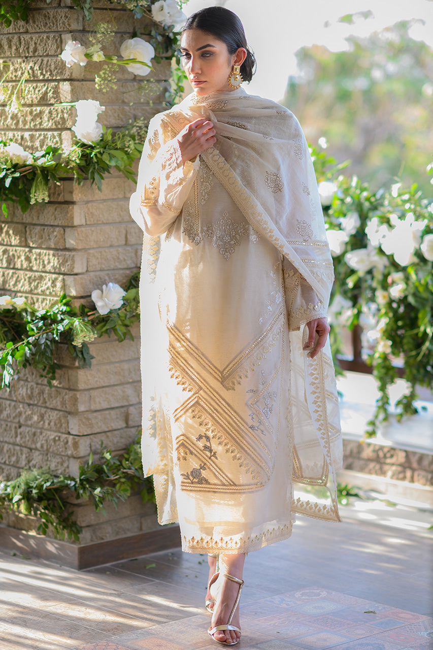 The dream summer look is rendered in intricate resham and tilla embroideries and aesthetically adorned with laces and gotta weave. Paired with a block printed & laced detailed dupatta, this...