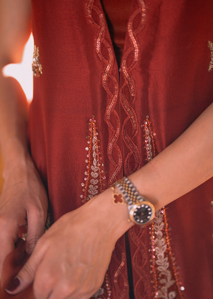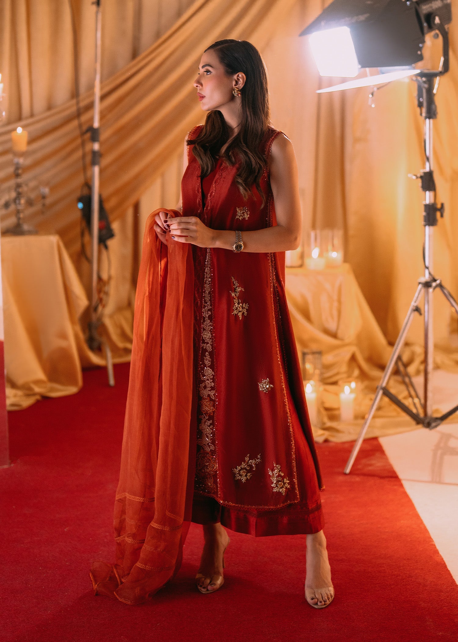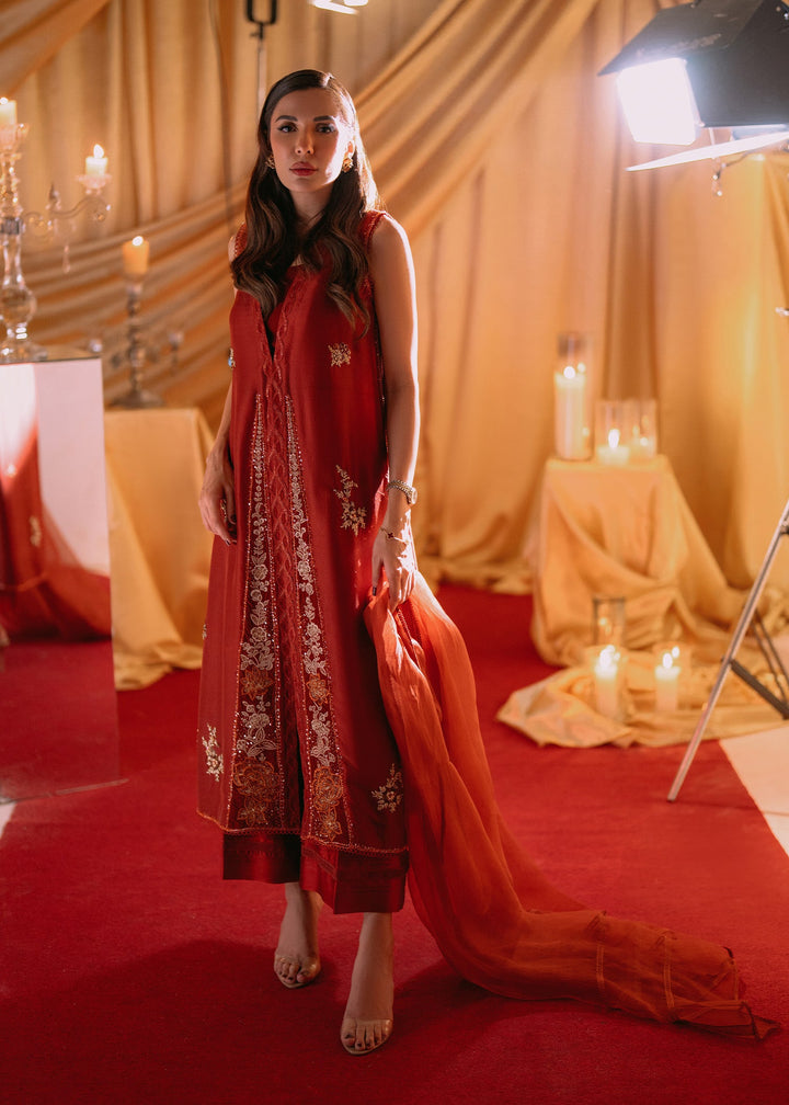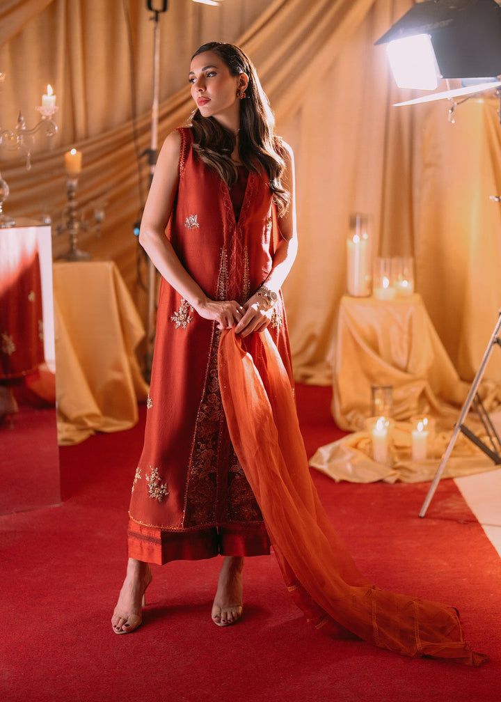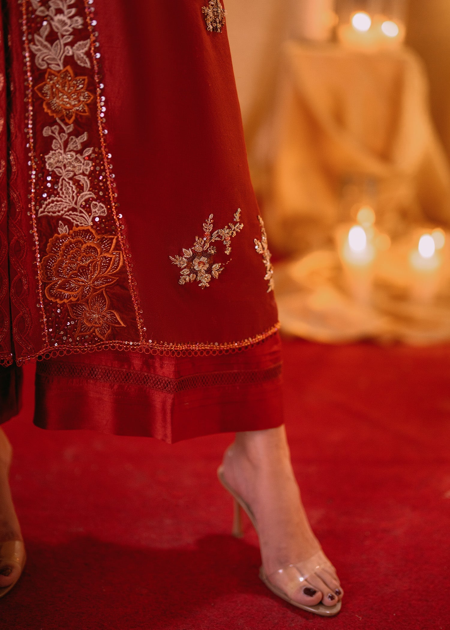 This is a front-open jacket featuring a front panel adorned with velvet appliqué, intricately embroidered and hand-detailed to create a luxurious appearance. The jacket is embellished with hand-worked bunches and kora-dabka accents throughout. It is paired with a pure organza dupatta, beautifully detailed, and classic culottes for a complete, elegant look.