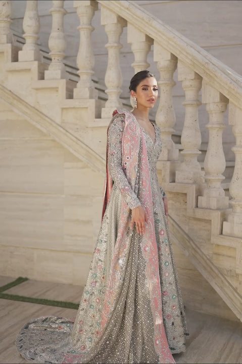 An ode to celestial romance, this icy platinum bridal peshwas is sculpted in a flowing silhouette with side cutouts, a plunging neckline and a striking trail. Drenched in hand embroidered sequins, pearls and pastel resham florals in blush coral, seafoam and moonstone, the sweeping tissue panels glimmer like stardust against dusk. A soft taupe hued tulle dupatta, embroidered with sequins and zardozi, is framed with blush coral applique accents. Completing this silhouette crafted for the bride who balances tradition with quiet audacity is a delicate trapeze cut back.