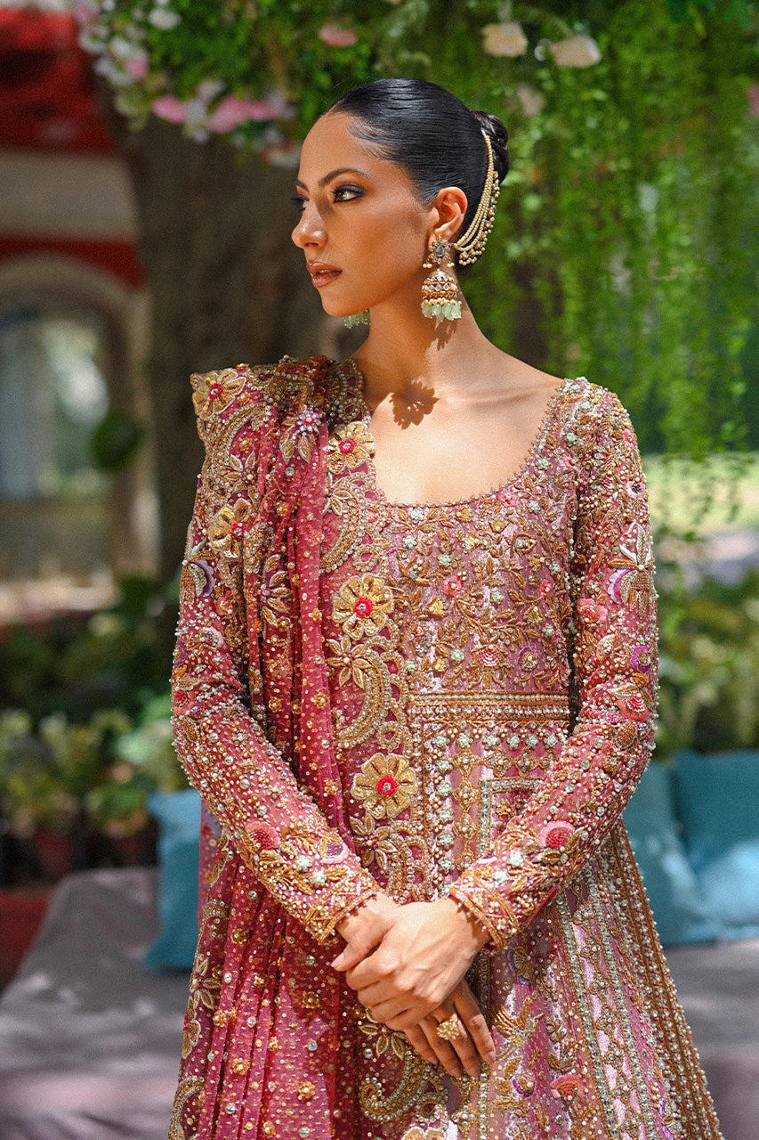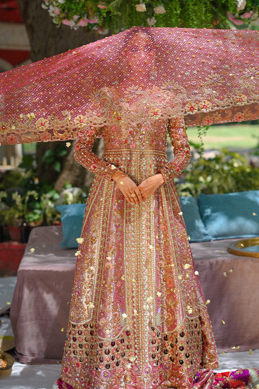 A rose gold tissue peshwas with a cutworked daman features a mix of zardoze and resham details. A tulle dupatta is intricately worked with floral zardoze borders and sequins. The look is completed with a tissue brocade lehnga with chatapatti border.