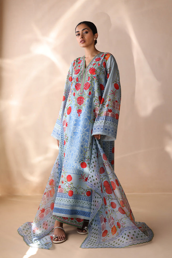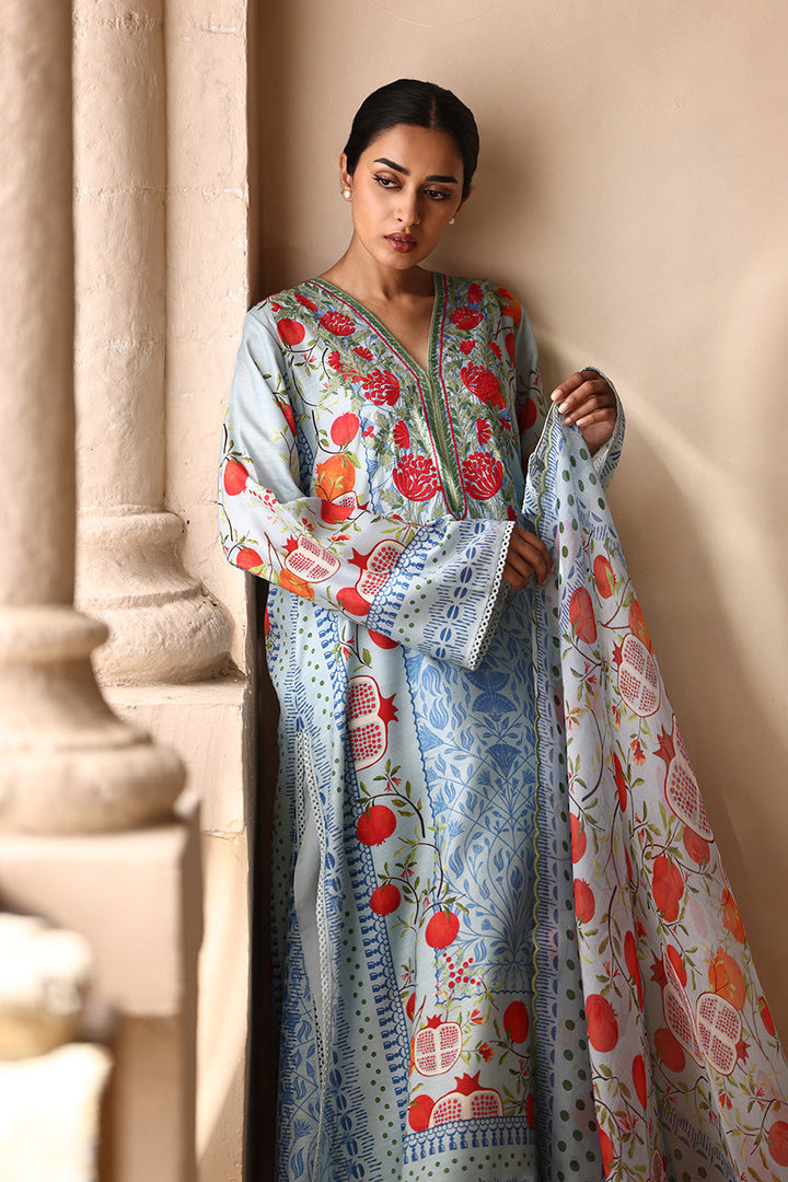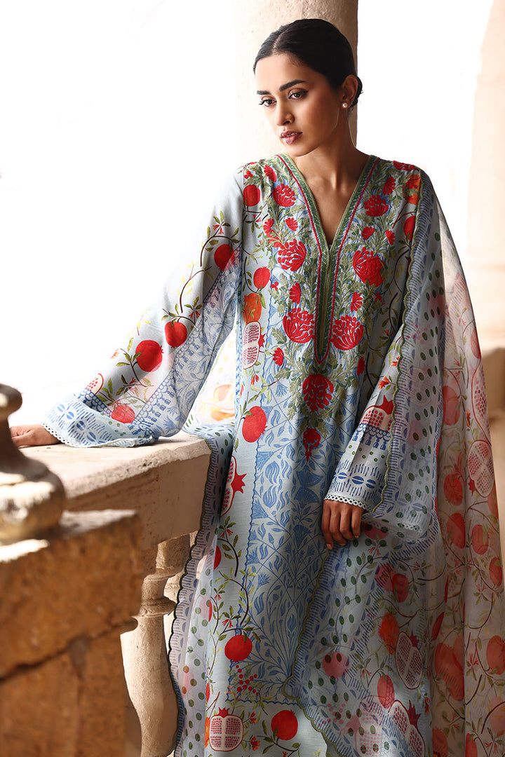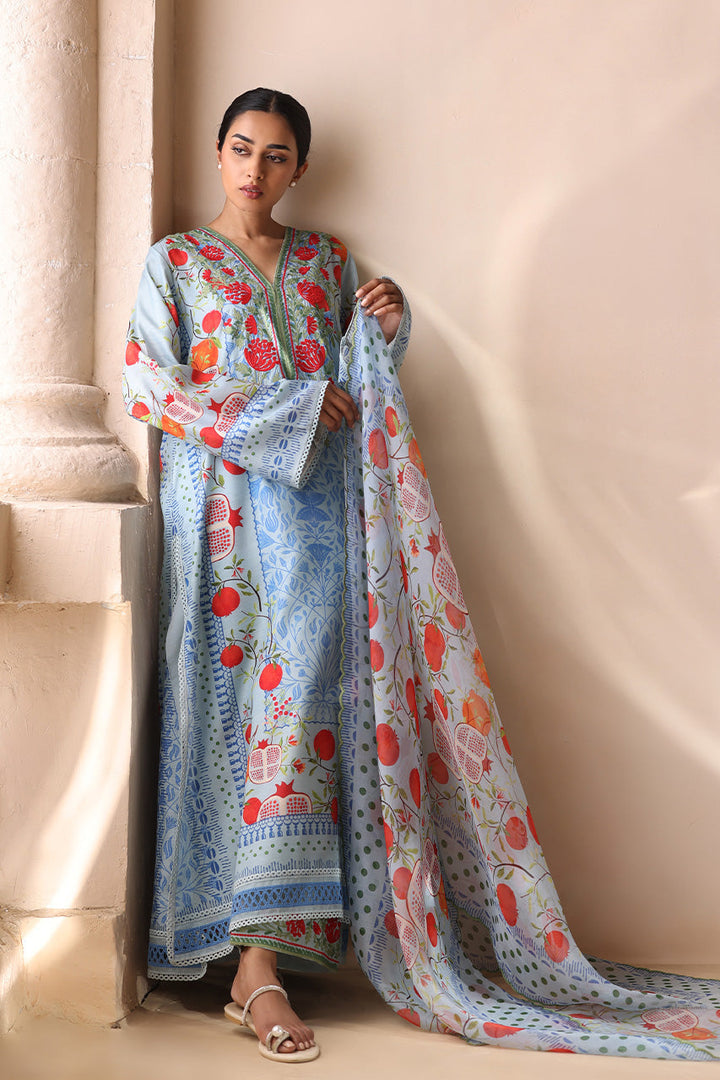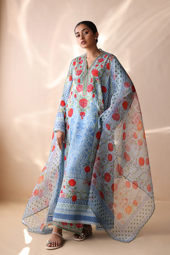 A poetic fusion of tradition and modernity, this khaddi silk ensemble in a soft ice blue hue features an a-line shirt featuring a vivid scarlet pomegranate print and aari embroidery...
