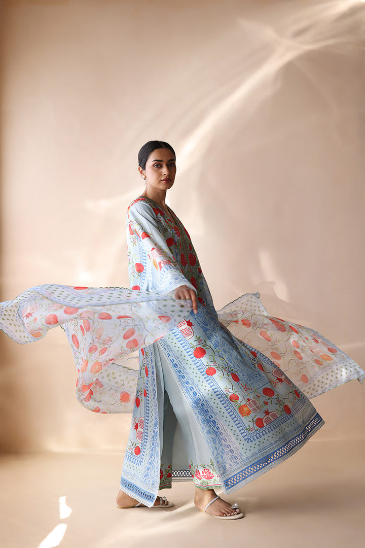A poetic fusion of tradition and modernity, this khaddi silk ensemble in a soft ice blue hue features an a-line shirt featuring a vivid scarlet pomegranate print and aari embroidery on the neckline with verdant accents. Paired with an organza dupatta adorned with a painterly print and embroidered culottes.