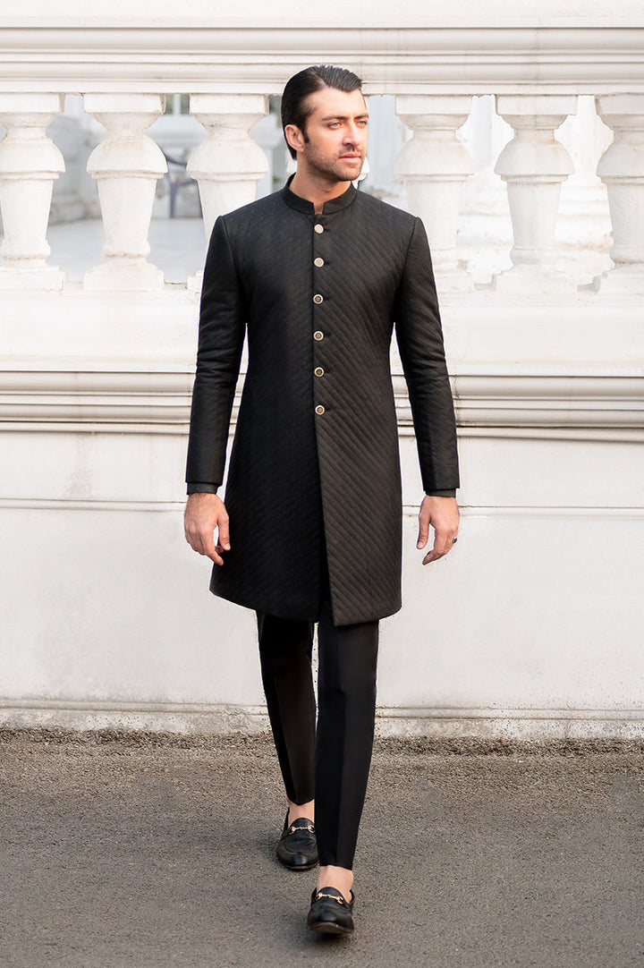 A black, silk jamawar quilted sherwani (silk plain inner included) paired with a matching, raw silk plain pajama.