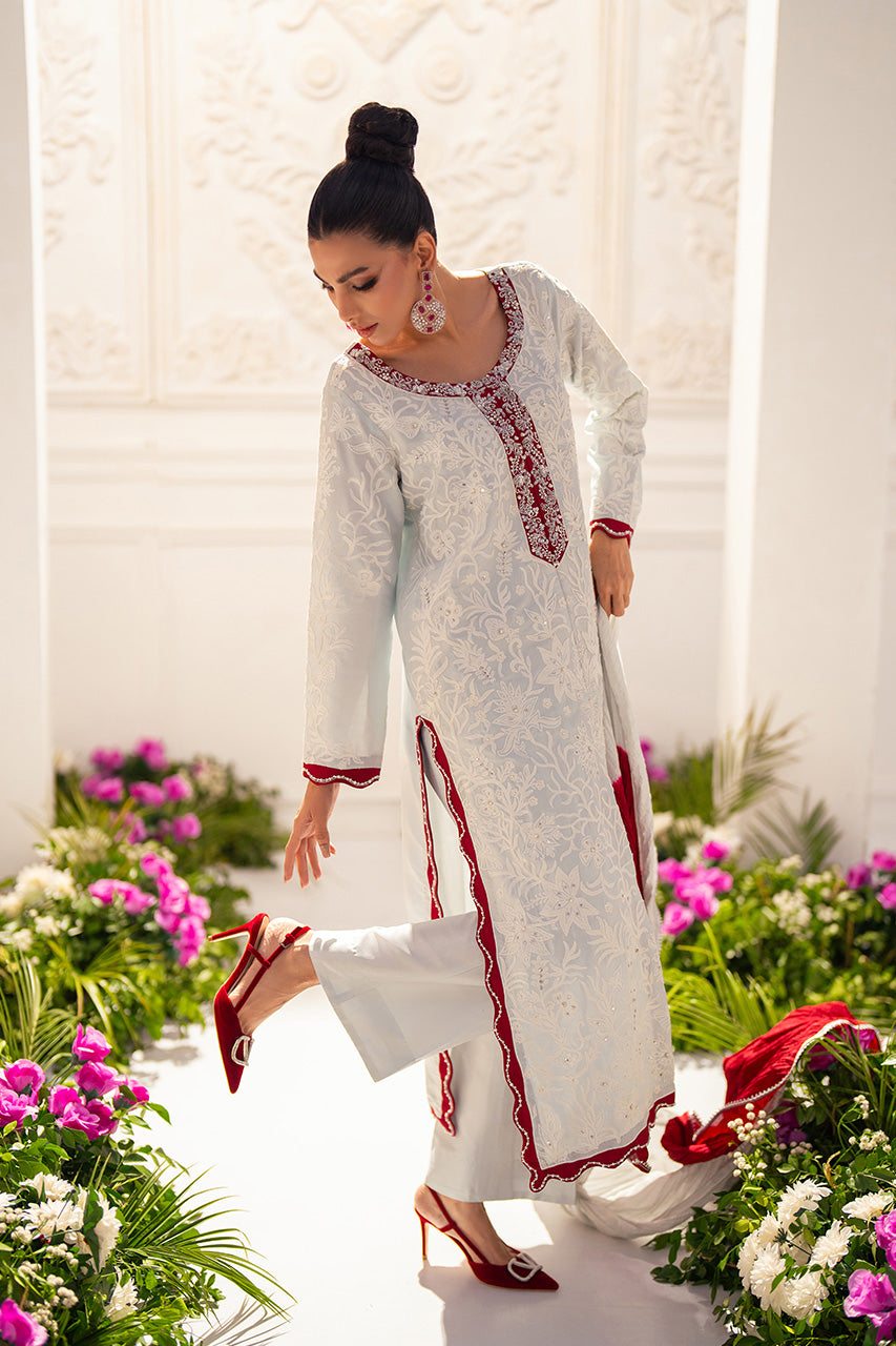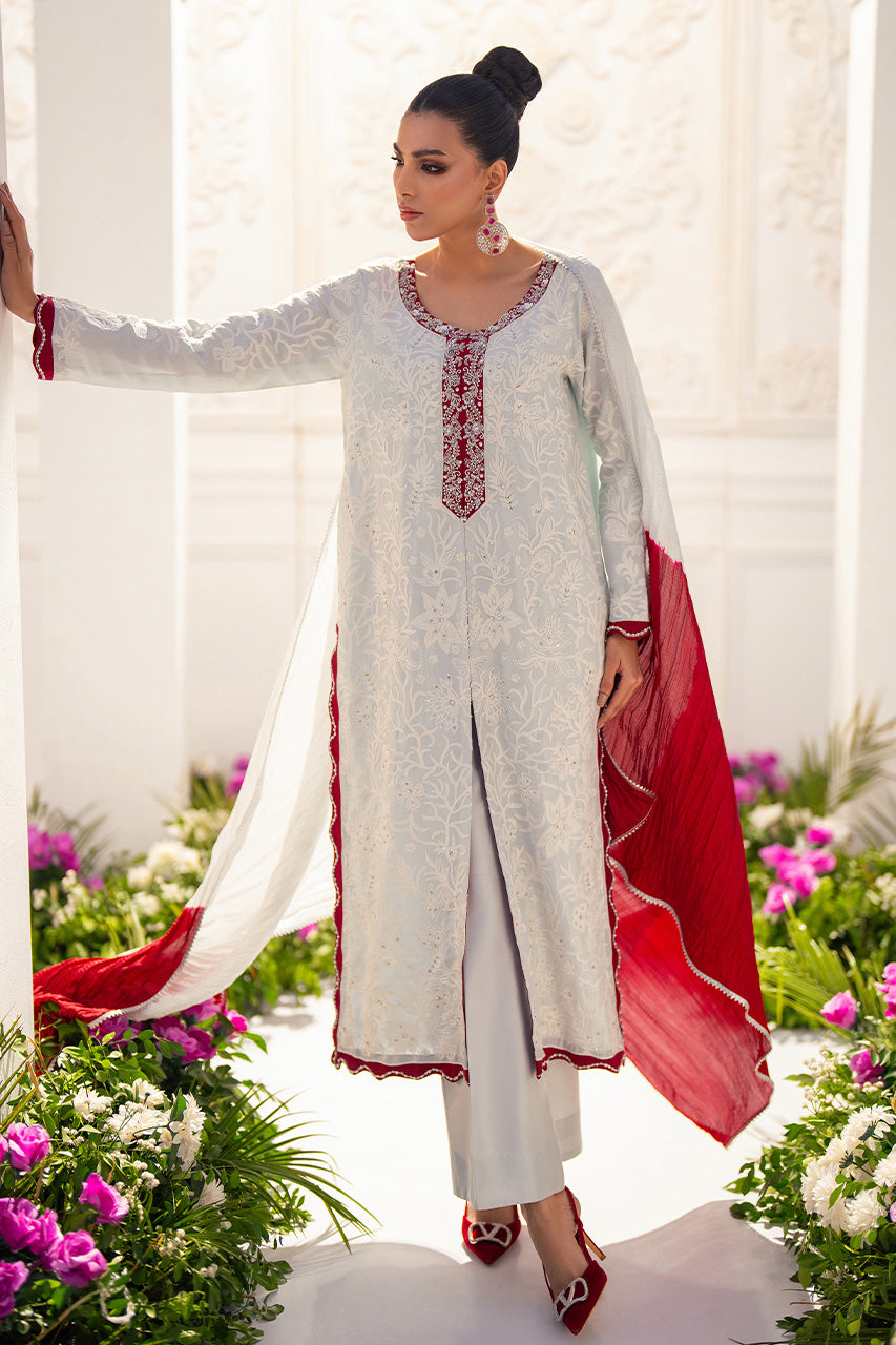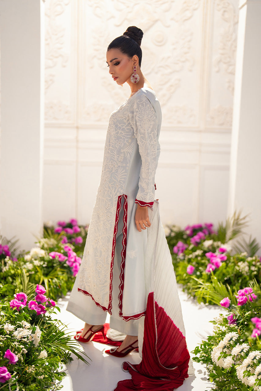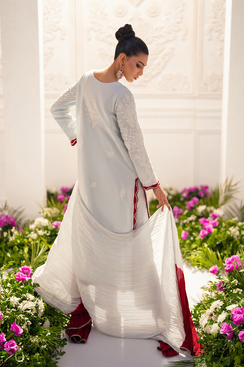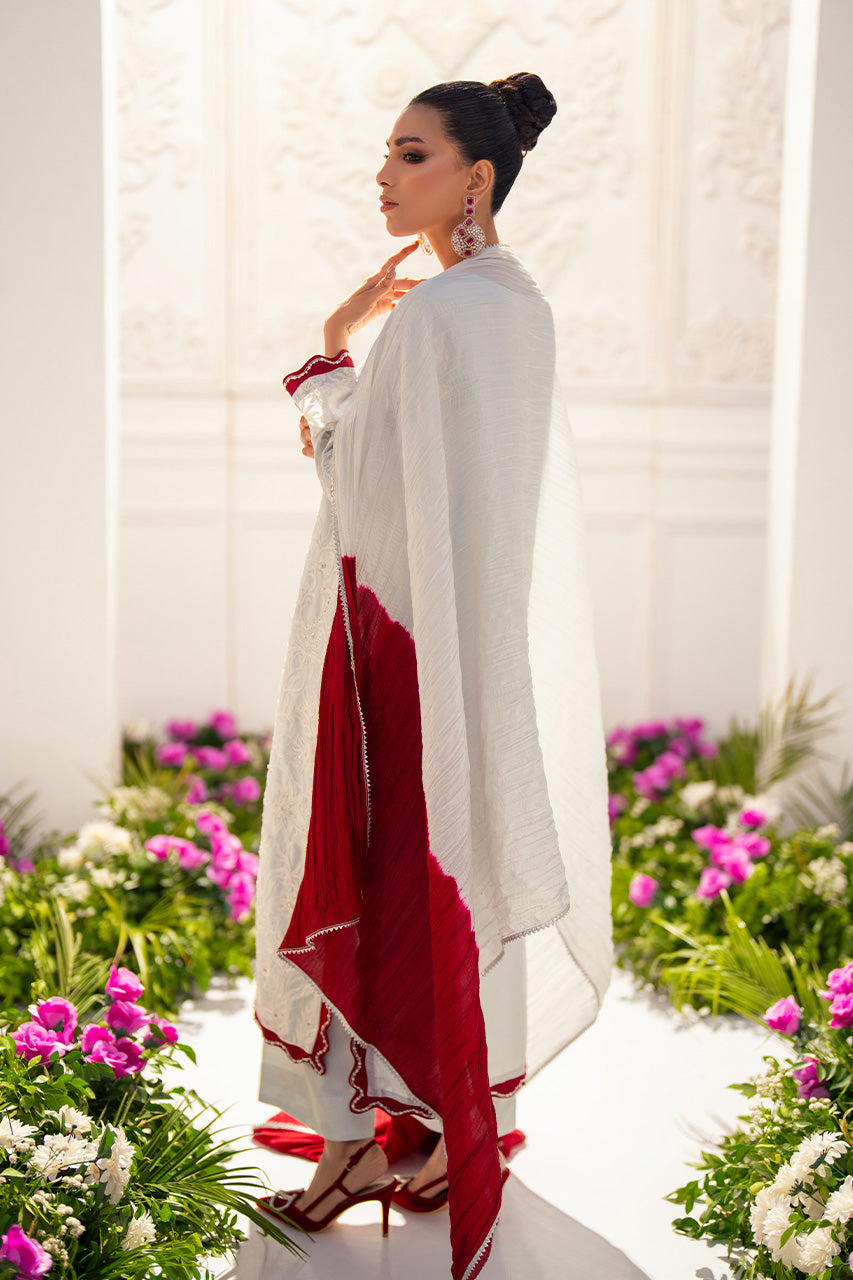 The two-tone silk dupatta in rich Maroon and soft Aasmani features a crushed texture and is embellished with stunning silver lace on all four sides.