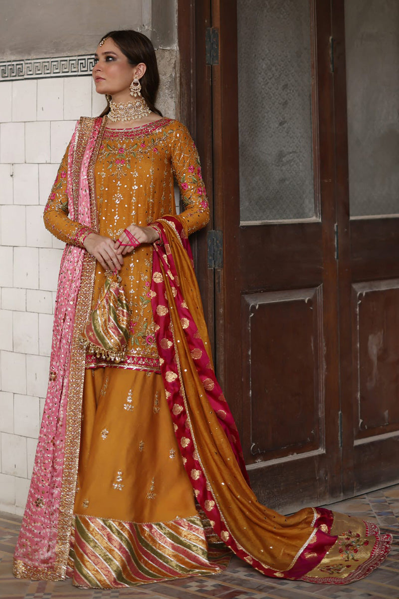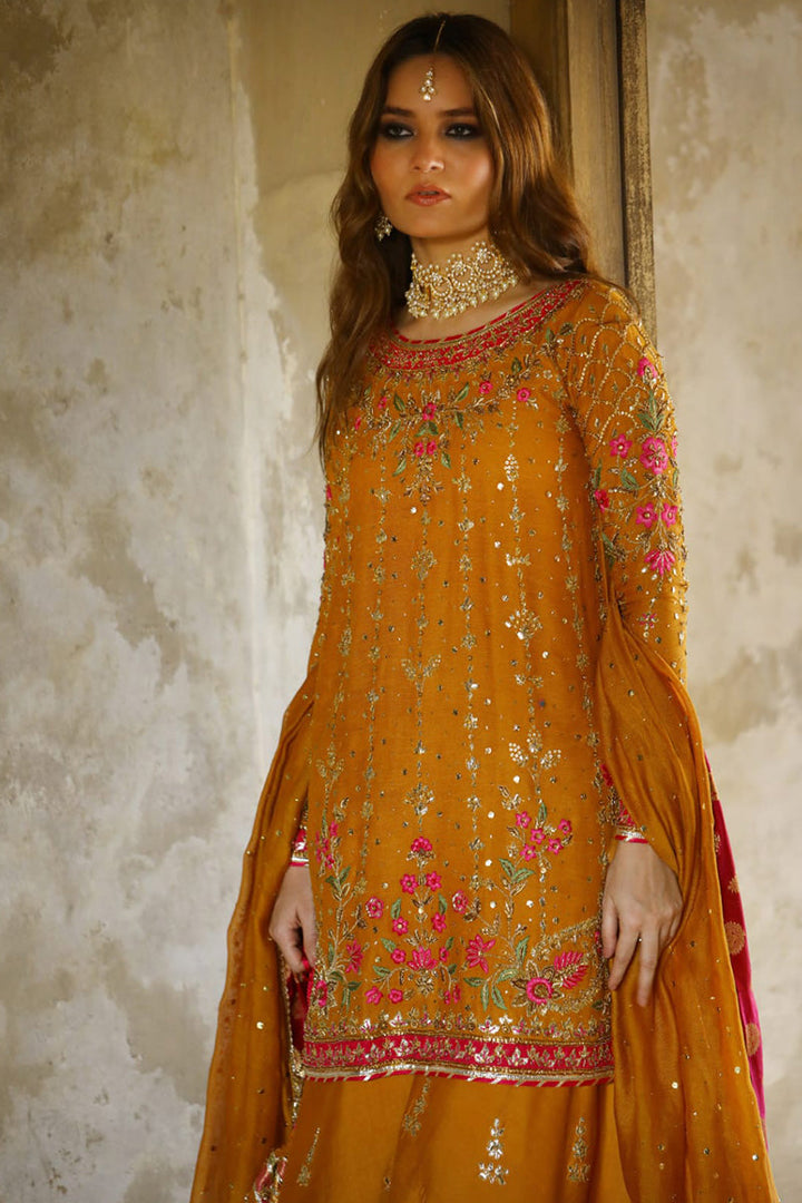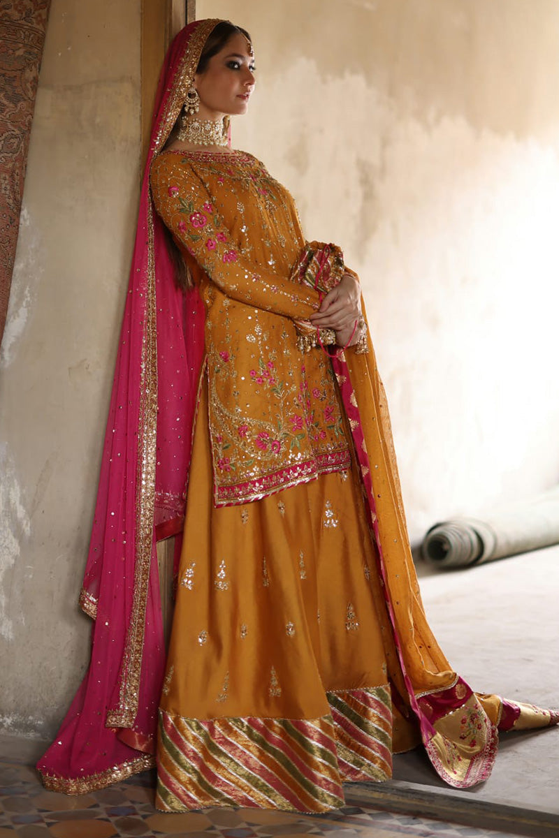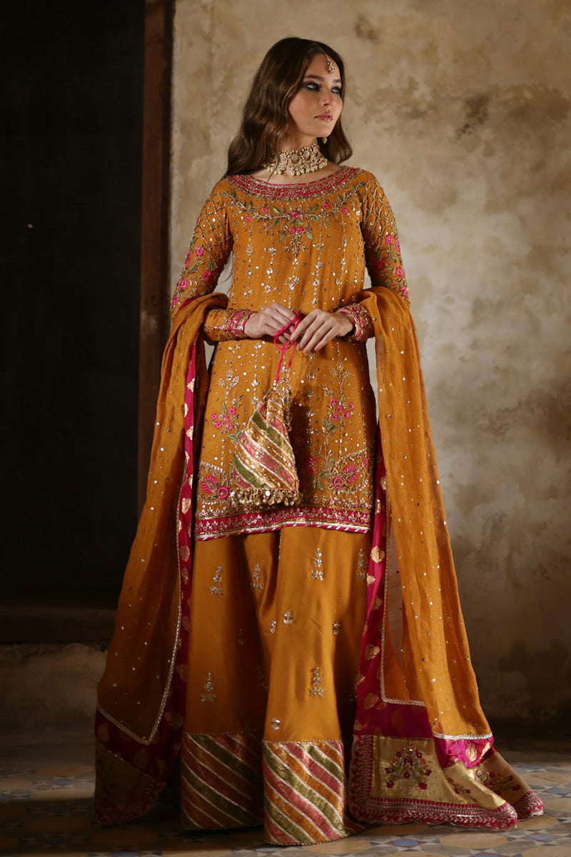 Stun in this orange and pink look! The short shirt features delicate floral embroidery in pink and gold. The outfit features additional floral motifs on the pants, which are anchored by a bold pink and orange dupatta. A pink dupatta with light chhan and gold border and orange bag complete the outfit.
