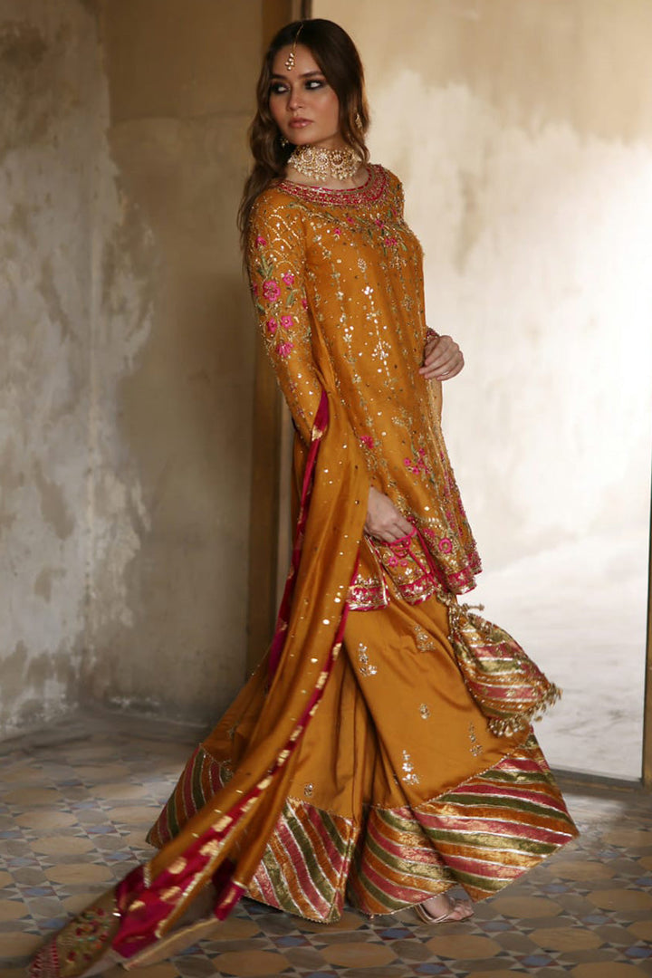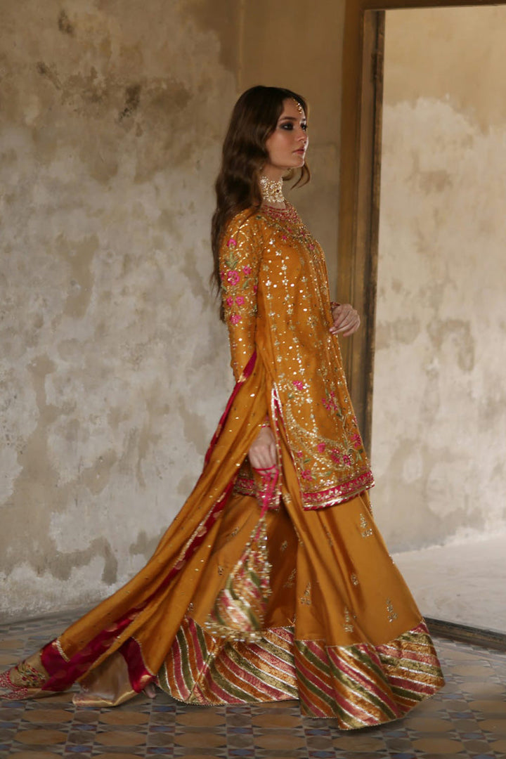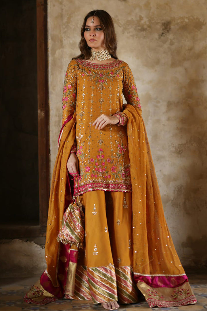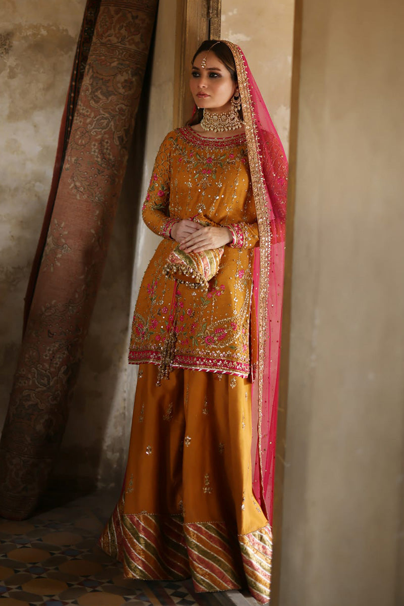 Stun in this orange and pink look! The short shirt features delicate floral embroidery in pink and gold. The outfit features additional floral motifs on the pants, which are anchored by a bold pink and orange dupatta. A pink dupatta with light chhan and gold border and orange bag complete the outfit.