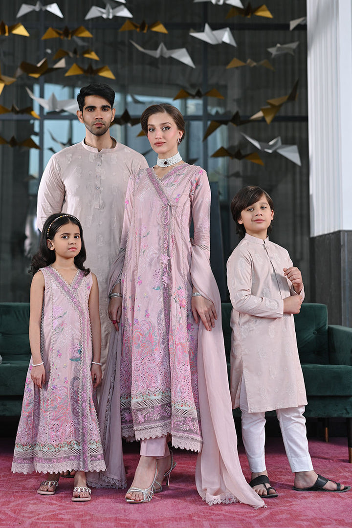A soft dusty pink kurta with delicate self-embroidery, paired with crisp white pants.