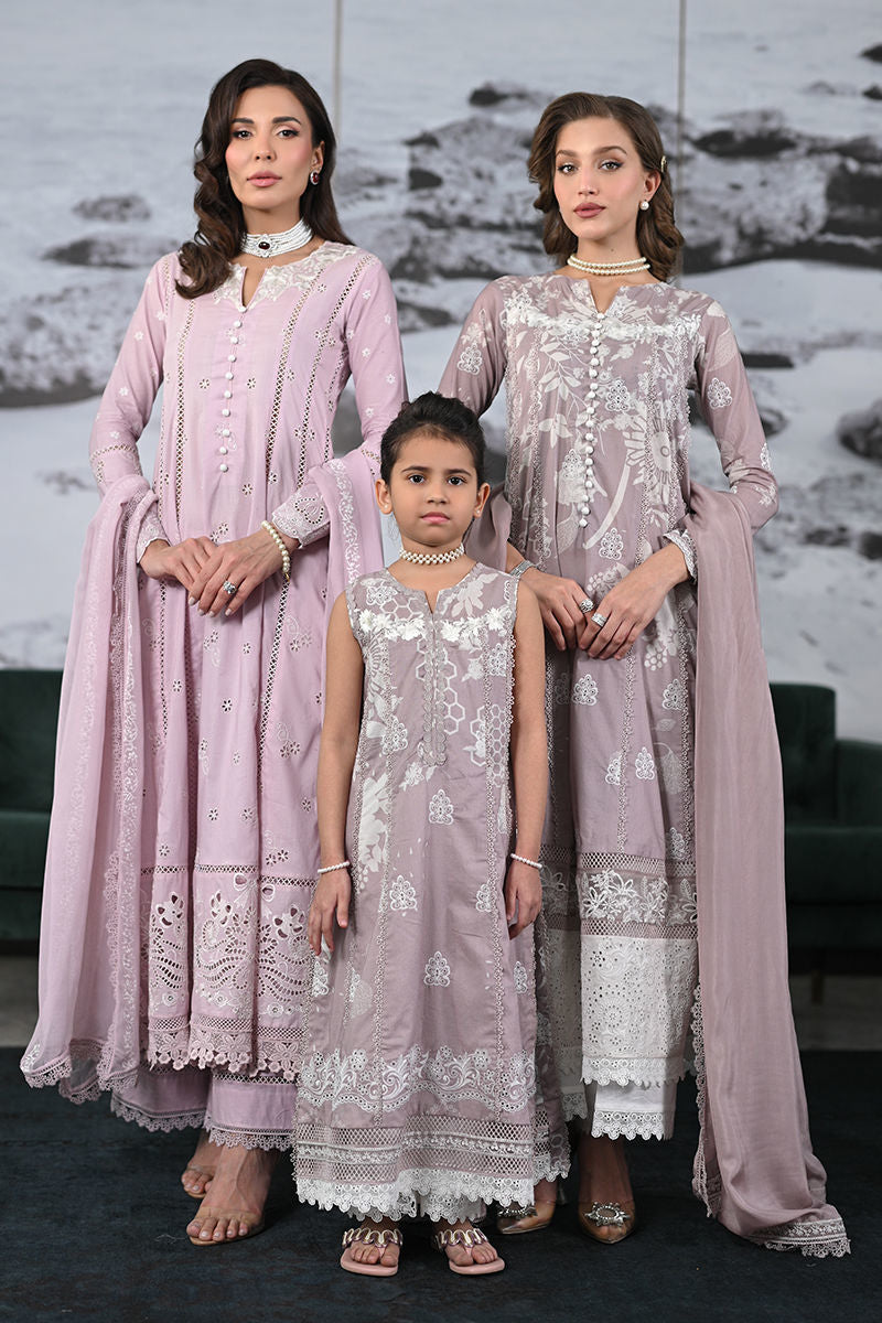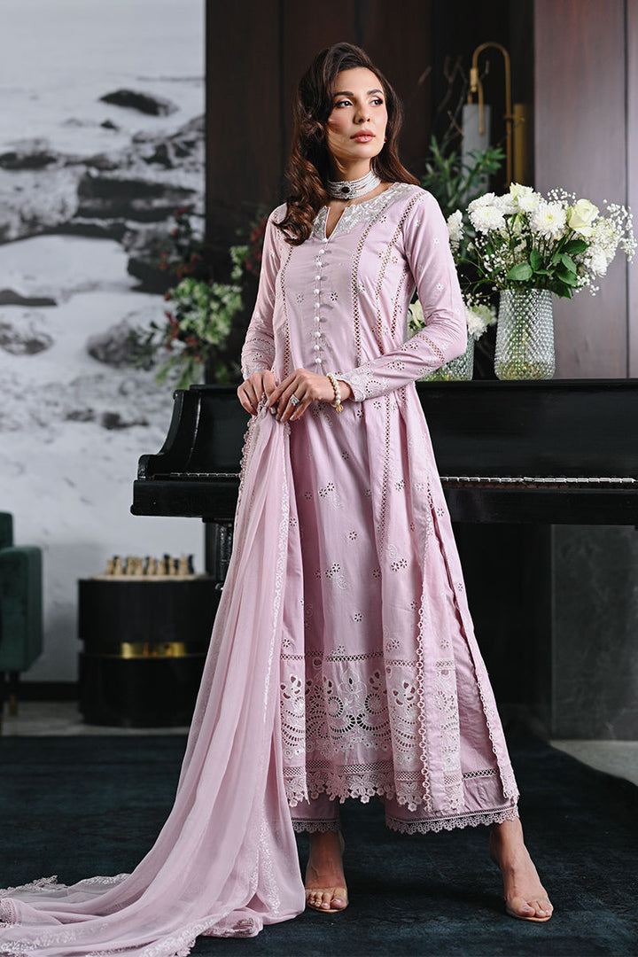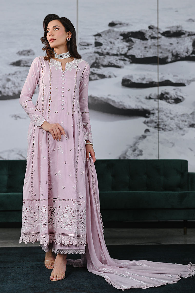 A delicate dusty pink A-line shirt, featuring self-colored lace and fitted sleeves with exquisite lace detailing. Paired with a coordinating izaar, elegantly finished with lace borders, and a printed chiffon dupatta with soft white accents.