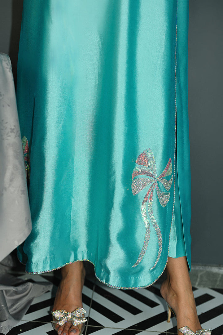 This captivating turquoise sheesha silk shirt and pant set features a unique round hem and striking halter sleeve cuts, offering a blend of modern design and traditional elegance. The shirt is intricately adorned with Swarovski crystals, adding a touch of sparkle and luxury to the fabric. Hand-embellished bows grace the hem and sleeves, creating a delicate, feminine touch that enhances the overall charm of the piece. Paired with this stunning shirt is a soft organza duppatta, beautifully embellished with matching Swarovski crystal bows, tying the look together with grace and sophistication. This ensemble is perfect for someone looking to make a statement with a perfect balance of glamour and refinement. Duppata is an add on. Shirt maximum length 55