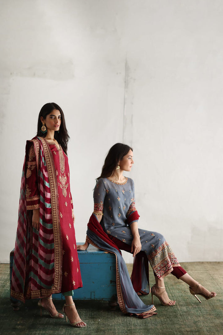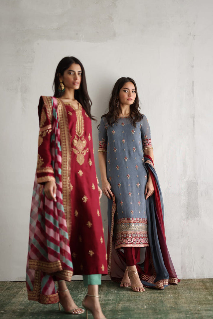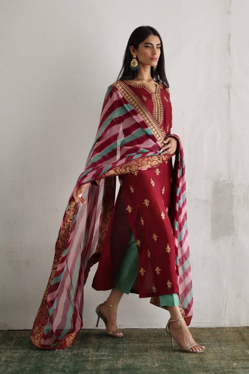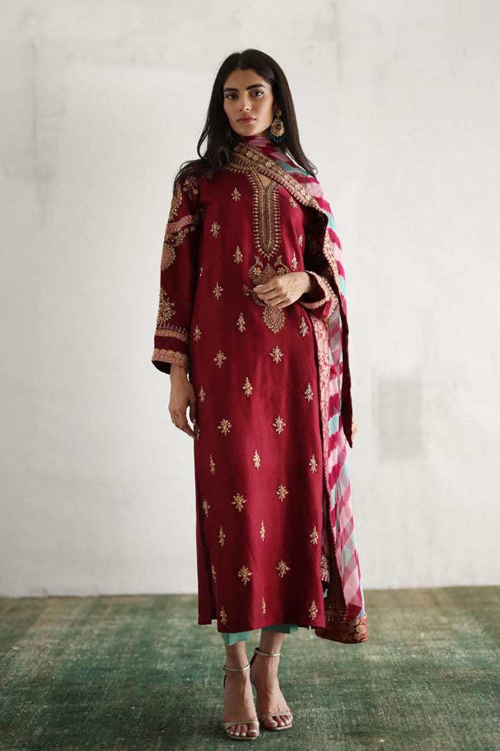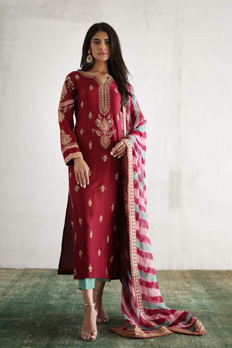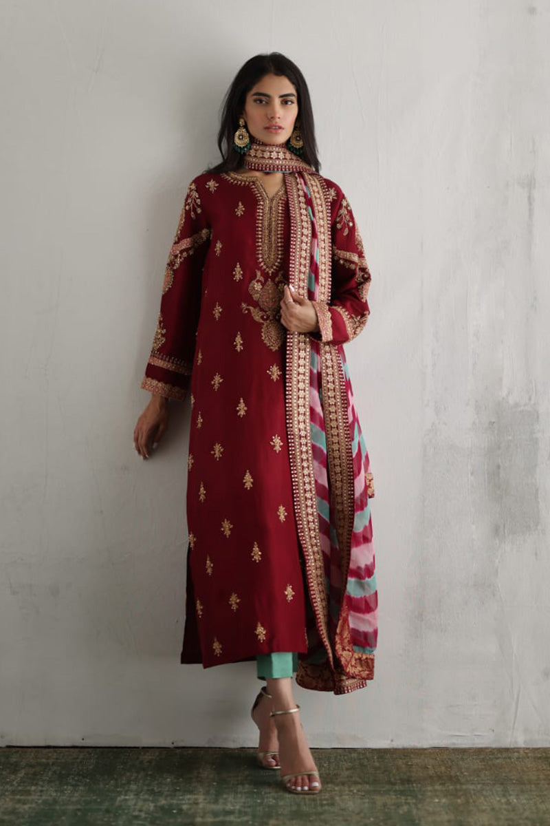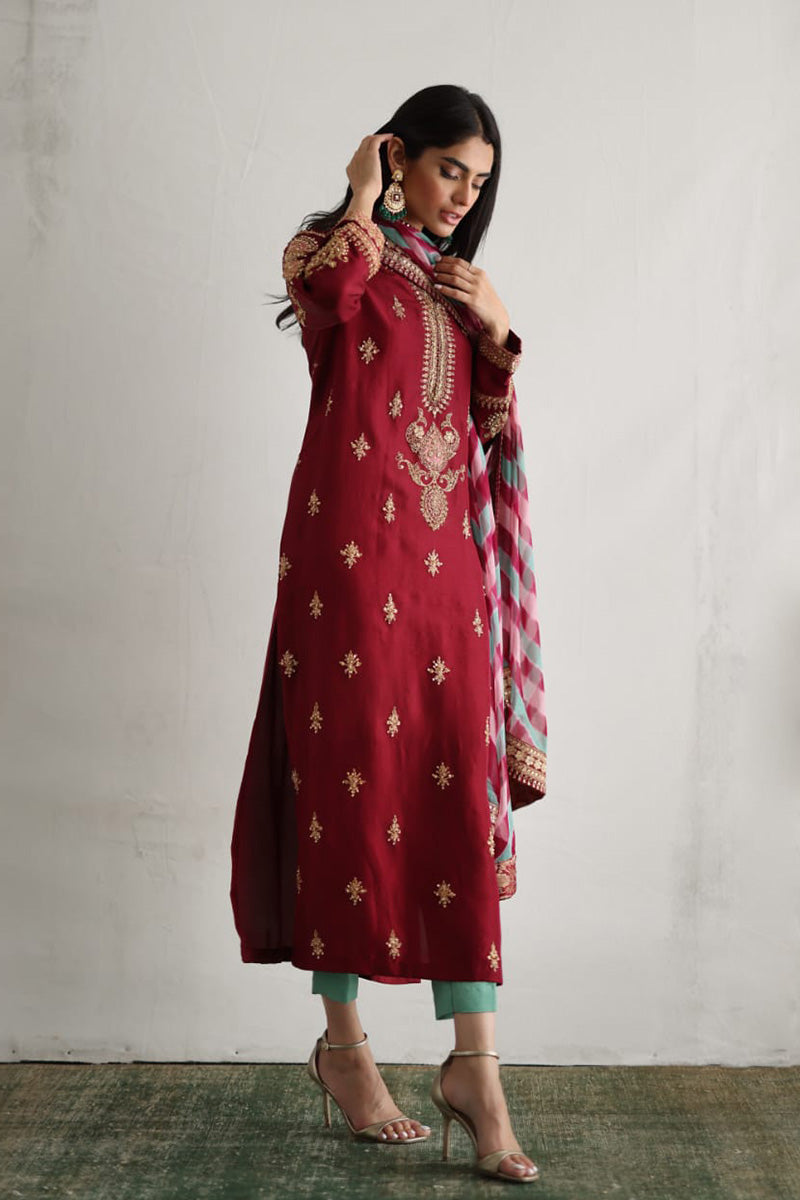 A classic marori Mina Hasan design, this sea green piece is sure to stand out with its stark contrasts and stunning dupatta!